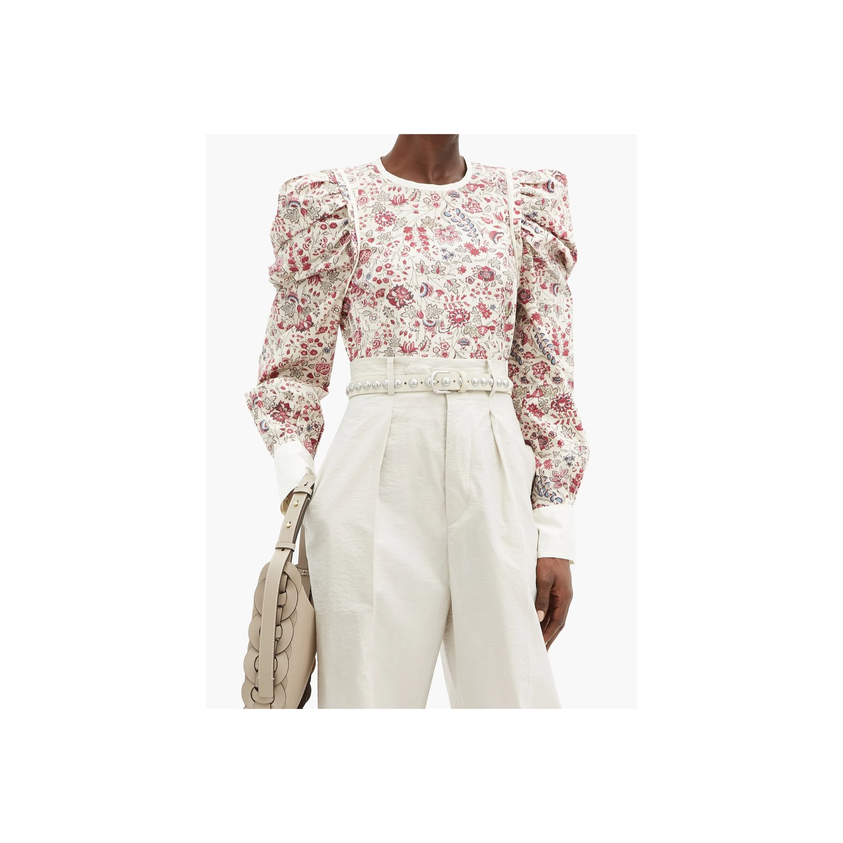 フォークロア調の優しいフローラルプリントの「イザベル マラン(ISABEL MARANT)」のトップス。ホワイトのカフスやパイピングもポイントに。