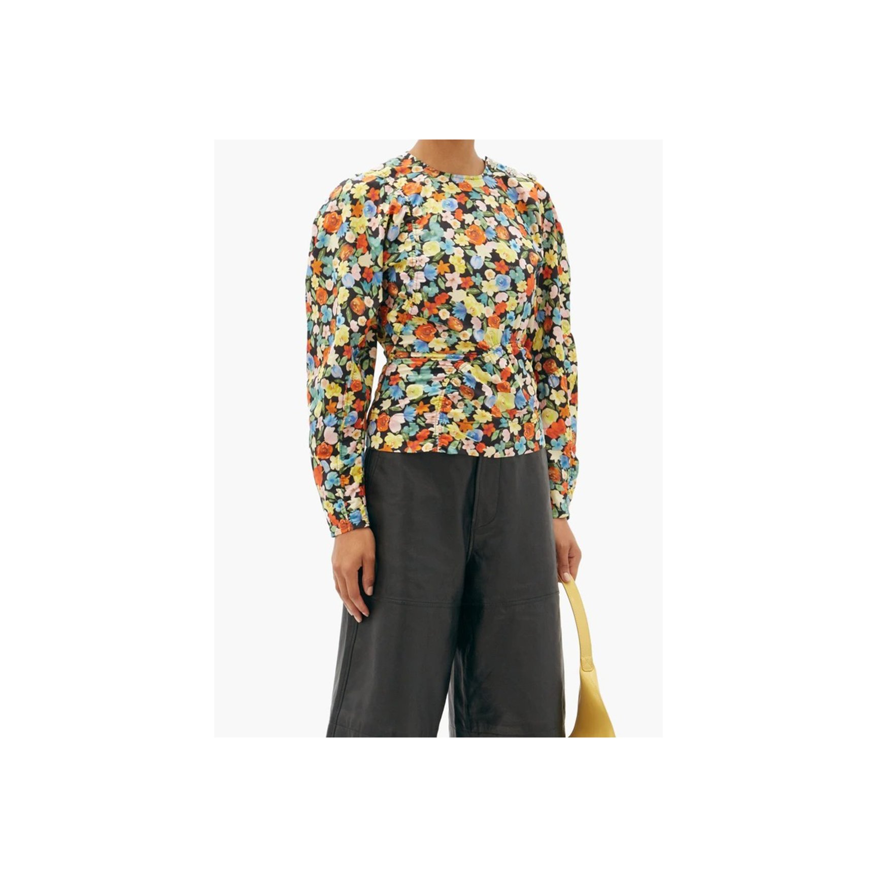 見ているだけで元気を貰えそうな「ガニー(GANNI)」のフローラル柄トップス。ブラックベースにビビッドなカラーが映えます。パフスリーブのボリューム感もおだやかなので、意外と着こなしやすい一枚です。