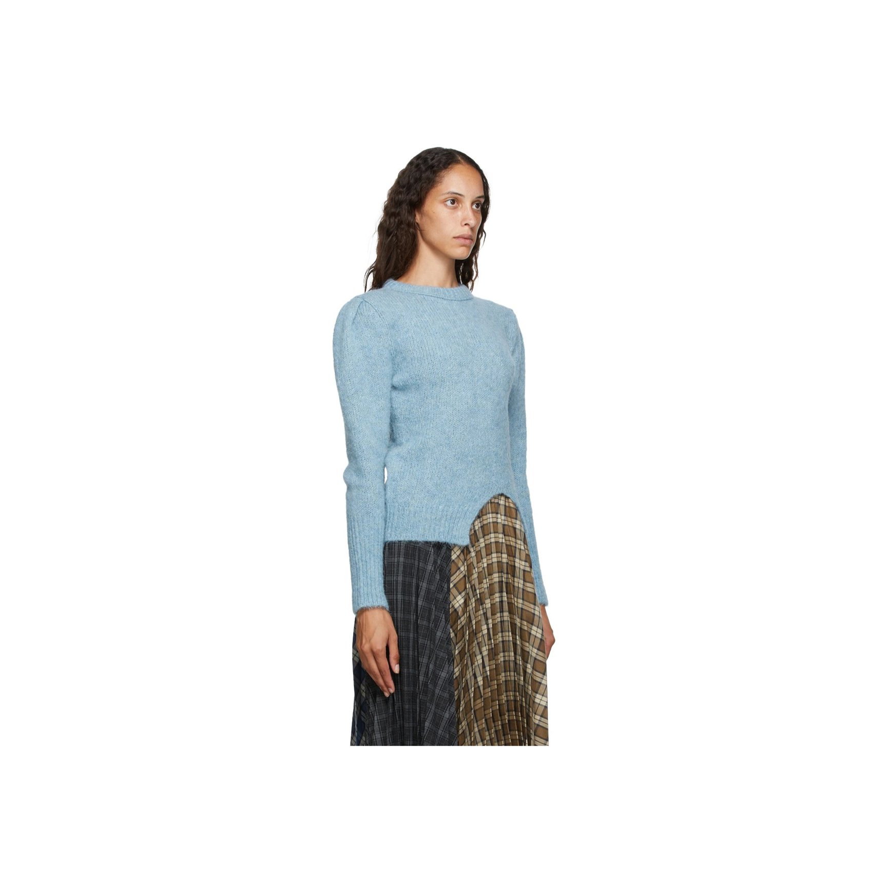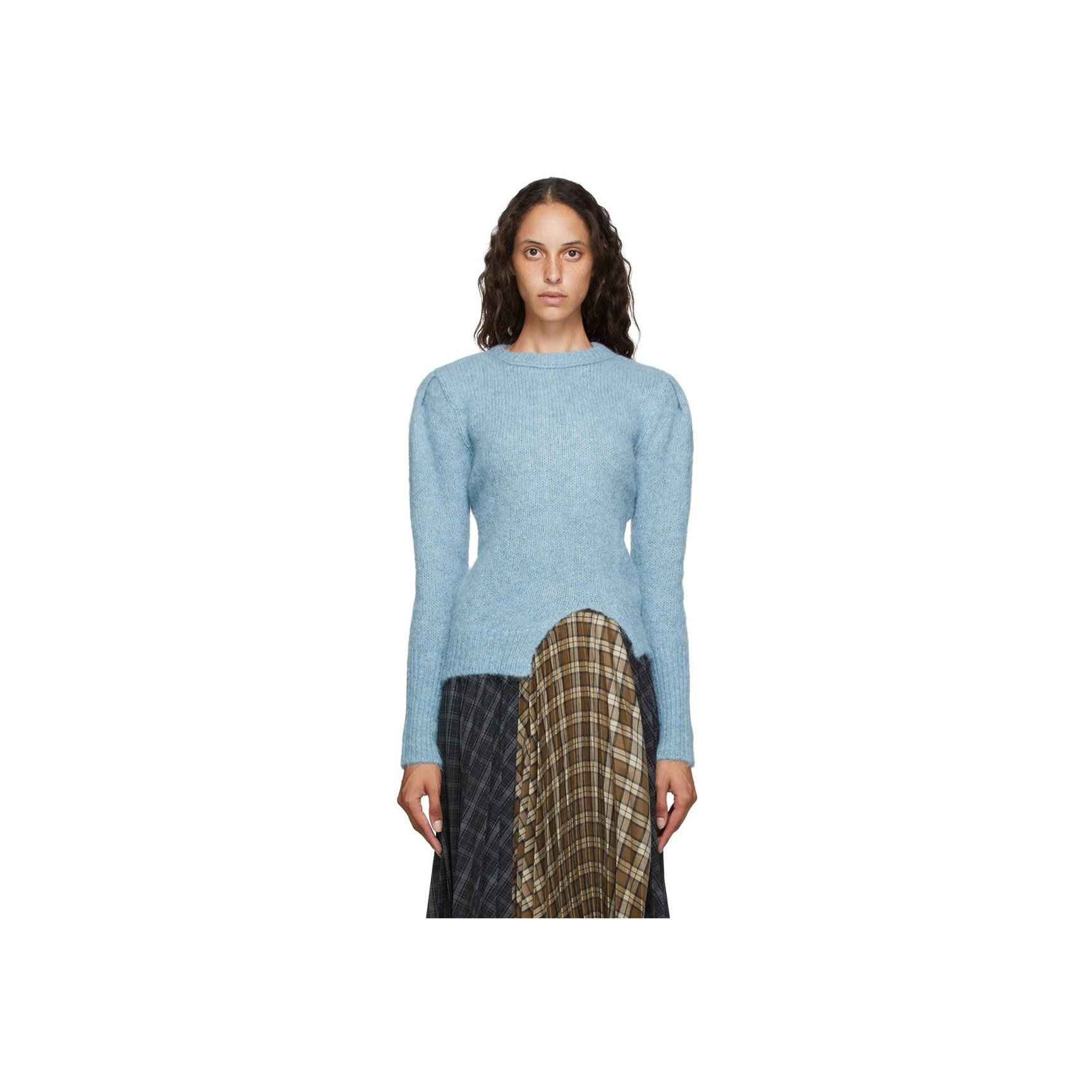 ソウル発「アンダーソン ベル(Andersson Bell )」のパウダーブルーのニットです。ヘムラインに加え、バックもケーブル編みパターンがミックスされたアシンメトリーデザインになっています。アルパカとウールの混紡素材。