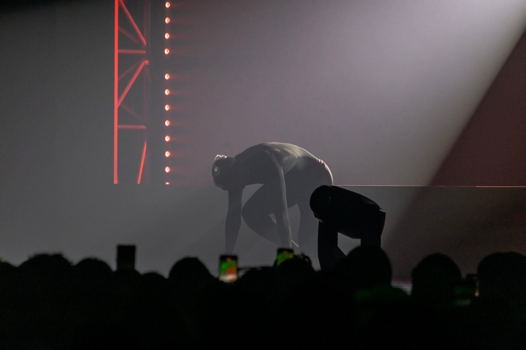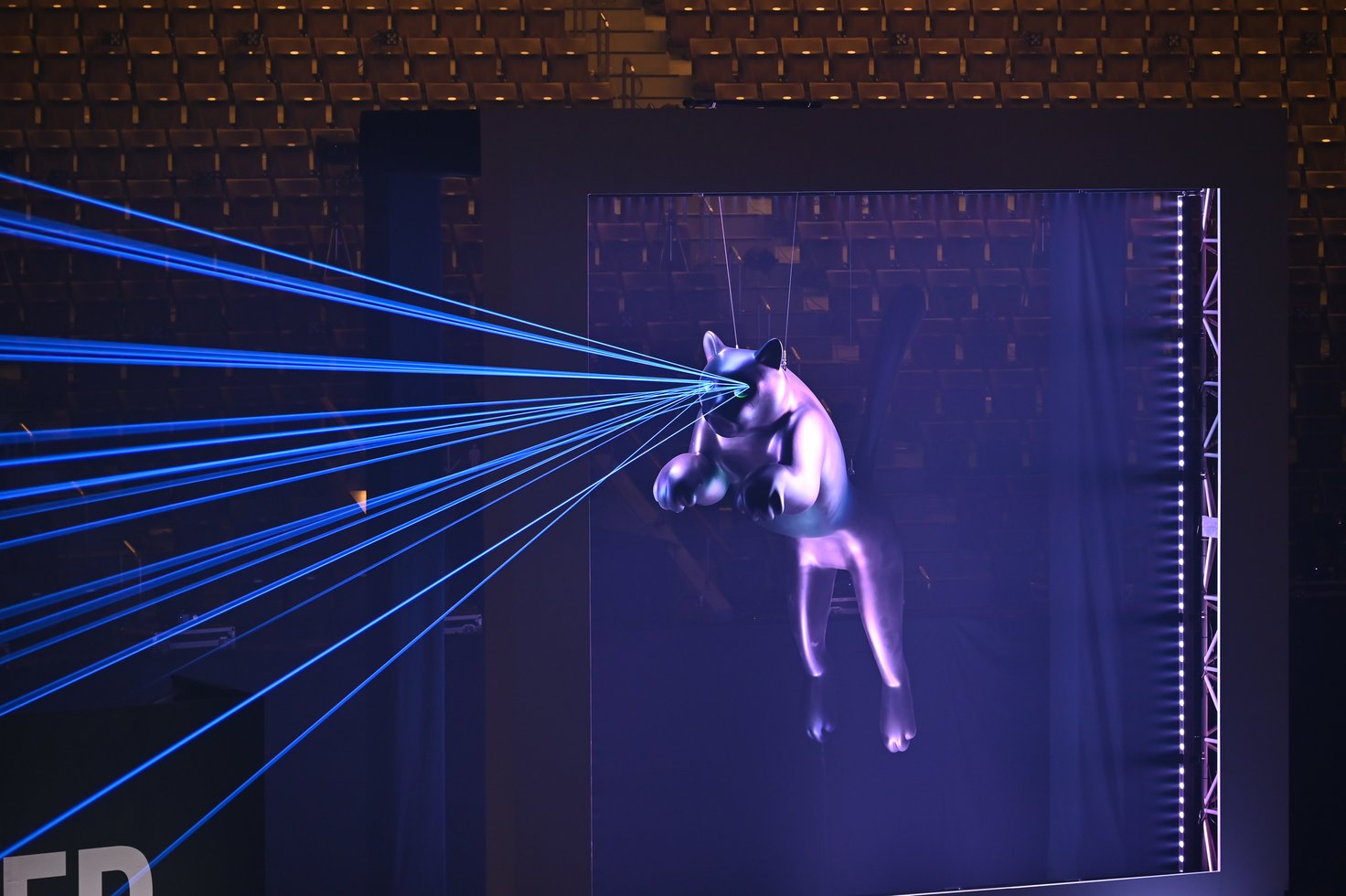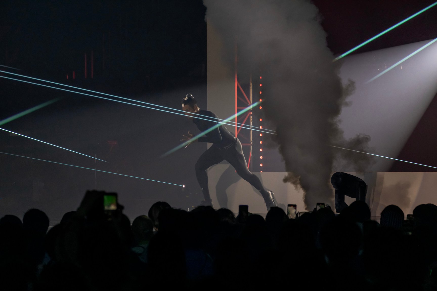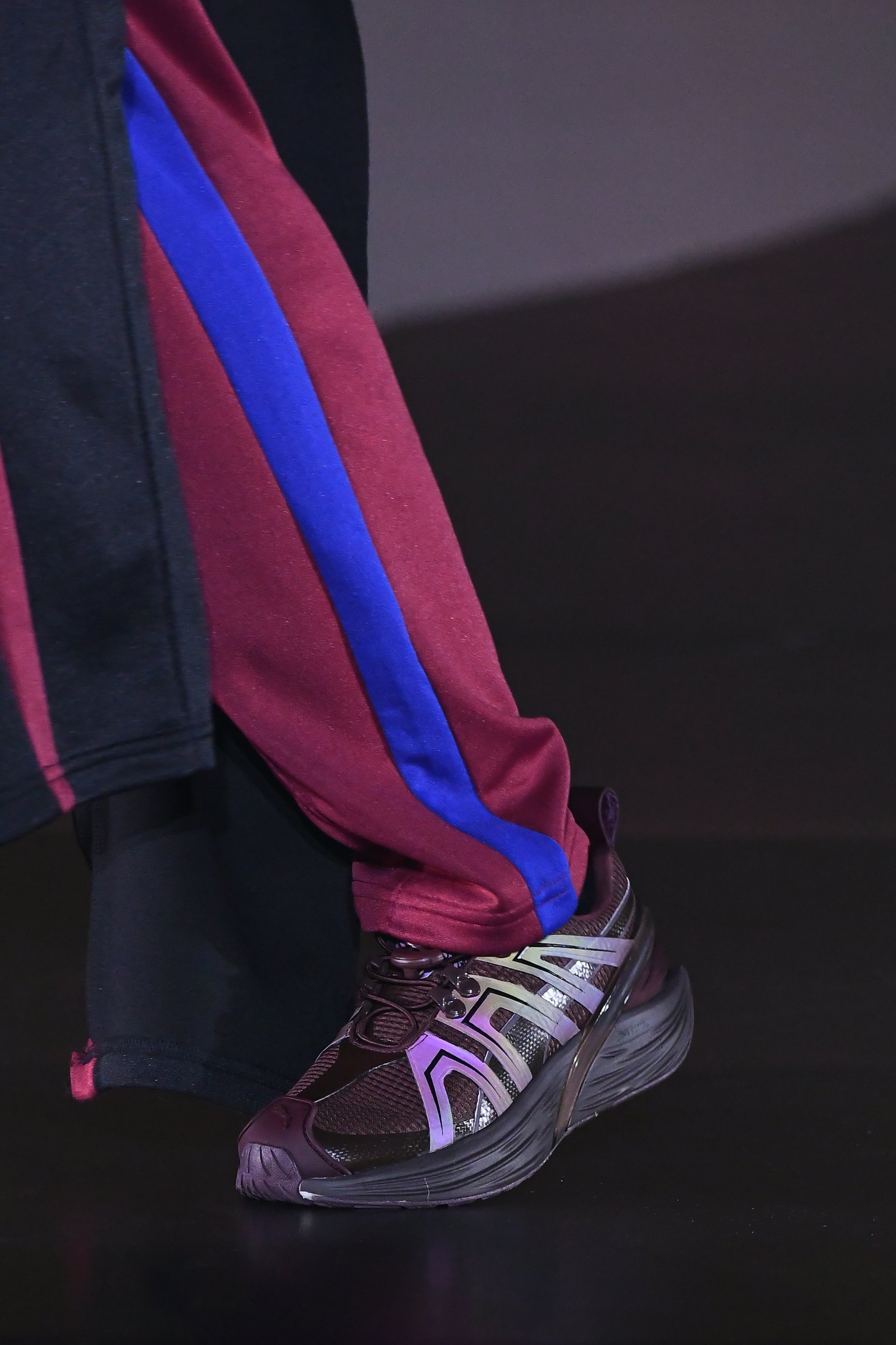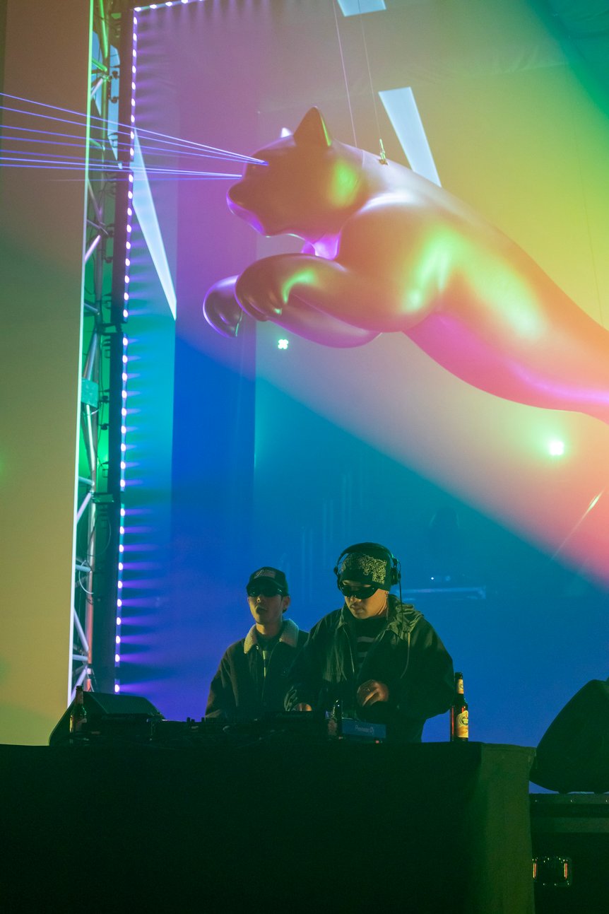 ショーの会場にはフォームストライプのデザインがあしらわれたランウェイを設け、ランウェイの奥には巨大なプーマロゴのピューマ像を設置。ピューマ像の目をはじめ、多くの箇所からレーザー光線を照射する演出で会場の高揚感を高めた。
