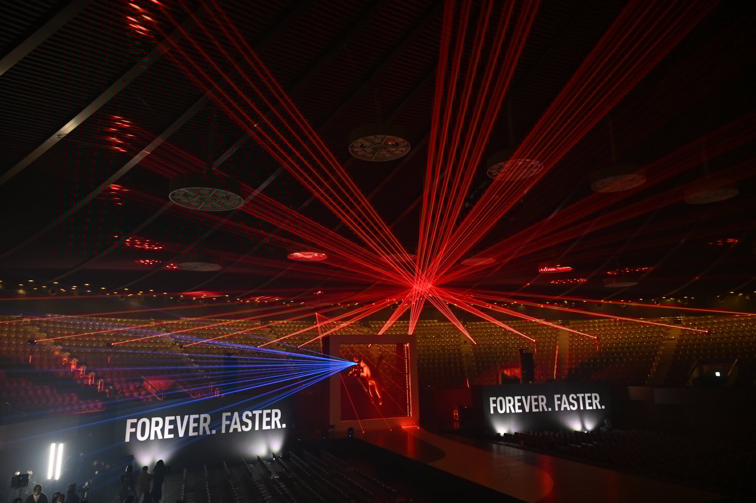 来場者はランウェイを囲むように着席。ランウェイの両端にはグローバルキャンペーンの「Forever.Faster.」の文字を掲示した。