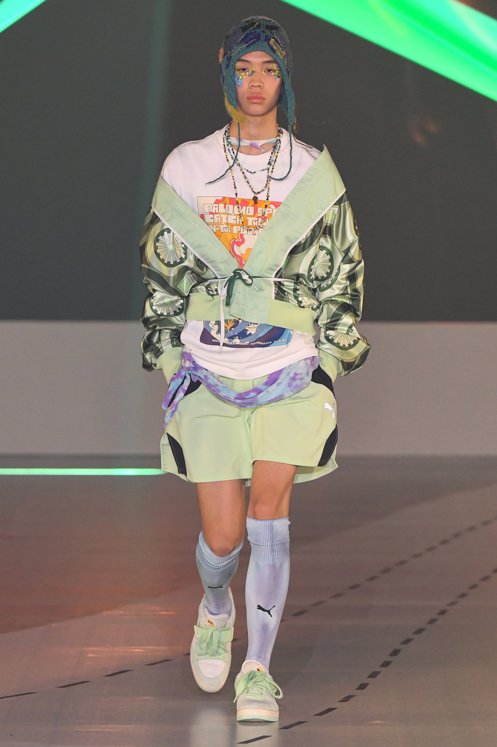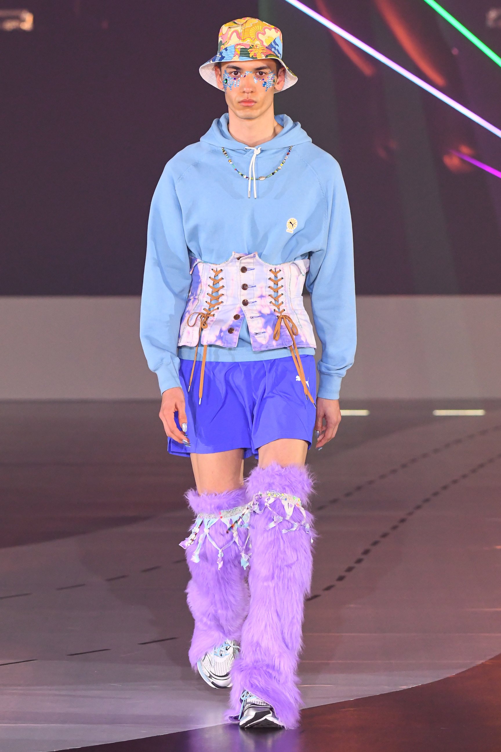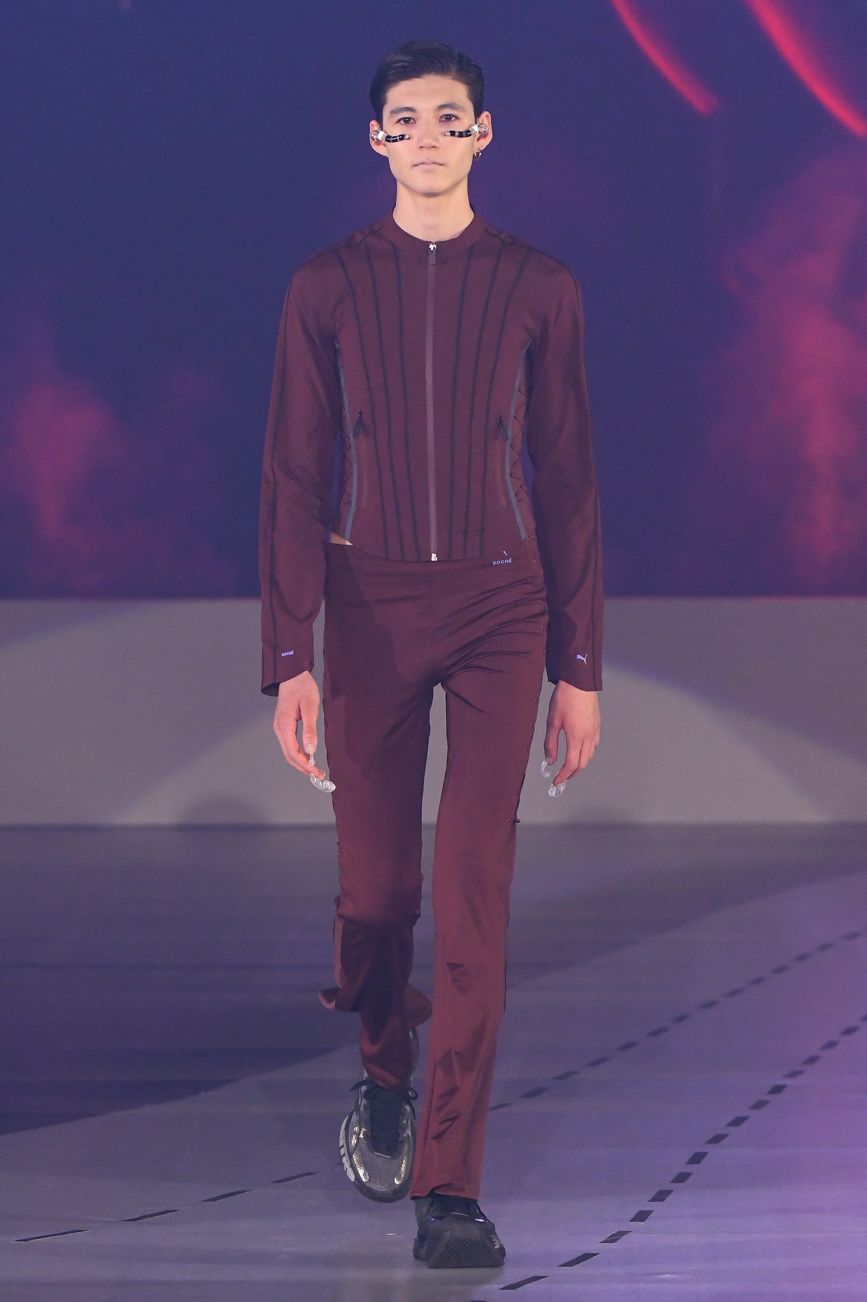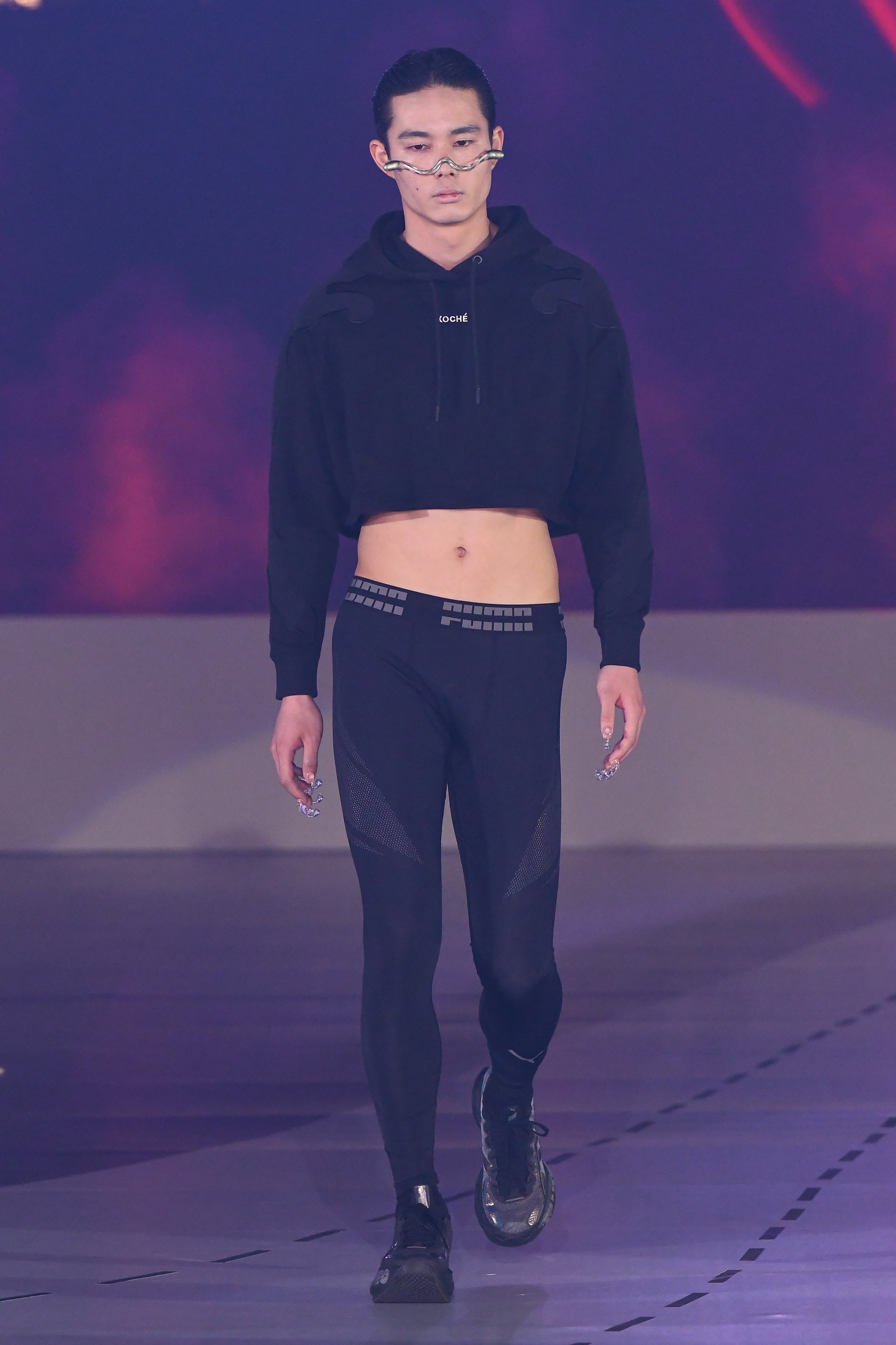 プーマの未来を想起させるスタイリングが特徴のFUTUREは、陸上のサニブラウン・ハキーム選手がクラウチングスタートからランウェイを駆け抜ける演出でスタート。コシェとコラボしたブラトップやショーツをはじめ、ウィンドブレイカー、フーディーなどミニマルでスポーティーなアイテムを中心に構成し、ウィメンズのアイテムをメンズに着せることでタイトシルエットにし、ボディスーツやロボットをイメージしたルックが登場した。また、アーティストのTOMOYA NAKAGAWAが手掛けた宇宙人やアメーバをイメージしたという象徴的なヘッドピースとネイルで、フューリャリスティックな雰囲気をさらに演出。ショーのBGMは、世界的人気を誇る数々のアーティストのプロデューサーとして活躍するWondaGurlが務めた。