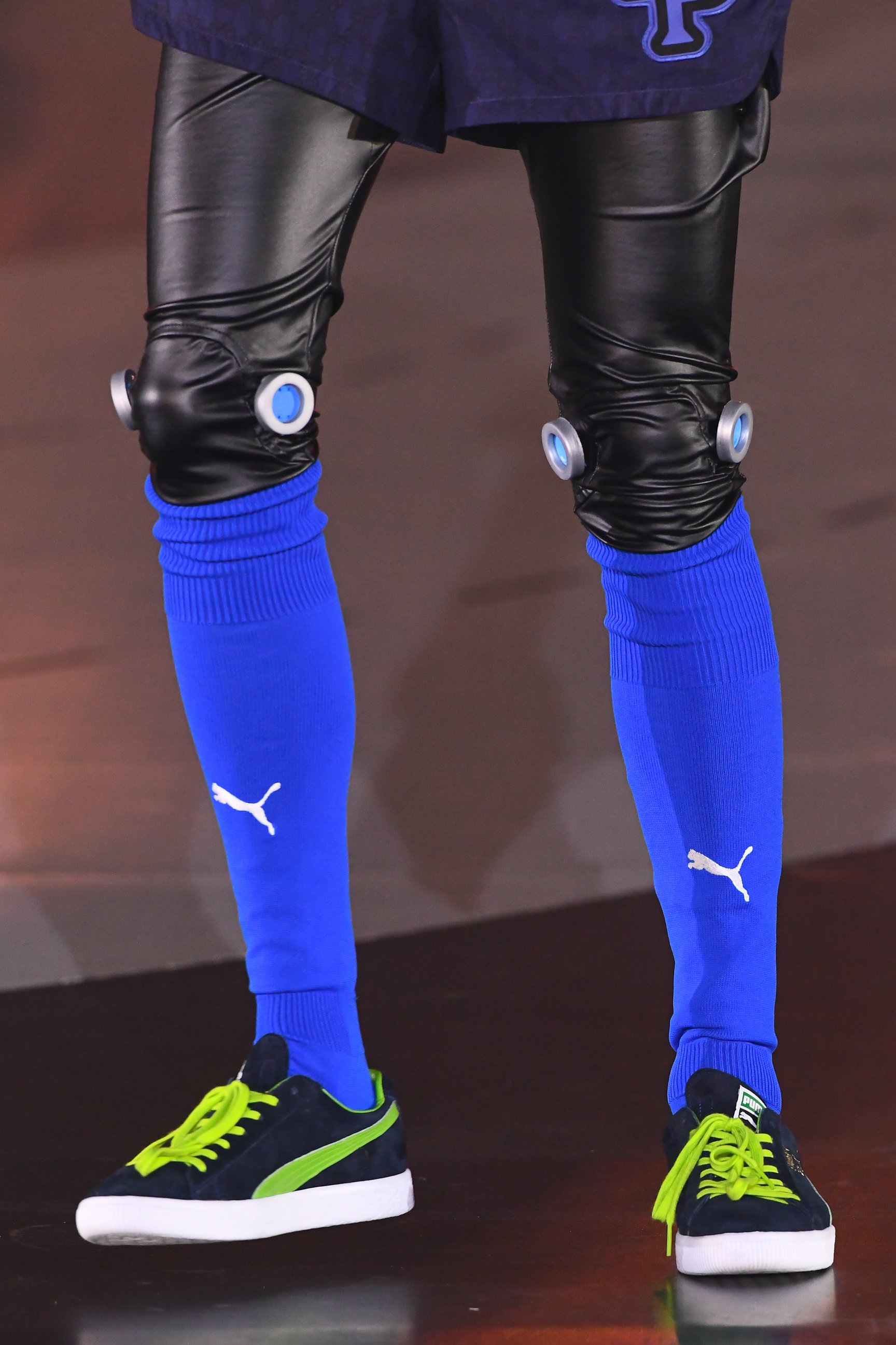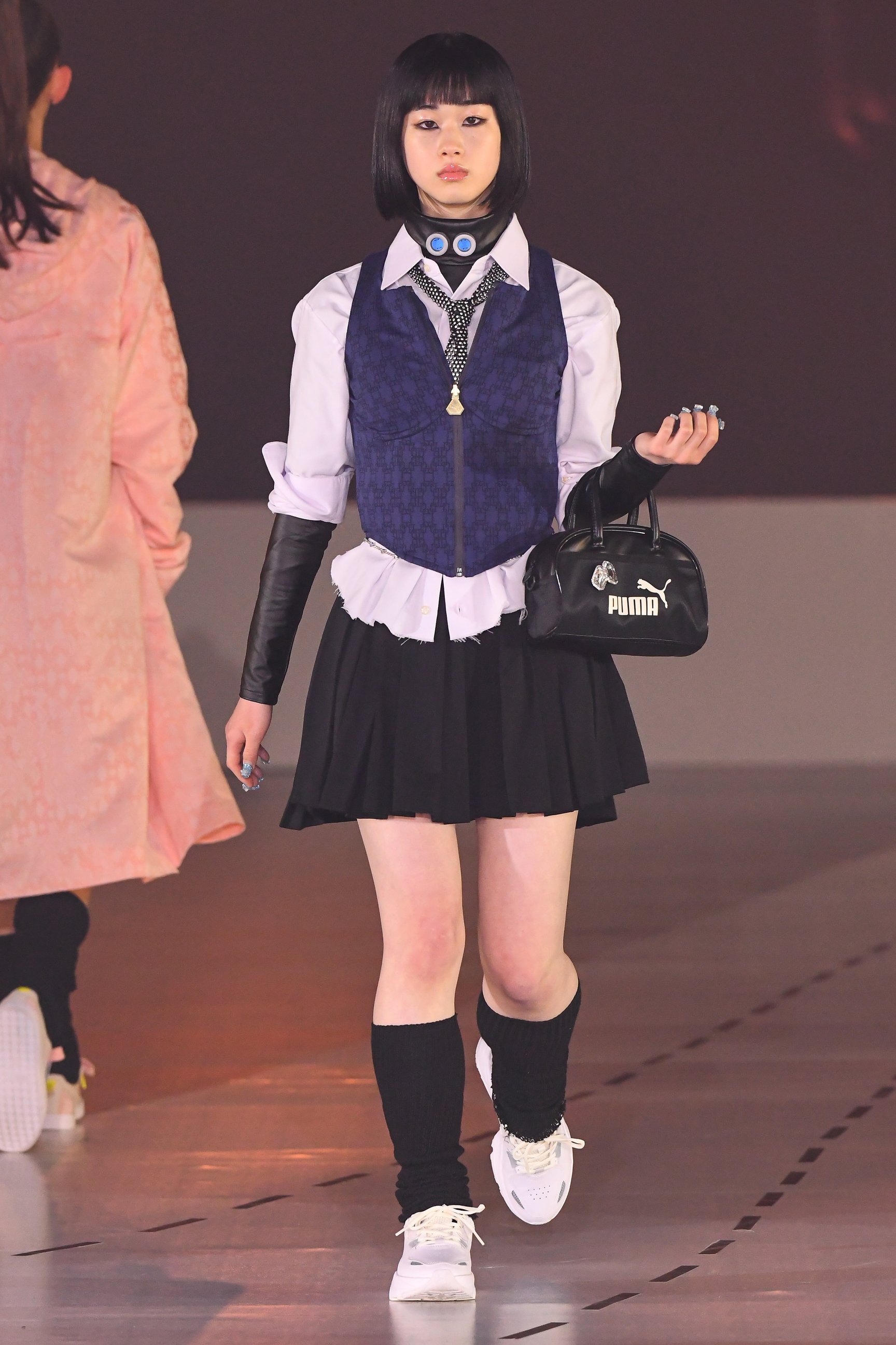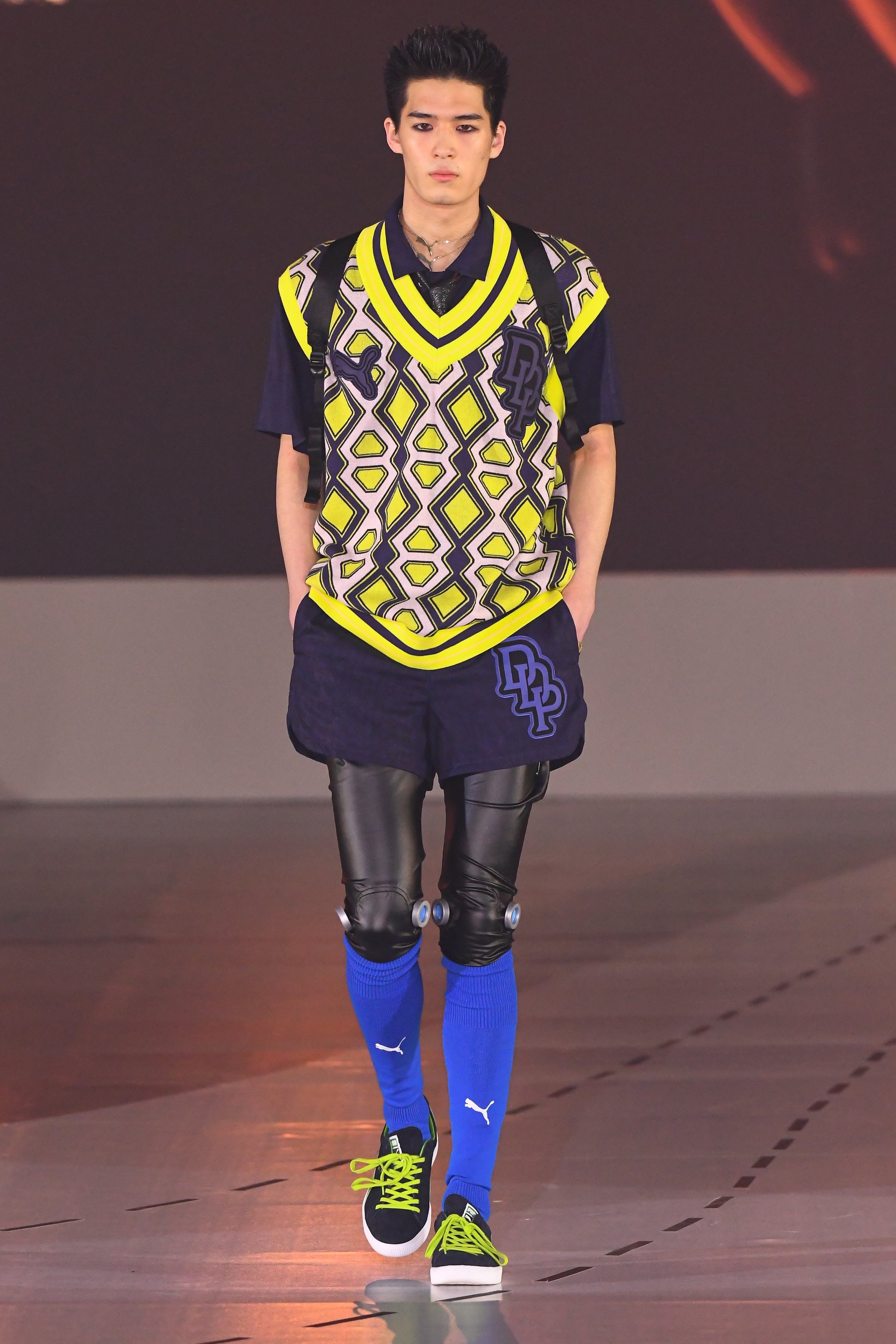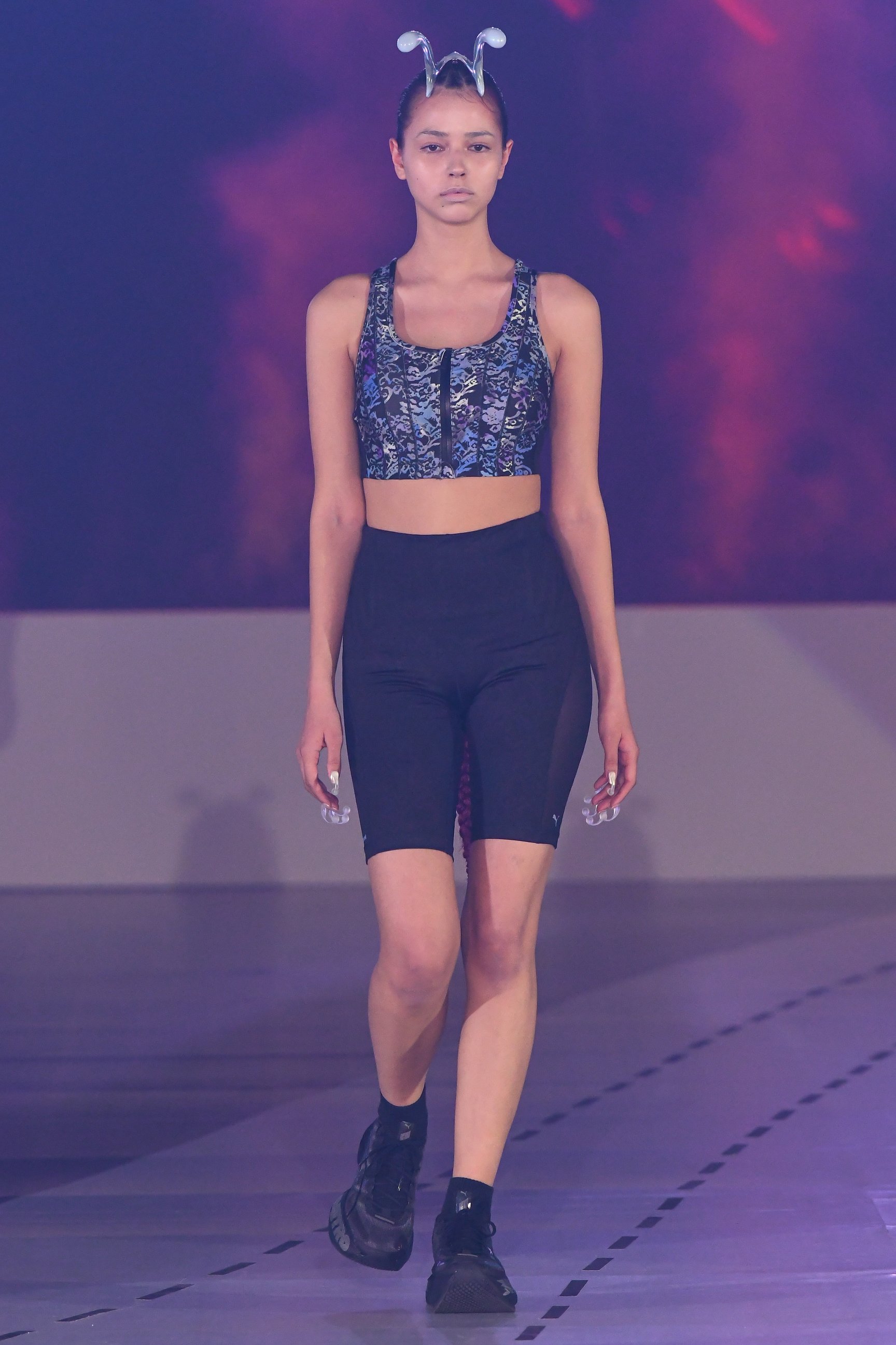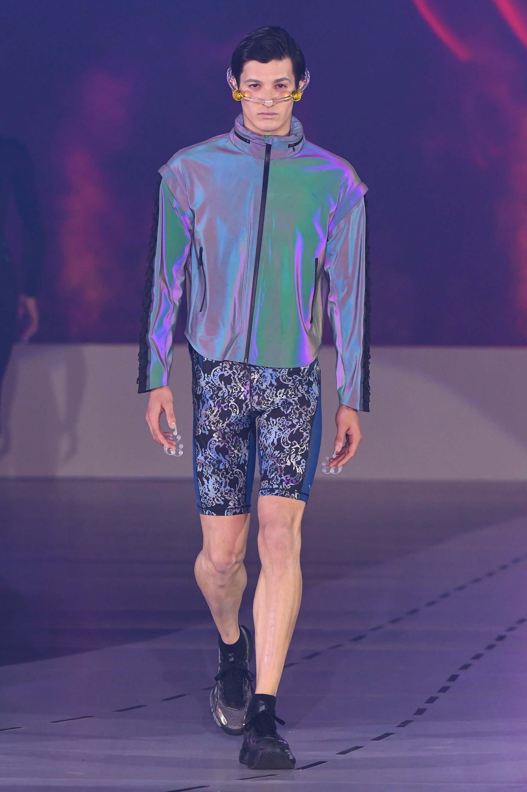 プーマの未来を想起させるスタイリングが特徴のFUTUREは、陸上のサニブラウン・ハキーム選手がクラウチングスタートからランウェイを駆け抜ける演出でスタート。コシェとコラボしたブラトップやショーツをはじめ、ウィンドブレイカー、フーディーなどミニマルでスポーティーなアイテムを中心に構成し、ウィメンズのアイテムをメンズに着せることでタイトシルエットにし、ボディスーツやロボットをイメージしたルックが登場した。また、アーティストのTOMOYA NAKAGAWAが手掛けた宇宙人やアメーバをイメージしたという象徴的なヘッドピースとネイルで、フューリャリスティックな雰囲気をさらに演出。ショーのBGMは、世界的人気を誇る数々のアーティストのプロデューサーとして活躍するWondaGurlが務めた。