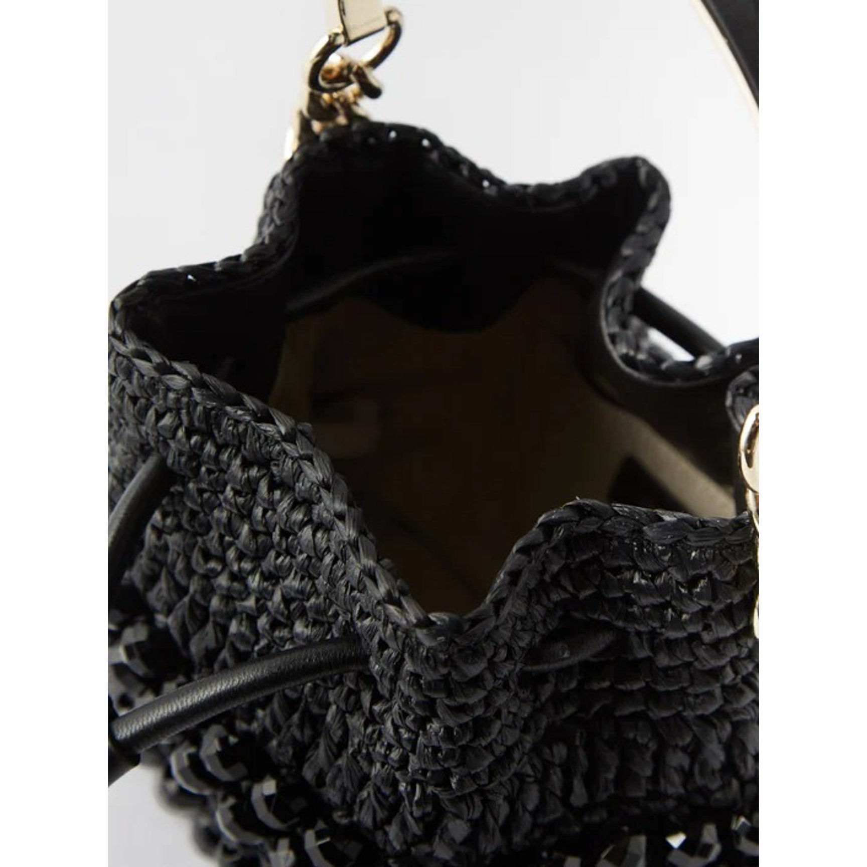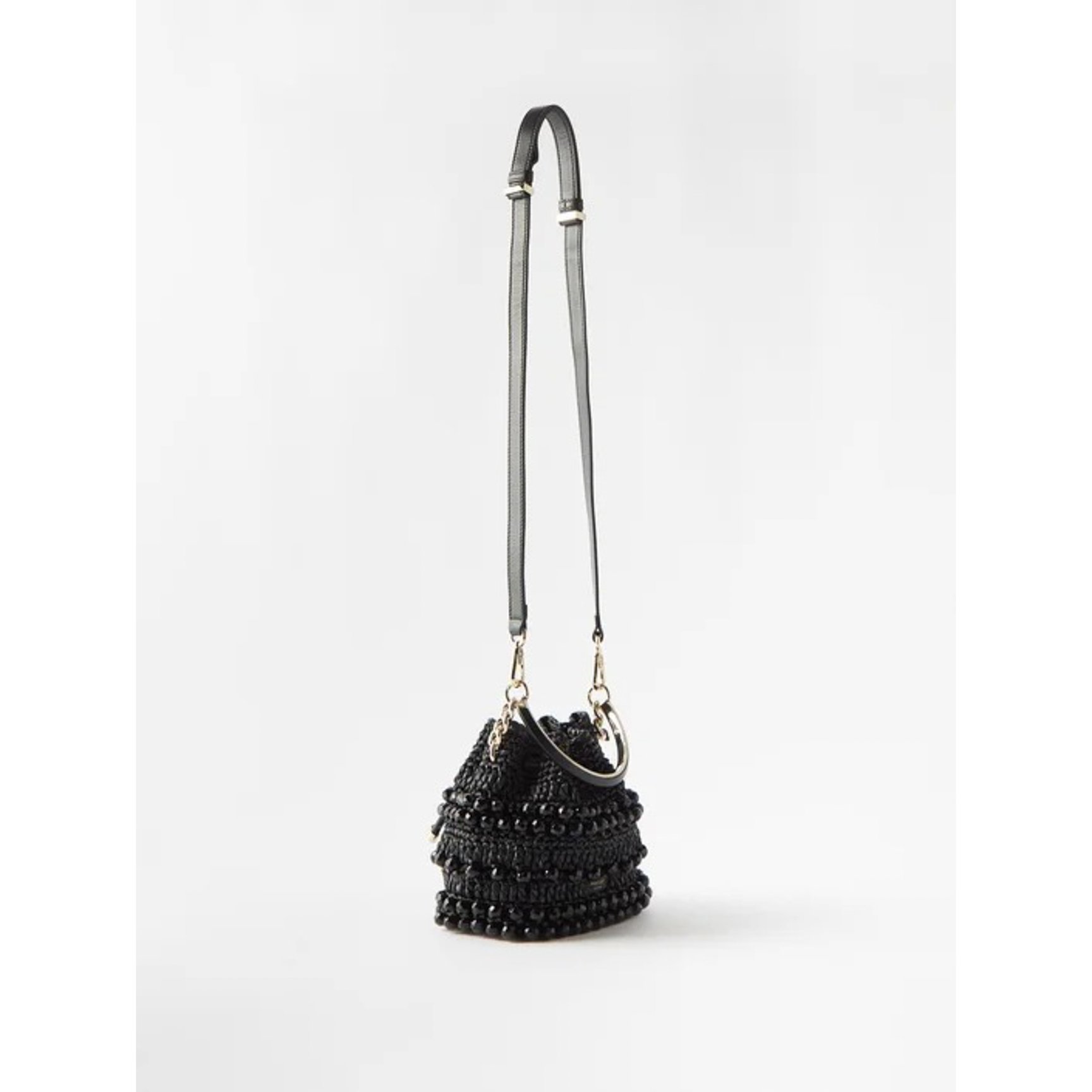 カジュアルなラフィアバッグも、ブラックに染まると一気にハンサムなムードに。「ジミー チュウ(JIMMY CHOO)」のバケットバッグは、光を反射するビーズが静かに煌めくラグジュアリーなアイテムです。持ち方を選べるショルダーストラップ付き。
