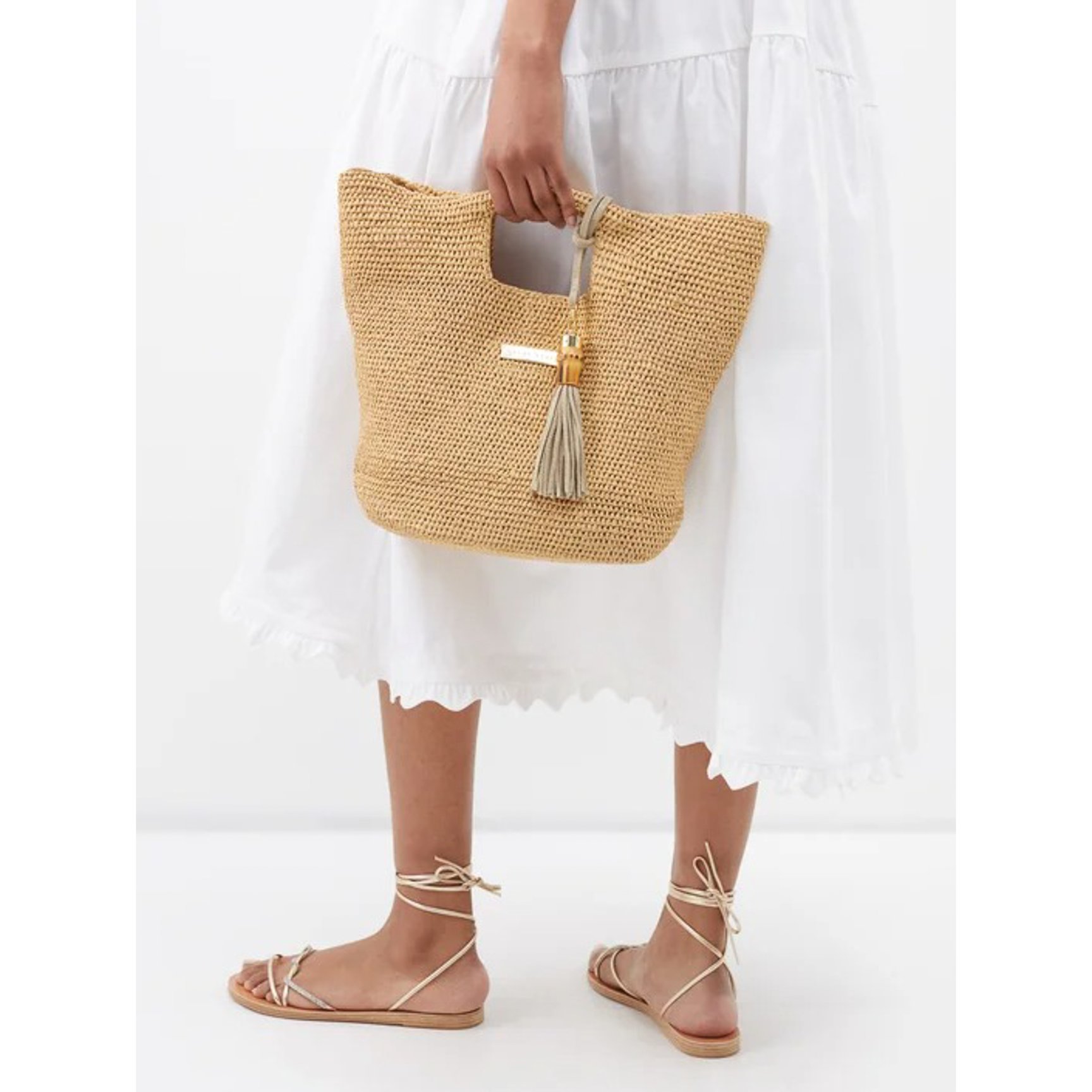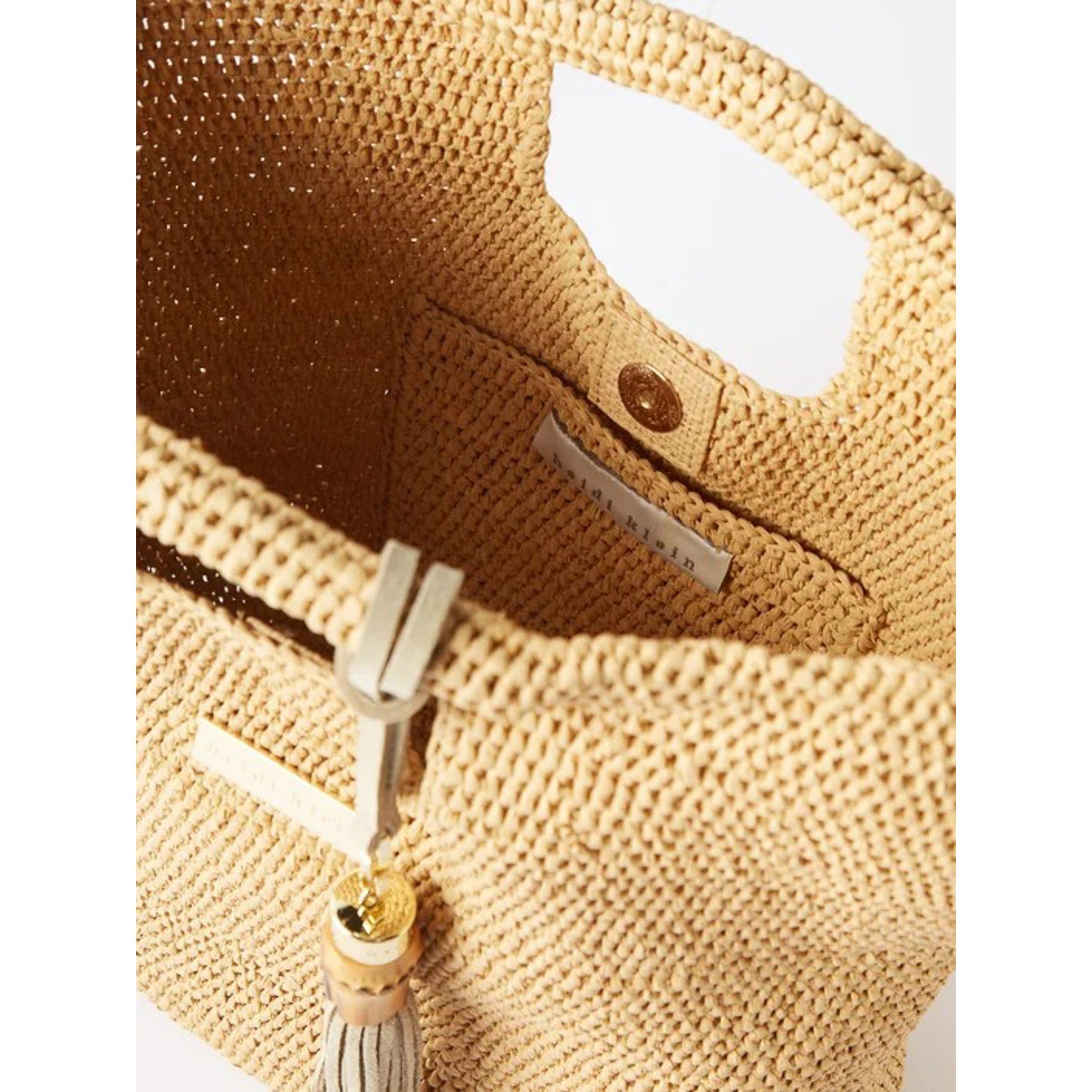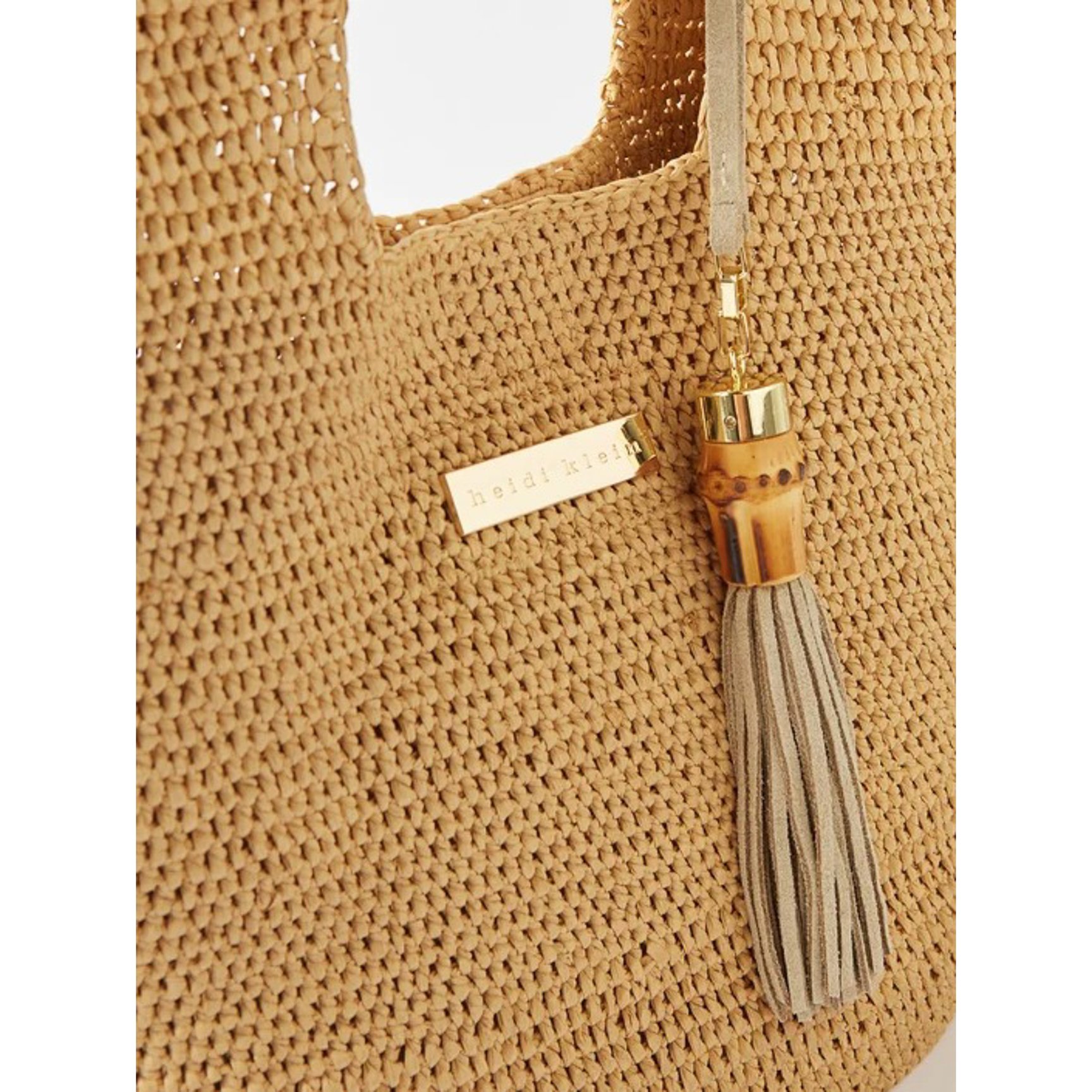 夏の必需品がすっきりと収まるサイズ感と、手にしやすいプライスが嬉しい「ハイジクライン(heidi klein)」のラフィアバッグ。レトロなフォルムのボディには、フリンジが軽やかに揺れる優雅なチャームとゴールドのロゴプレートをオン。