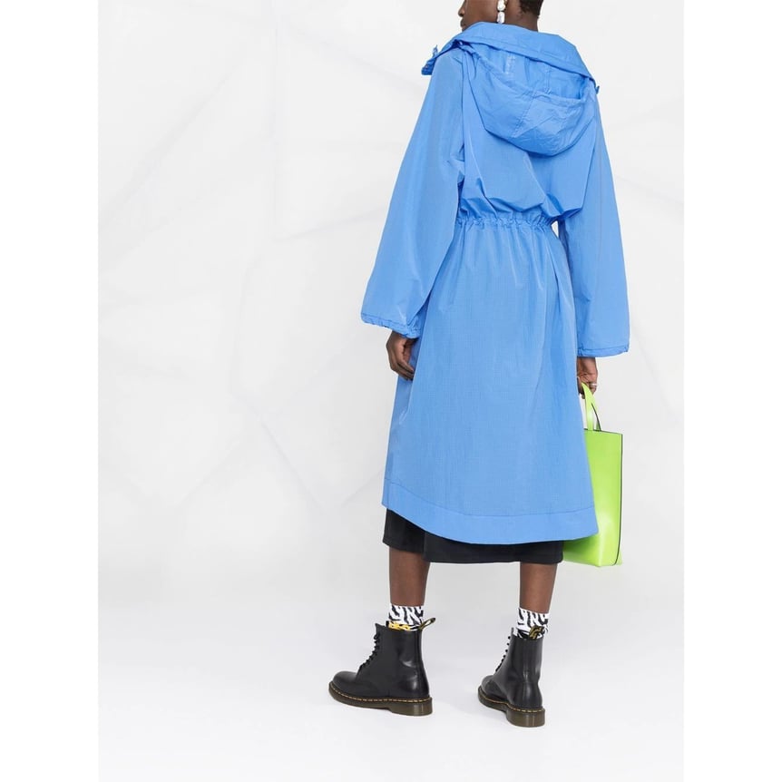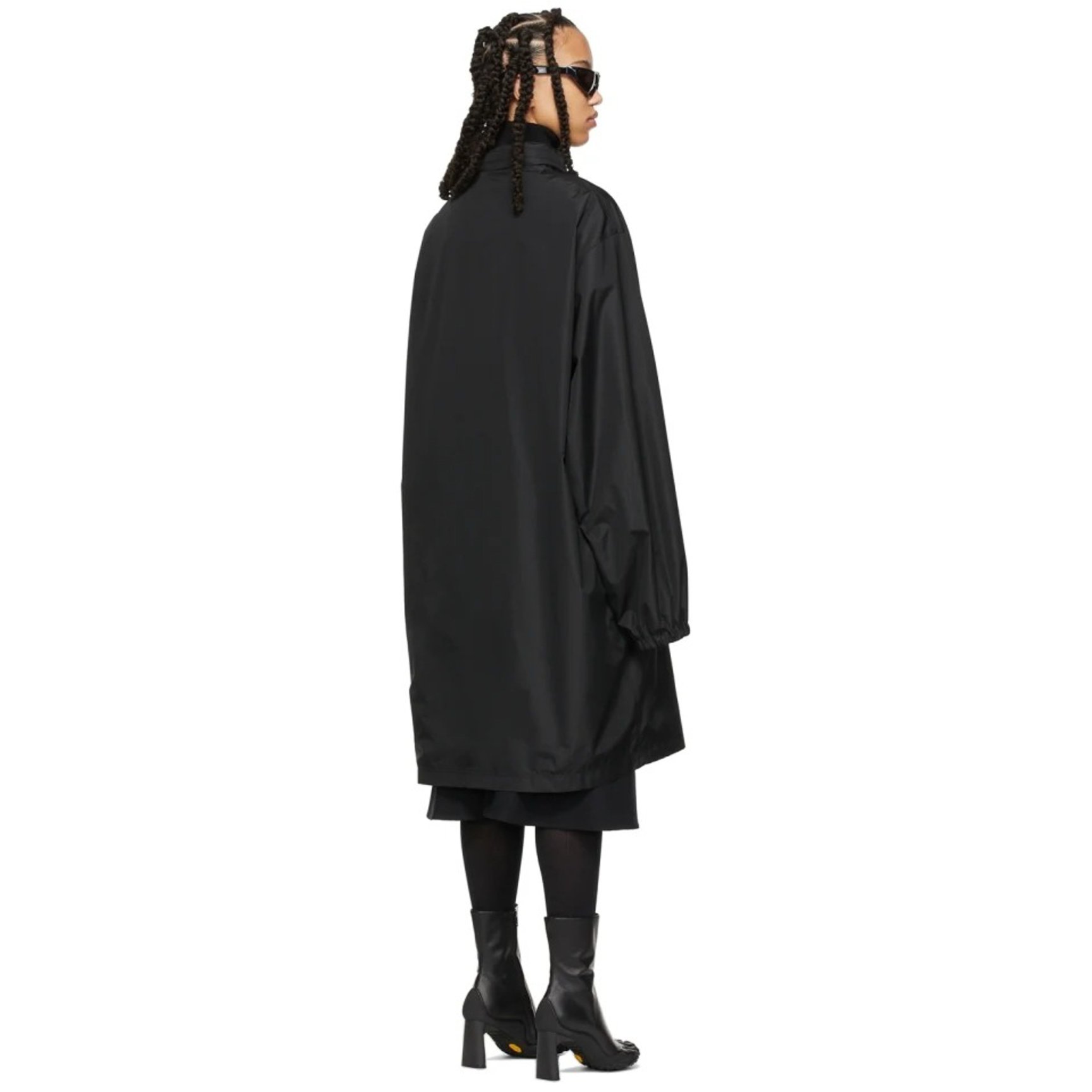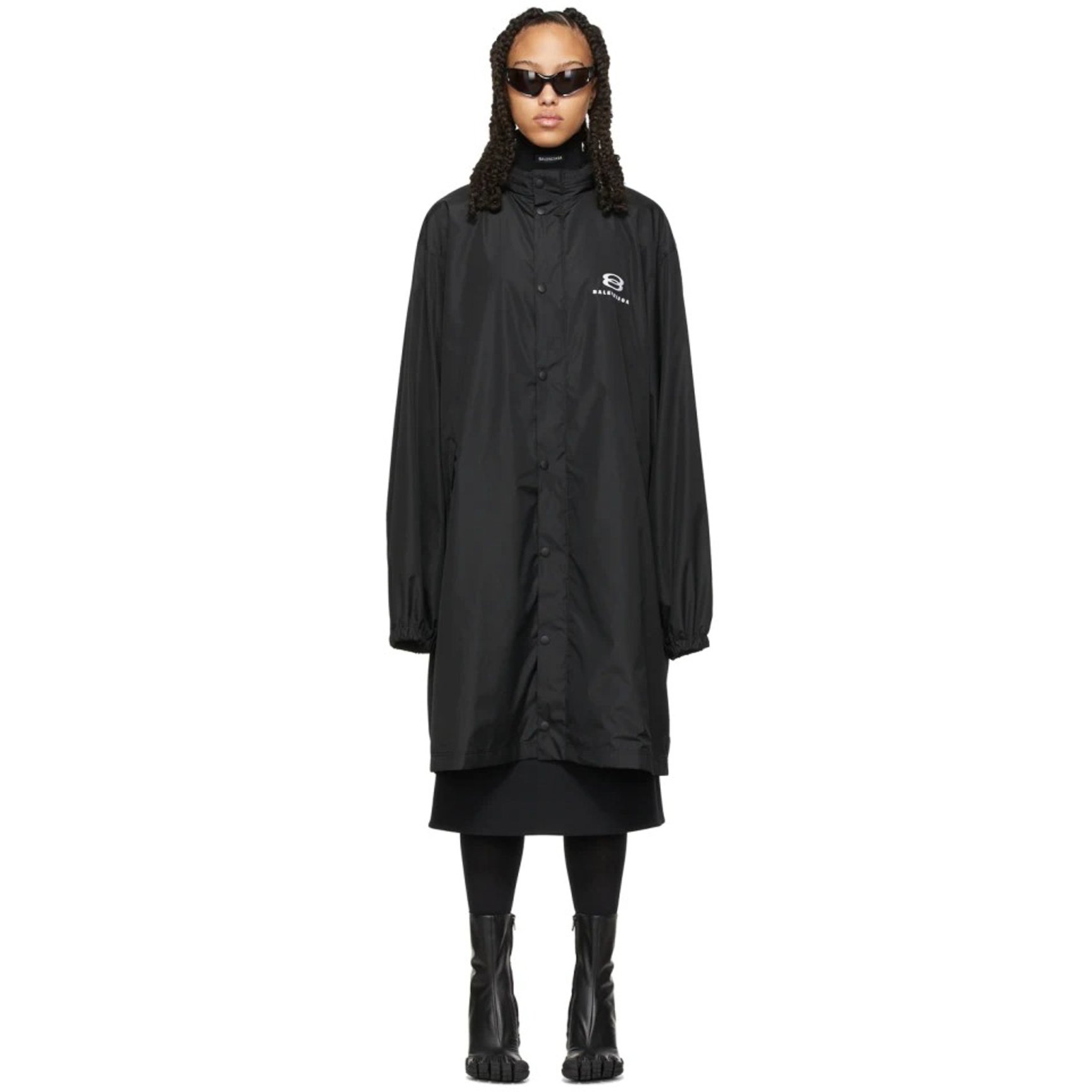 胸元にロゴ刺繍をあしらった「バレンシアガ(BALENCIAGA)」のシンプルなレインコート。オーバーシルエットにストウアウェイ フードを備えたスタンドカラーと、モードに着こなせる一着です。