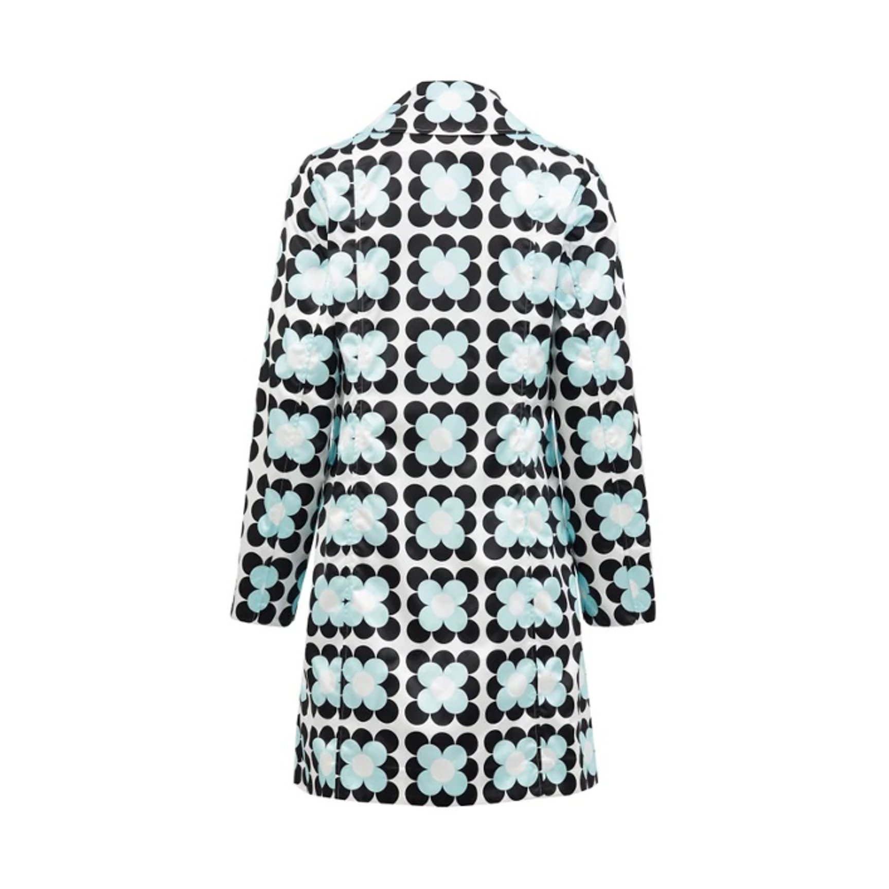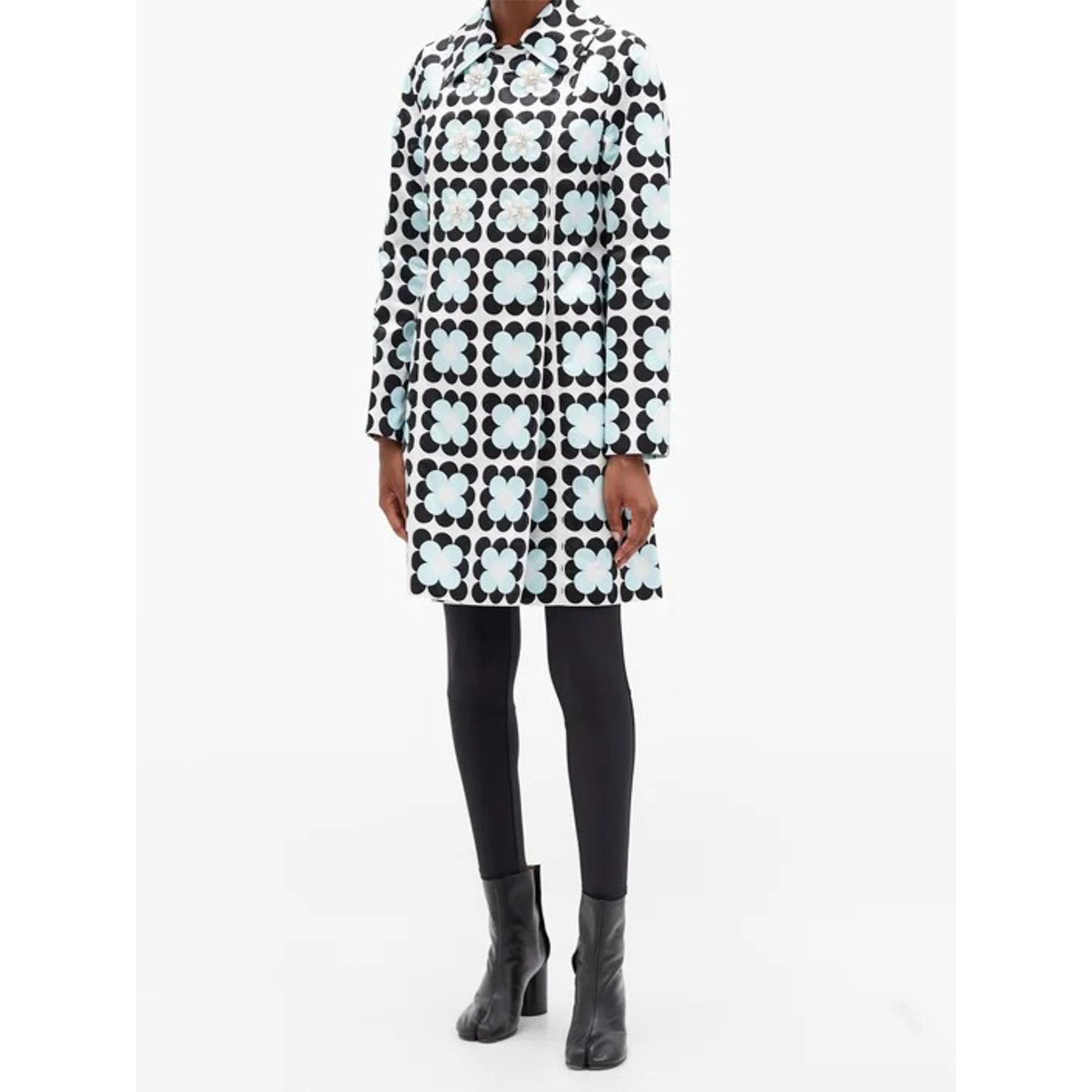 グラフィックなフローラルパターンが60年代スタイルを思わせる「モンクレール ジーニアス(MONCLER GENIUS)」の一着。ポイントカラーを配したリラックスシルエットのコートに、2列に並べたクリスタルの飾りボタンをオンした、レトロムード漂うレインコートです。