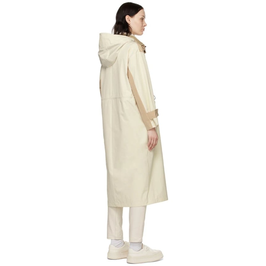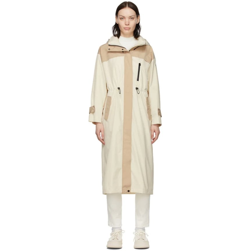 オフホワイト×ベージュの配色デザインがポイントの、晴雨兼用のロングコートは「マッカージュ(MACKAGE)」のもの。シルエットの変化を楽しめるウエストのドローコードを調節すれば、フェミニンにもクールにも着こなせます。