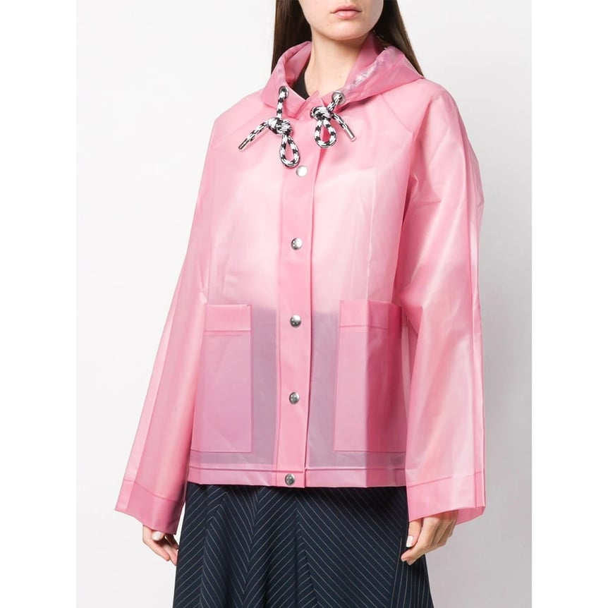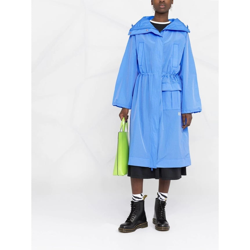 細かな格子模様が入った「ガニー(GANNI)」のレインコート。フラグメントケースやスマホなど必要最低限の荷物が入る立体的なポケットを配し、その下にはさりげなく主張するブランドロゴ入り。また、洗濯機で丸洗いができるのも嬉しいポイントです。