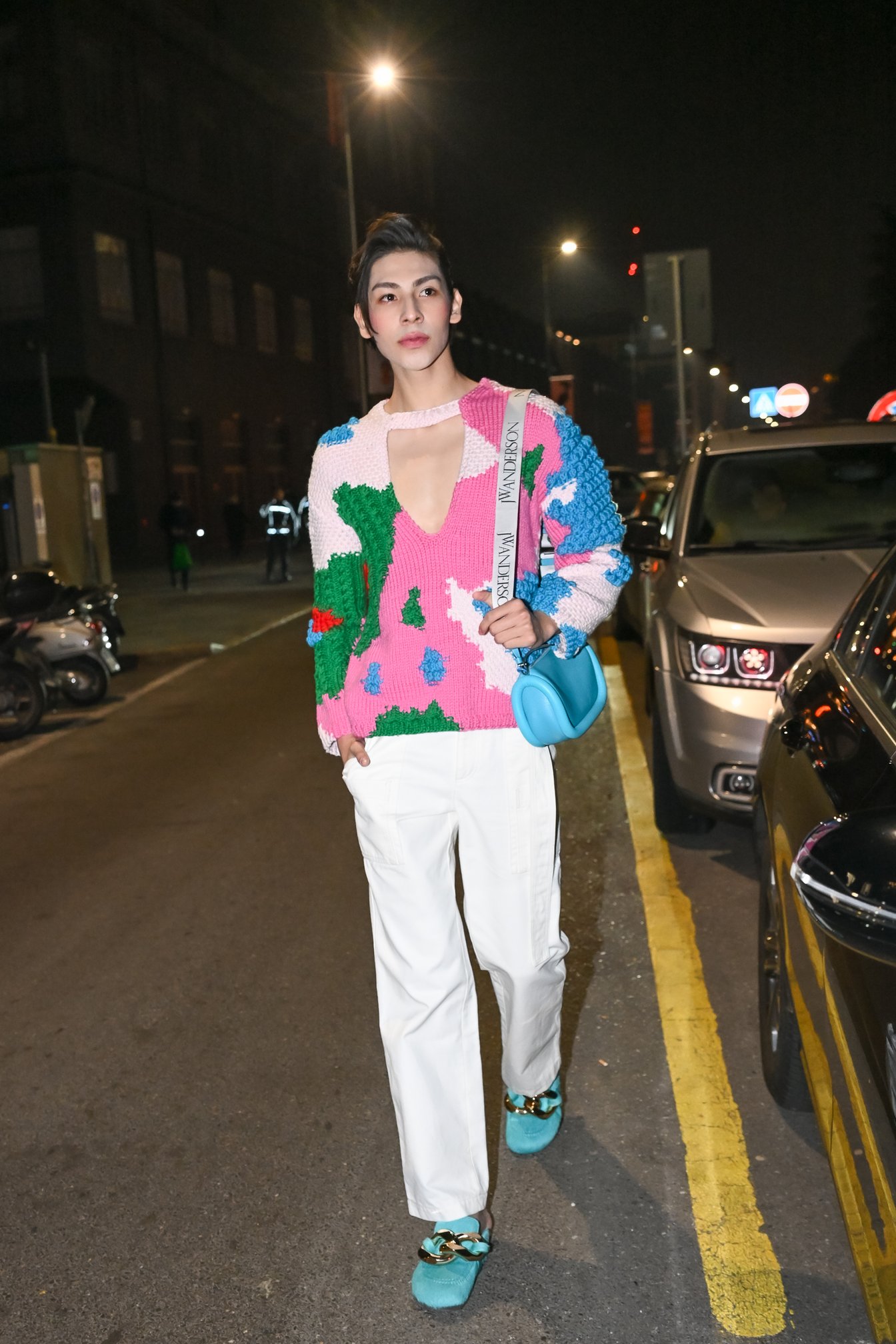 「JW アンダーソン(JW Anderson)」のショー会場に向かうラウールさんは、深いVネックのカラフルなニットを着用。パッド入りチューブディテールが目を引く「バンパー」バッグと、チェーンディテールのサンダルは鮮やかなブルーで統一。ポップな装いに合わせたカラーメイクが、フレッシュな魅力を引き立てます。