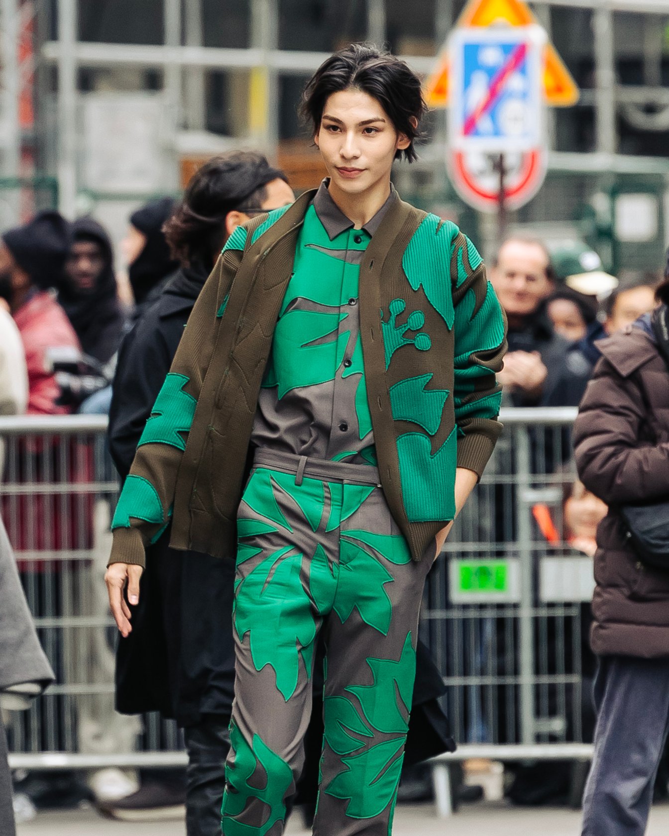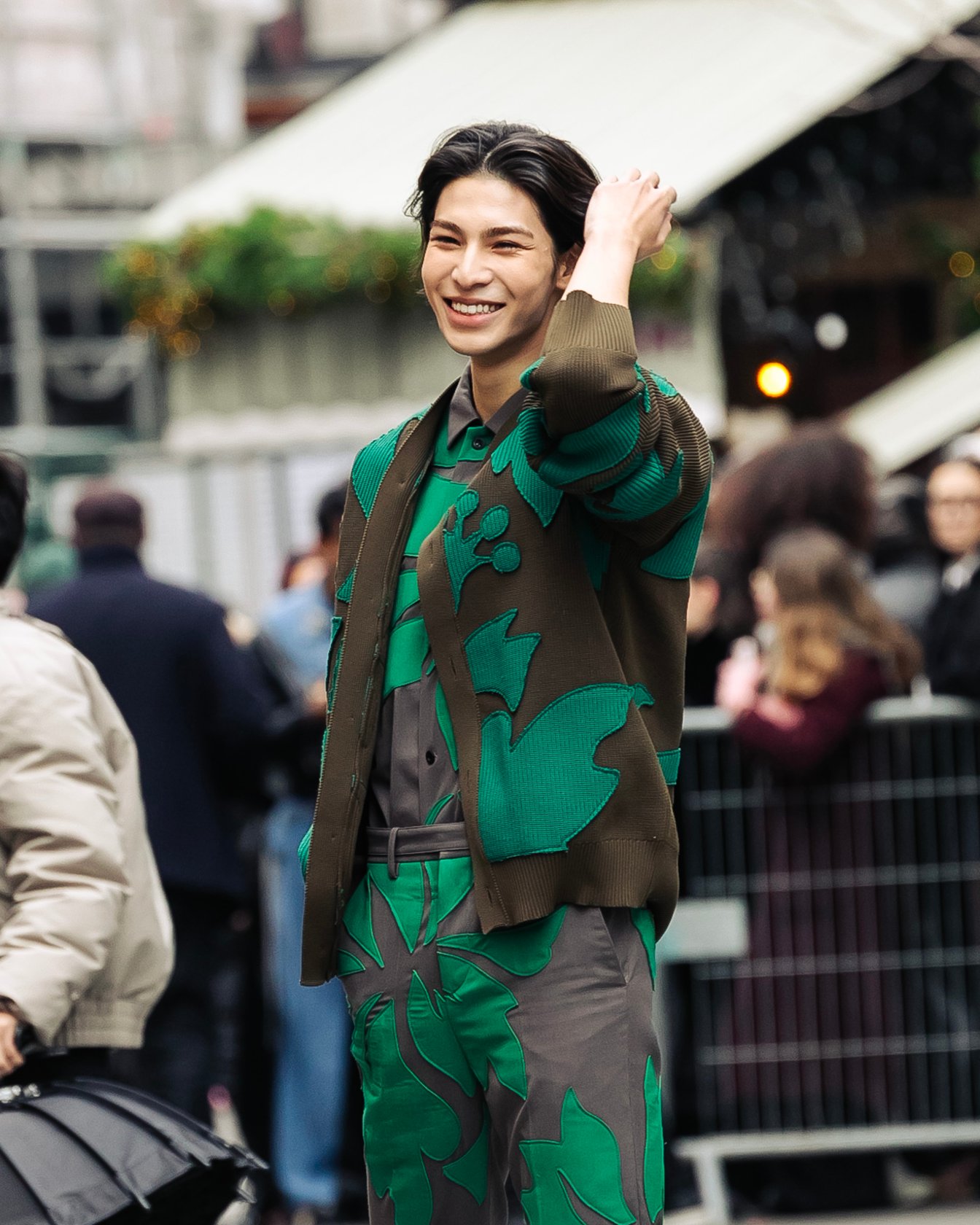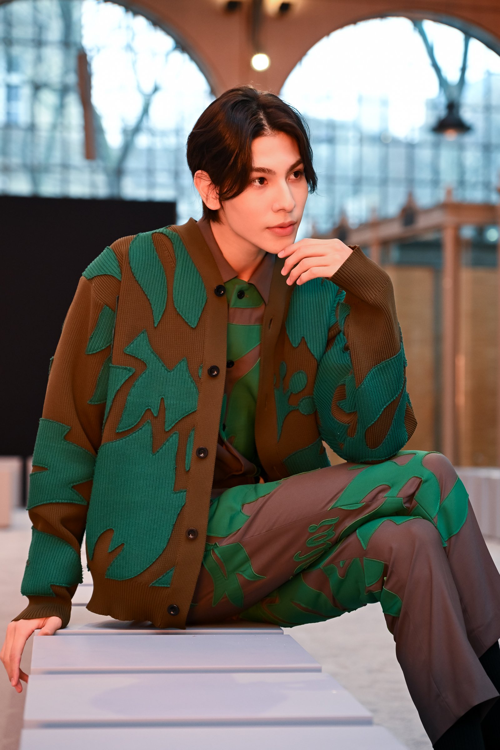 ラウールさんにとってパリでのラストショーは「サカイ(sacai)」。ボタニカルモチーフをパッチワークしたトープ×グリーンのスタイリングで姿を表しました。風になびくナチュラルなヘアスタイルが爽やかな印象です。
