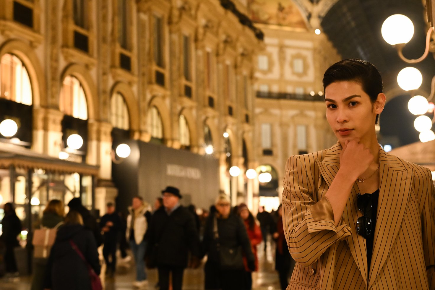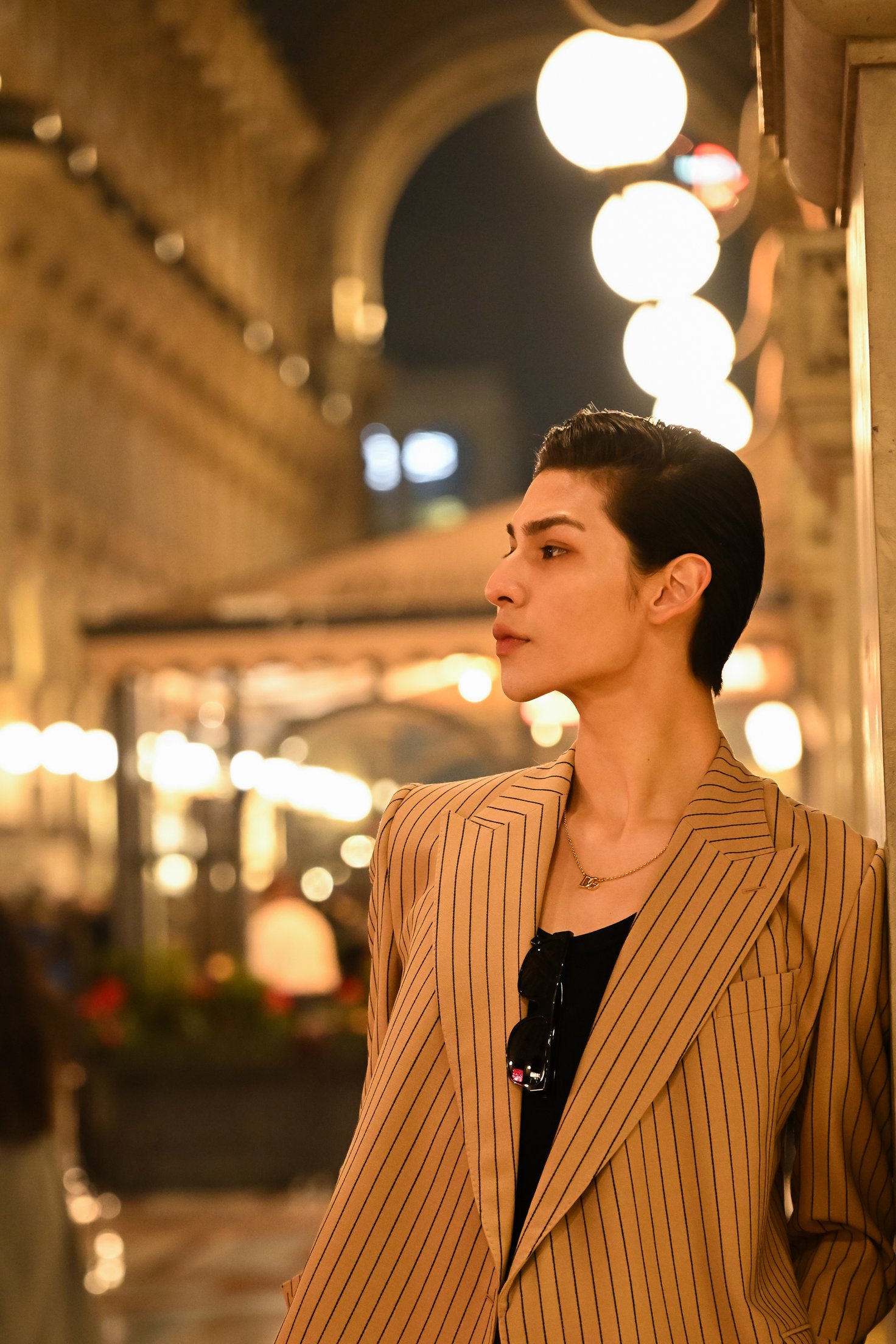 「シックな雰囲気の街ですね」。見るもの全てが新鮮な、初めてのイタリア・ミラノ。「ドルチェ&ガッバーナ(Dolce&Gabbana)」のショーに出席したラウールさんは同日、暖かい光に包まれた夜の街に繰り出しました。ピンストライプのシングルブレストスーツに、首元にはDGロゴをあしらった細身のチェーンネックレスが光ります。