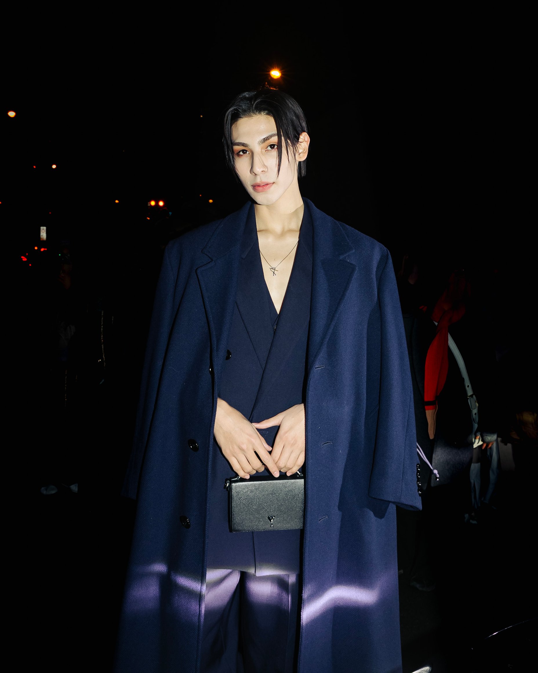 ミラノのファッションウィークの終了後、パリへと移動。まず出席したのは、フランスのエスプリが漂う「アミ パリス(AMI PARIS)」。ネイビーのセットアップにロング丈のテーラードコートを肩掛けした上品なスタイルでショー会場に姿を表すと、大きな歓声とフラッシュの光に包まれました。シルバーのランチボックスバッグとチェーンネックレスには、ブランドの頭文字であるAとハートを掛け合わせたアミ パリスのシグネチャー「AMI DE COEUR(=心の友)」があしらわれています。