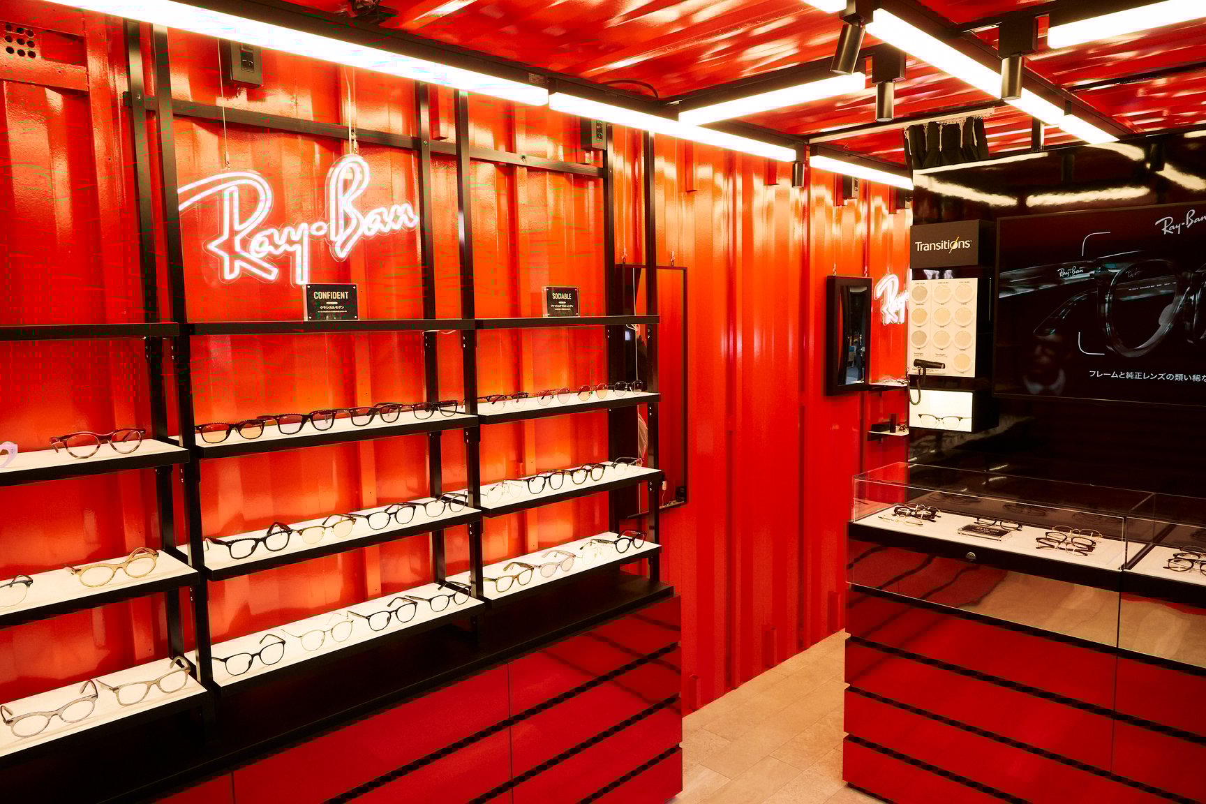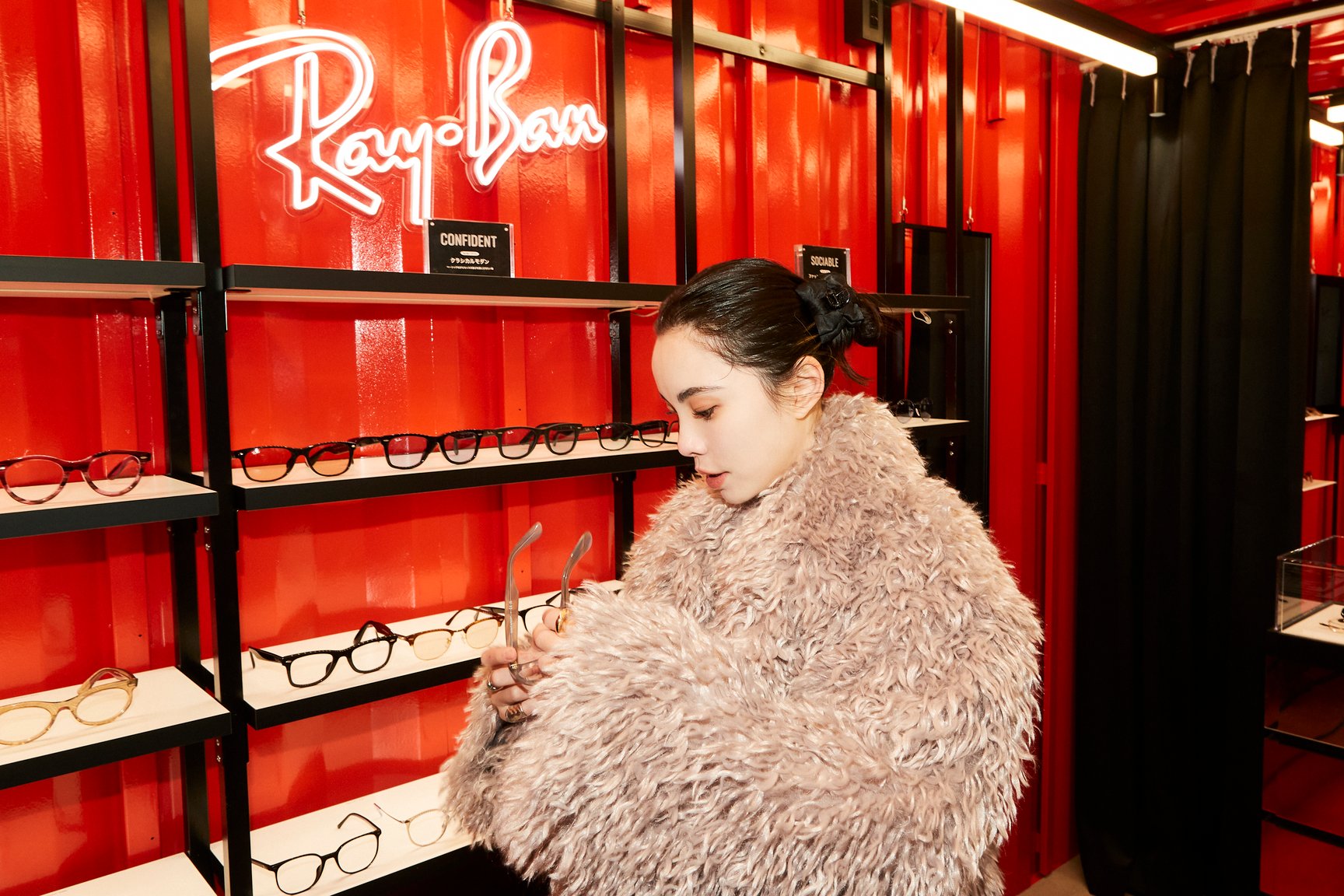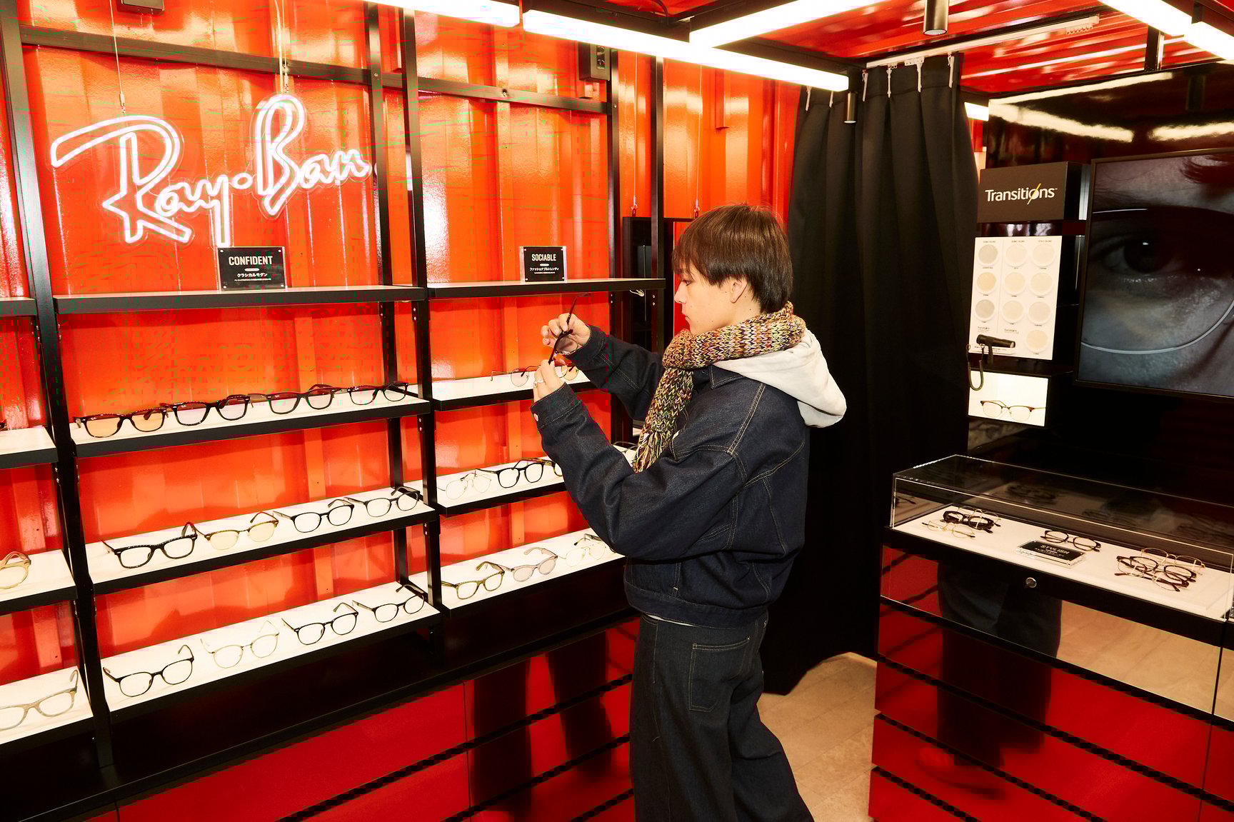 会場には、5つのテイスト別にカテゴライズしたアイウェアが整然と並べられた。「エレガントビューティ」「クラシカルモダン」といったキーワードから、“なりたい自分”をイメージすることができ、スタイリストの小山田早織監修によるコンテンツが、理想の自分へとナビゲートしてくれる。広場中央には、レイバンを象徴するレッドカラーのコンテナが設置され、「トランジションズ®(Transitions ®)」のテクノロジーを体験したり、「フォトマティック(Photomatic)」によるセルフィーを楽しんだりと、ブランドの世界観に満ちた特別な空間を堪能できる。