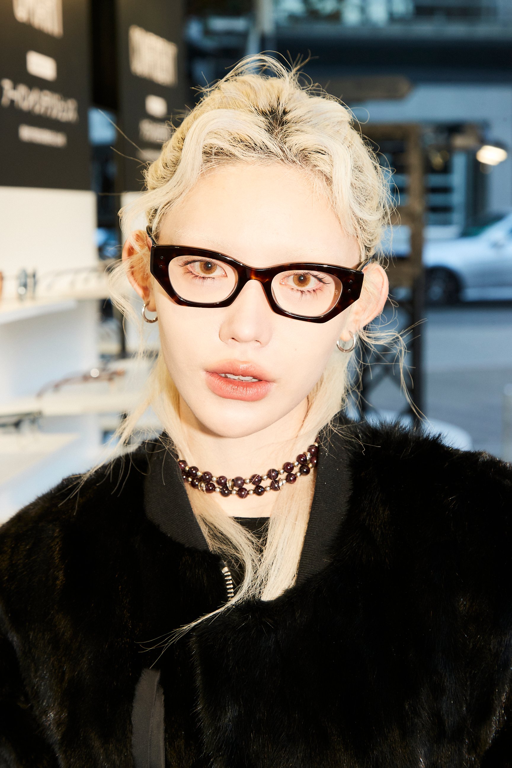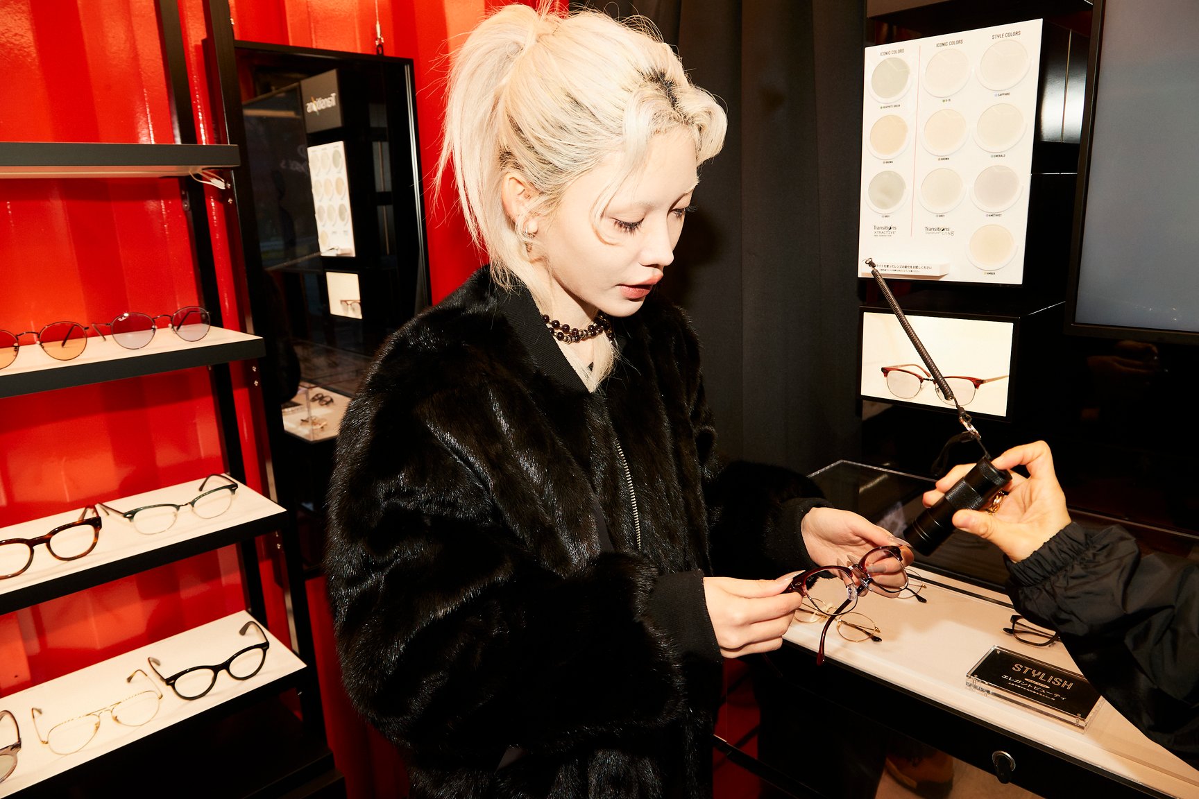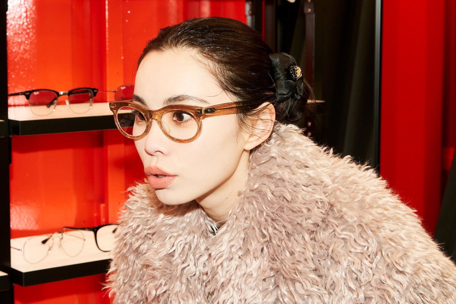 インテリジェンスなムードを宿した細フレームから、個性的なカラーフレームまで、幅広いアイウェアを試着したるうこさん。最終的に選んだのは、フォルムが気に入ったというオーソドックスな黒縁のメガネ。「普段は自分に合いそうなメガネばかりに目がいくけれど、ここでは挑戦したいスタイルごとに分かれていたので、新鮮なフレームに手が伸びました。私はなにかと派手なデザインを選びがちなのですが、今回はあえての黒をセレクト。色はベーシックだけど、これはほんのりキャットアイっぽい形が可愛くて気に入っています!」。