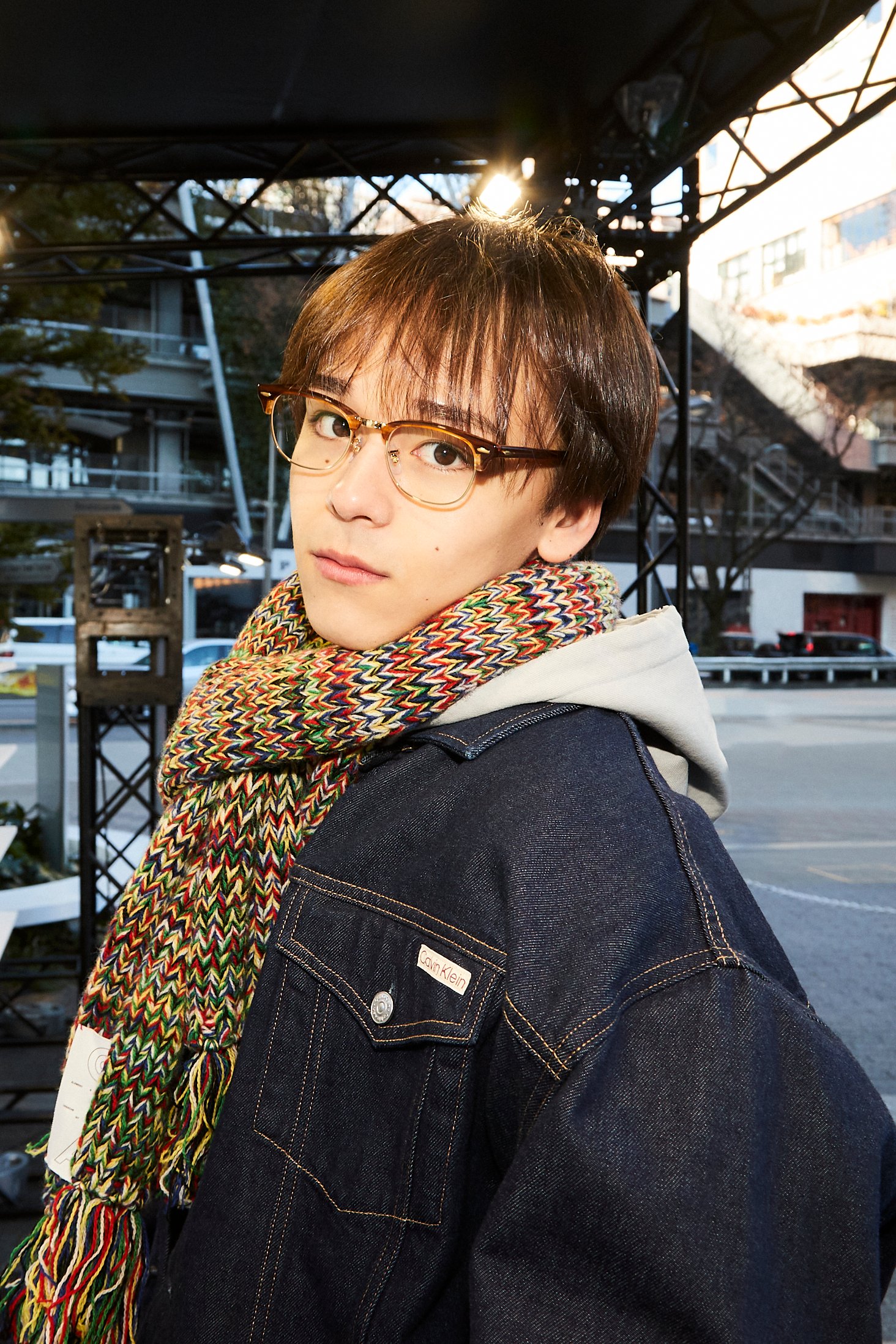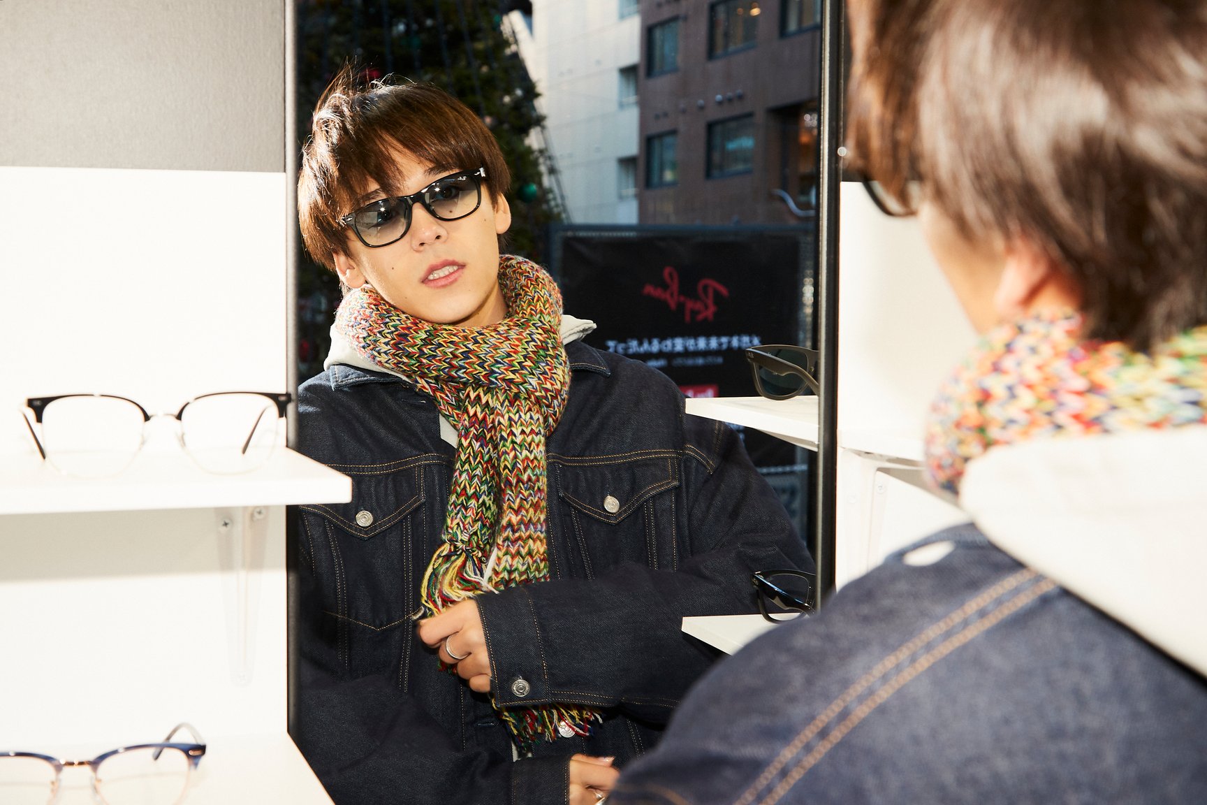 普段からよくアイウェアを身につけるというkyanさんは、ほんのりギークシックなクラブマスターに挑戦。通常黒やシルバーを選びがちだという彼にとっては、新たな自分との出会いに繋がった様子。「いつもだったら選ばない、ブラウン系やべっ甲柄のメガネもたくさん試すことができて新鮮でした。重くなりがちな冬のコーディネートも、これなら合わせやすそうです。家でもアイウェアをよく掛けるので、1本でメガネとサングラスの2役を果たしてくれる『トランジションズ®』レンズは便利ですよね」。