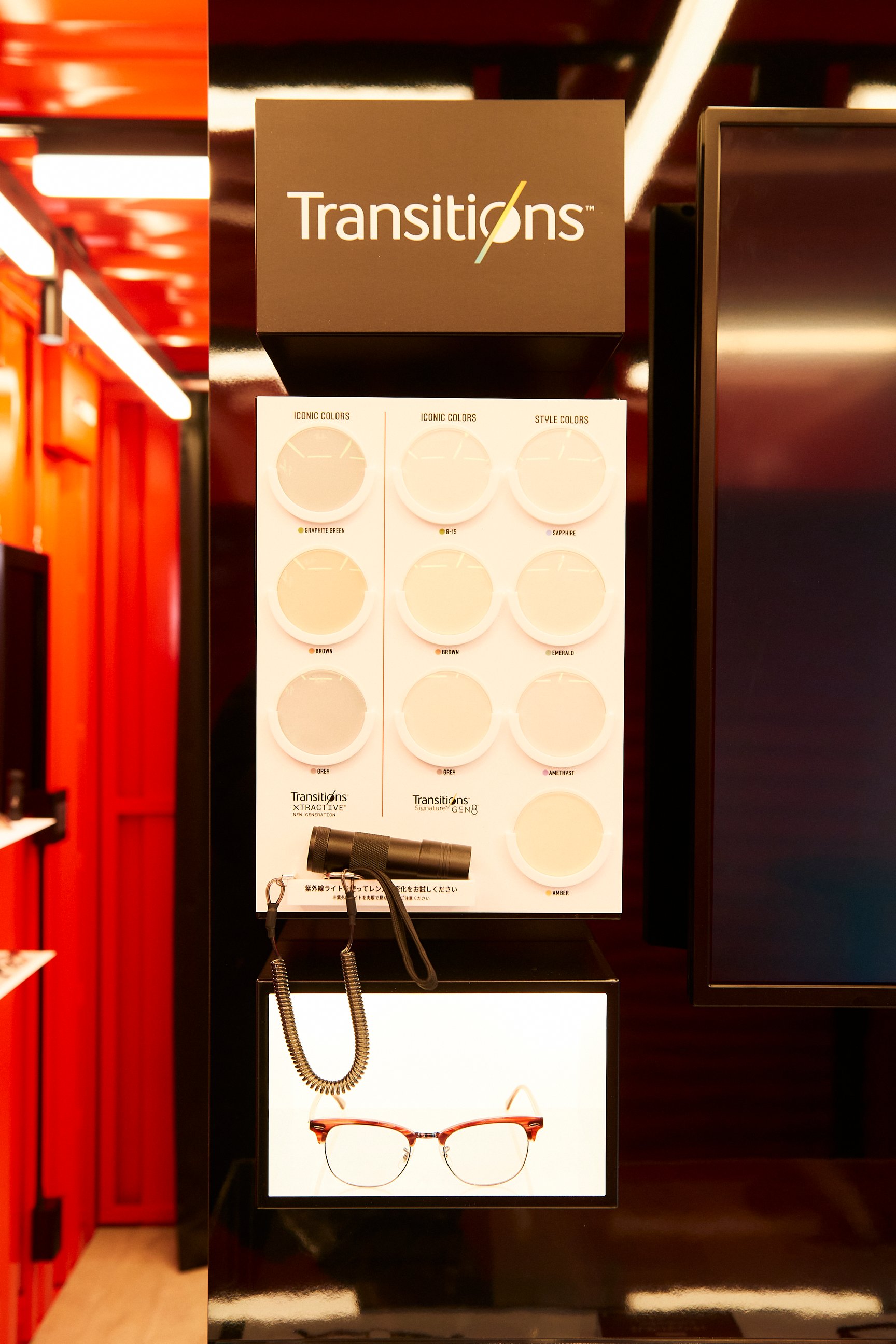太陽光を感知し、フレームやレンズの色が変わる調光機能を搭載した「トランジションズ®」。コンテナ内では、実際にこのレンズにUVライトを当て、スピーディに色が変化する様子も見ることができ、レイバンの革新的なデザインとテクノロジーの融合を体感できる。