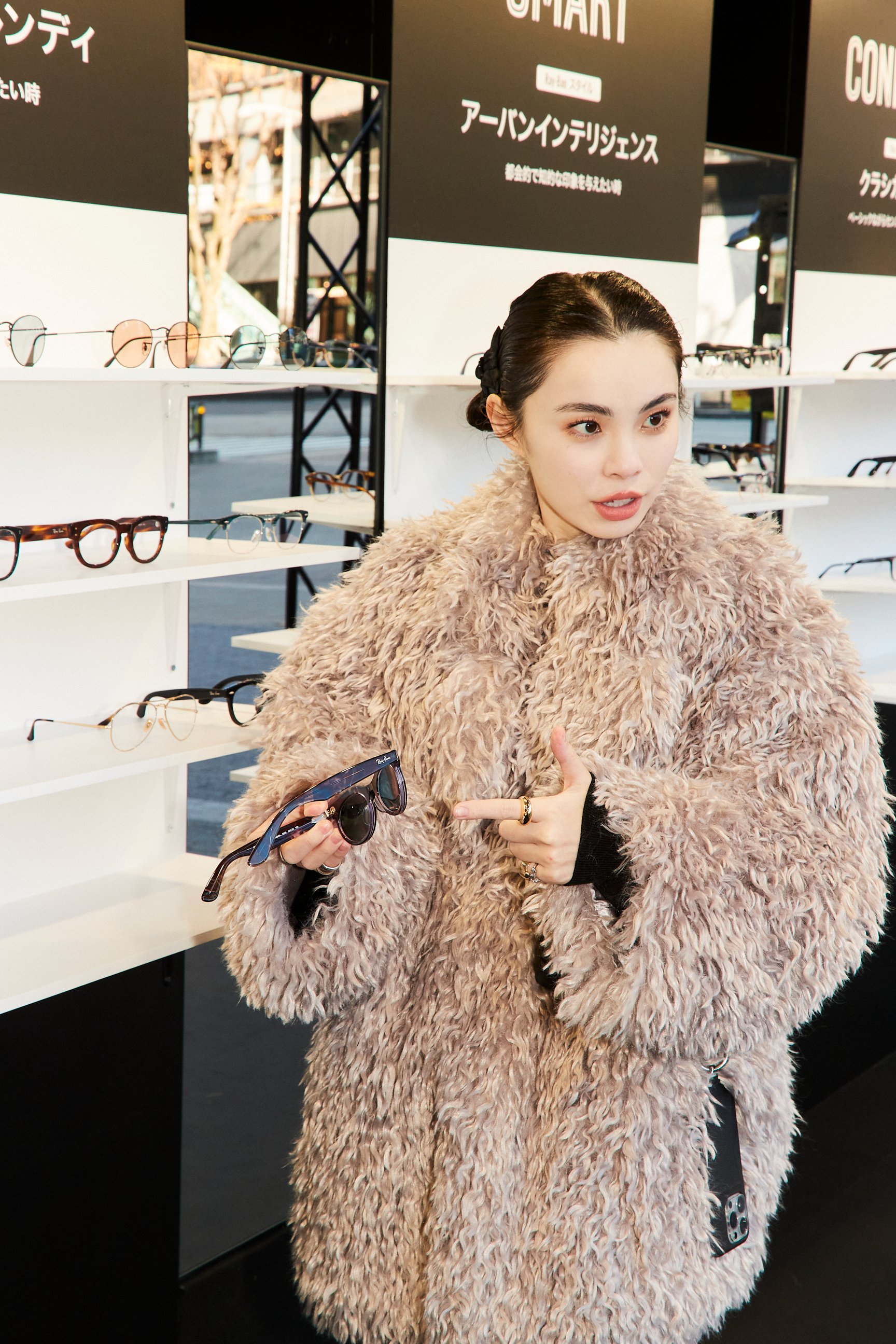 手持ちのアイウェアは太めのフレームが多いという木村由佳さんが選んだのは、特徴的なシェイプが存在感を放つ一本。「エレガントビューティのコーナーに置いてあった、華奢なフレームも素敵だったので迷いました。改めてセルフィーで撮った写真を見たら、鏡越しで見るのとはだいぶ印象が違って。フォトブースがあると楽しいだけじゃなく、客観的に判断できるのがいいですね。迷ったときにセルフィーで確認すれば、コレにしよう!って即決できそうです」。