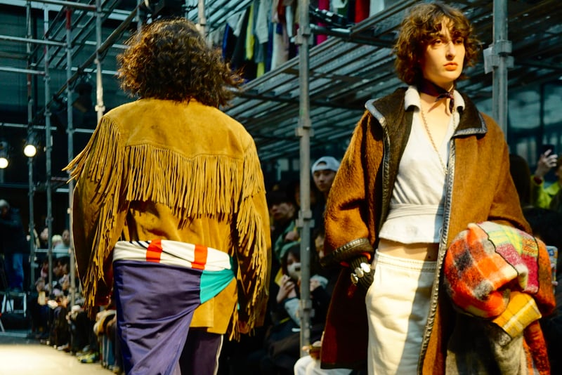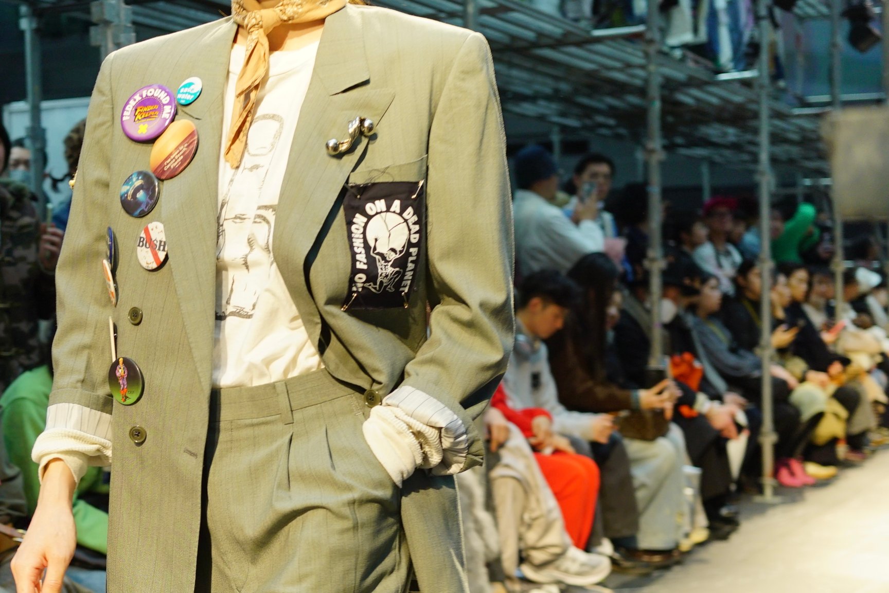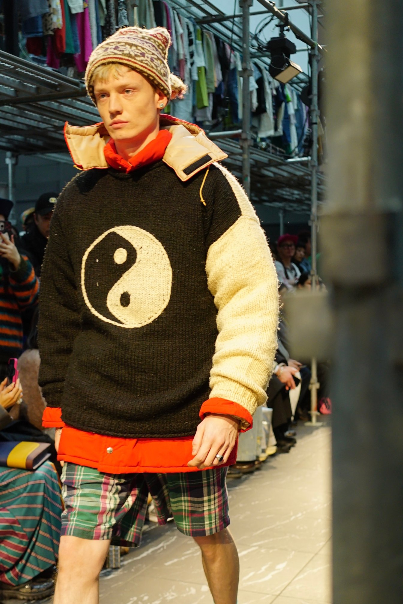 モデルが次々と歩く。真っ赤なシャツにスカーフが袈裟のように掛けられている。ジョン・レノン(John Lennon)のイマジンTシャツにはワイドスラックス。ネルシャツの上から着せられたタンクトップ。牧歌的なワンピースには花束。平和を祈るパッチが付けられたスーツには中指を立てているTシャツが。それから、ニットがターバンになり、アウターがインナーになり、ラグがスカートになり、さまざまな古着がその役割を刷新され、フレッシュな存在になって代わる代わる現れる。