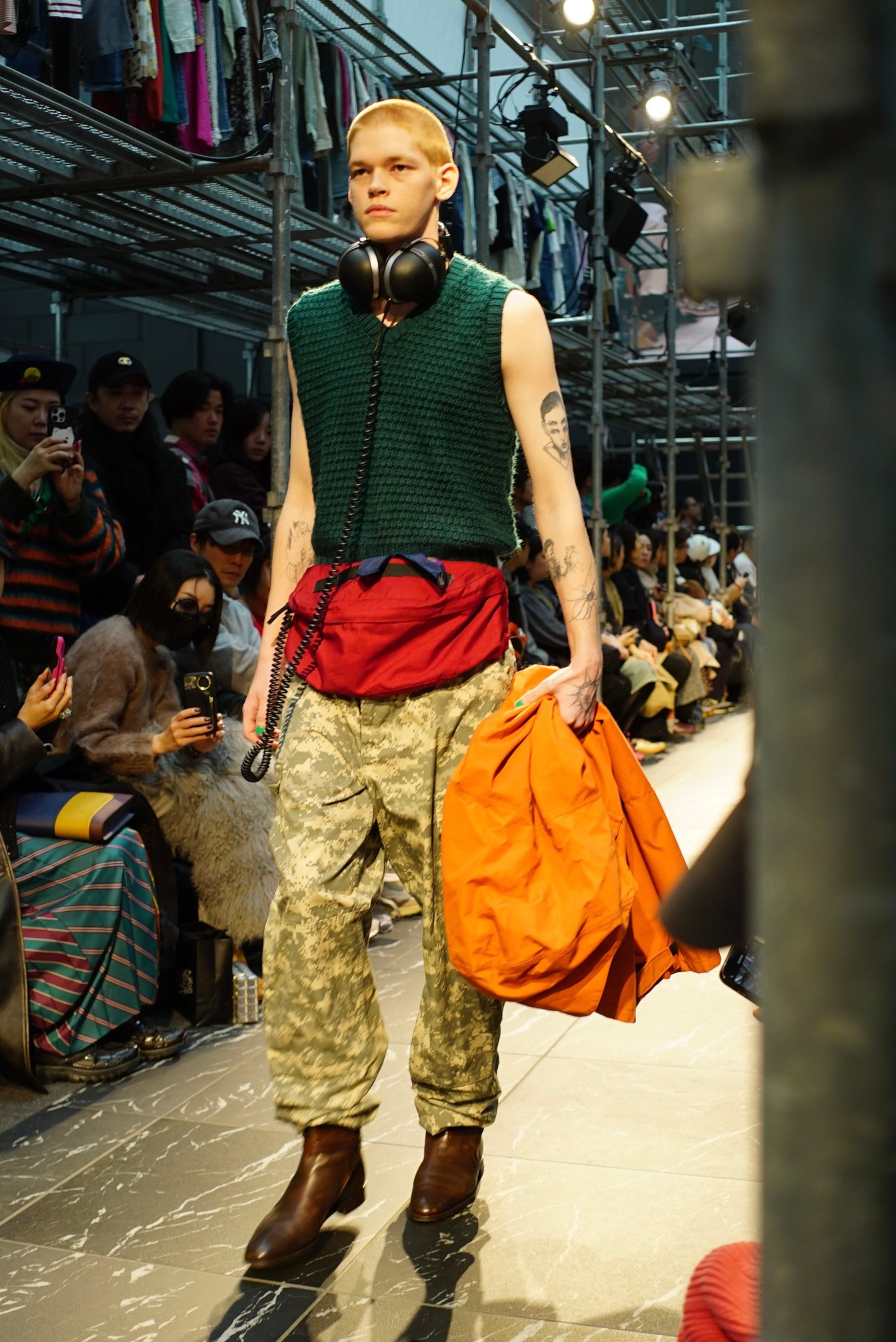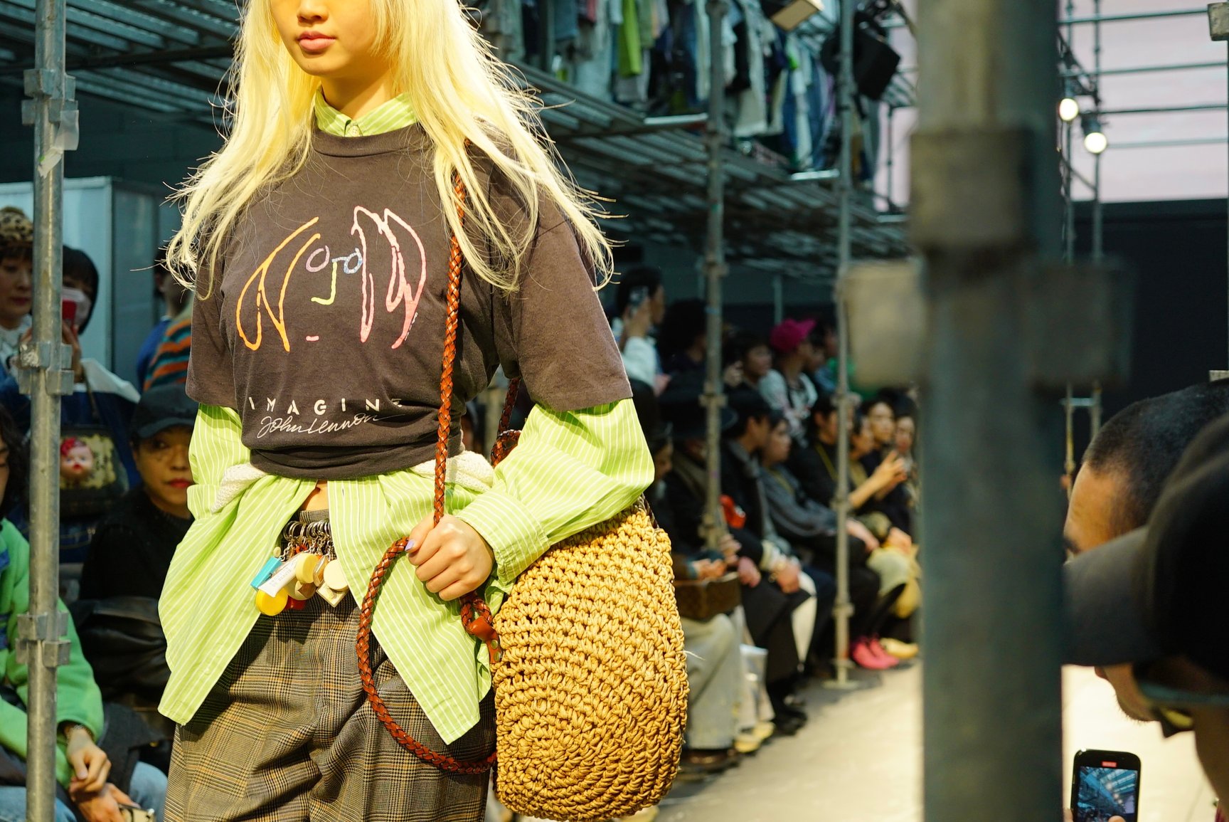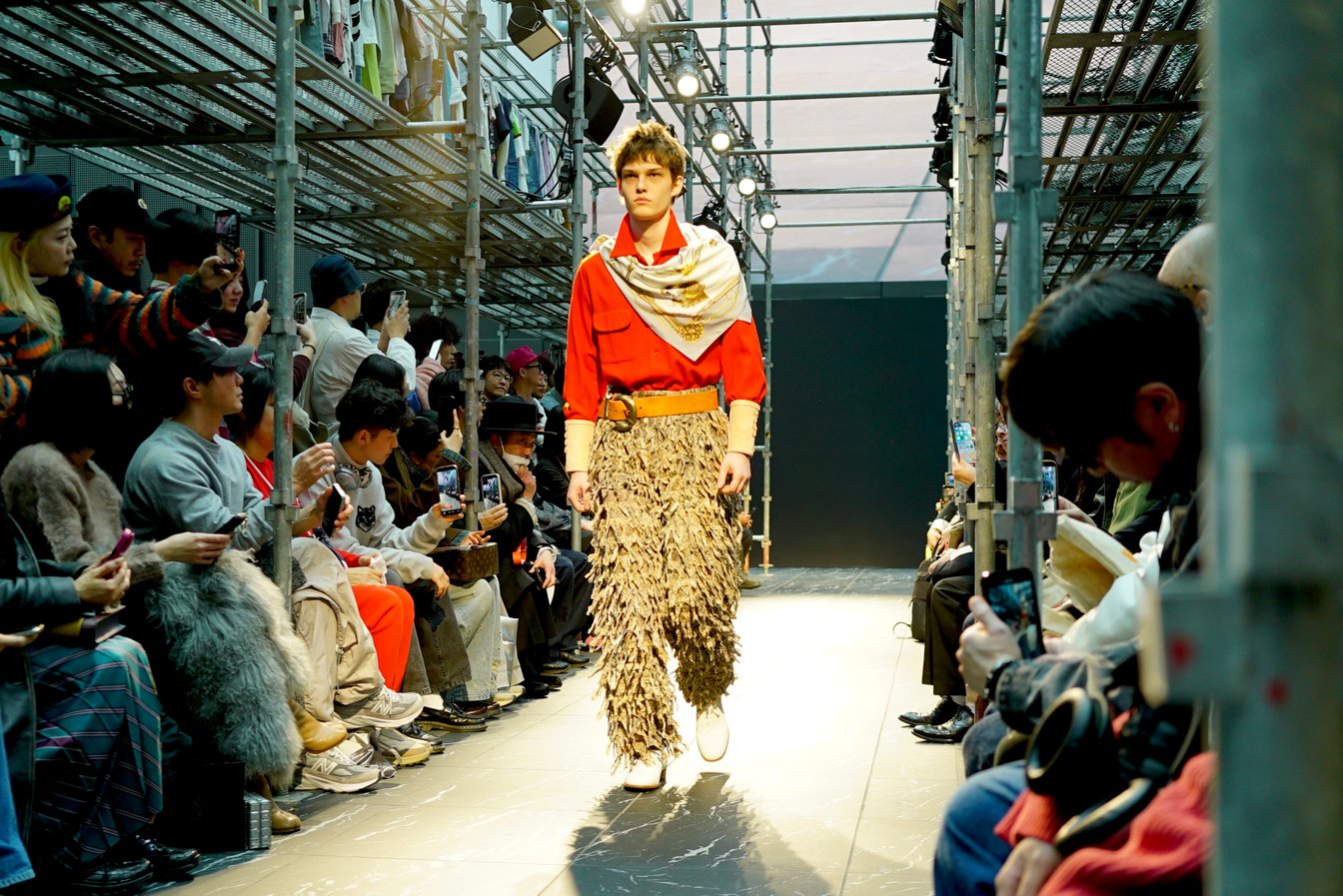 モデルが次々と歩く。真っ赤なシャツにスカーフが袈裟のように掛けられている。ジョン・レノン(John Lennon)のイマジンTシャツにはワイドスラックス。ネルシャツの上から着せられたタンクトップ。牧歌的なワンピースには花束。平和を祈るパッチが付けられたスーツには中指を立てているTシャツが。それから、ニットがターバンになり、アウターがインナーになり、ラグがスカートになり、さまざまな古着がその役割を刷新され、フレッシュな存在になって代わる代わる現れる。