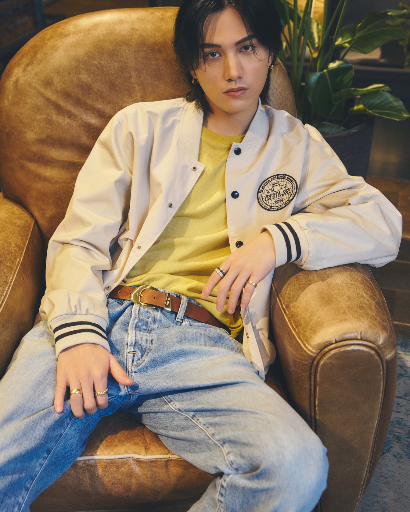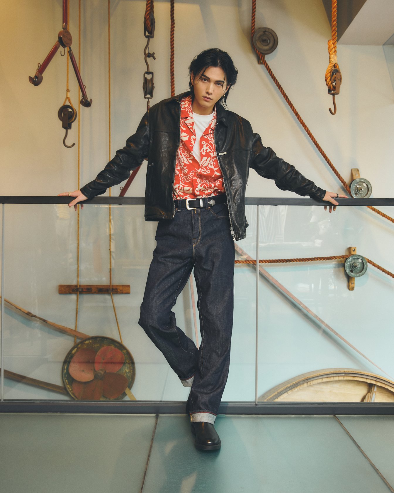 「リプレイのジーンズはシルエットが美しく、体にフィットして、足も長く見せてくれるところに驚きました。デニムは日常着として、肩の力を抜いて、おしゃれを楽しみたいときに選ぶことが多いです。今日のレザージャケットとジーンズの合わせは、普段の自分に近い感覚で撮影に臨めました」──大平修蔵