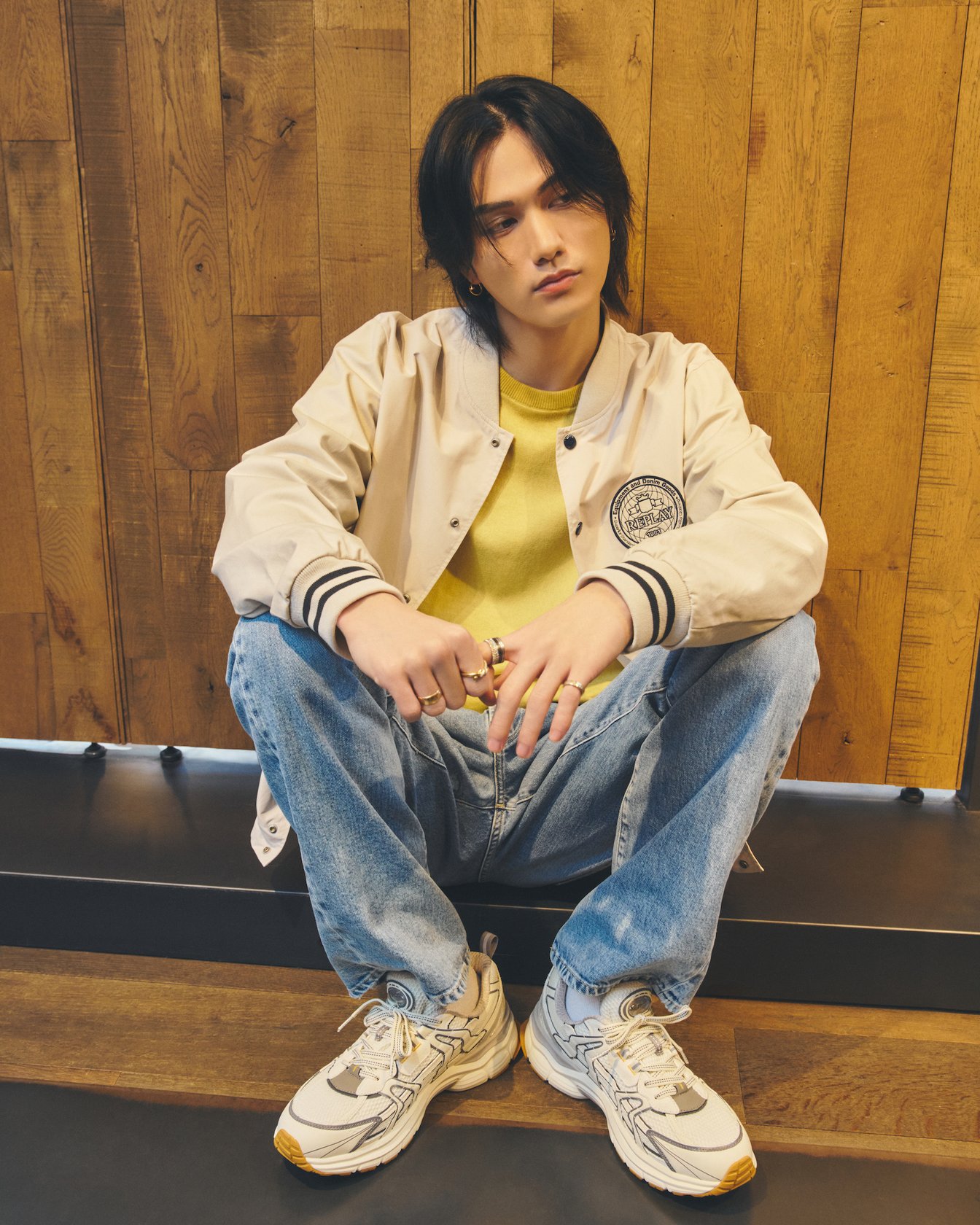 修蔵さんが着こなしたのは、スポーティかつレトロなムードのあるバーシティジャケットに、日に焼けたようなグラデーション加工が印象的な半袖ニット、そして酵素ストーンウォッシュとブリーチを施したリラックスフィットのジーンズ。カジュアルなアメリカンヘリテージと洗練された都会的感性がミックスされた、現代的なカジュアルスタイルが完成した。