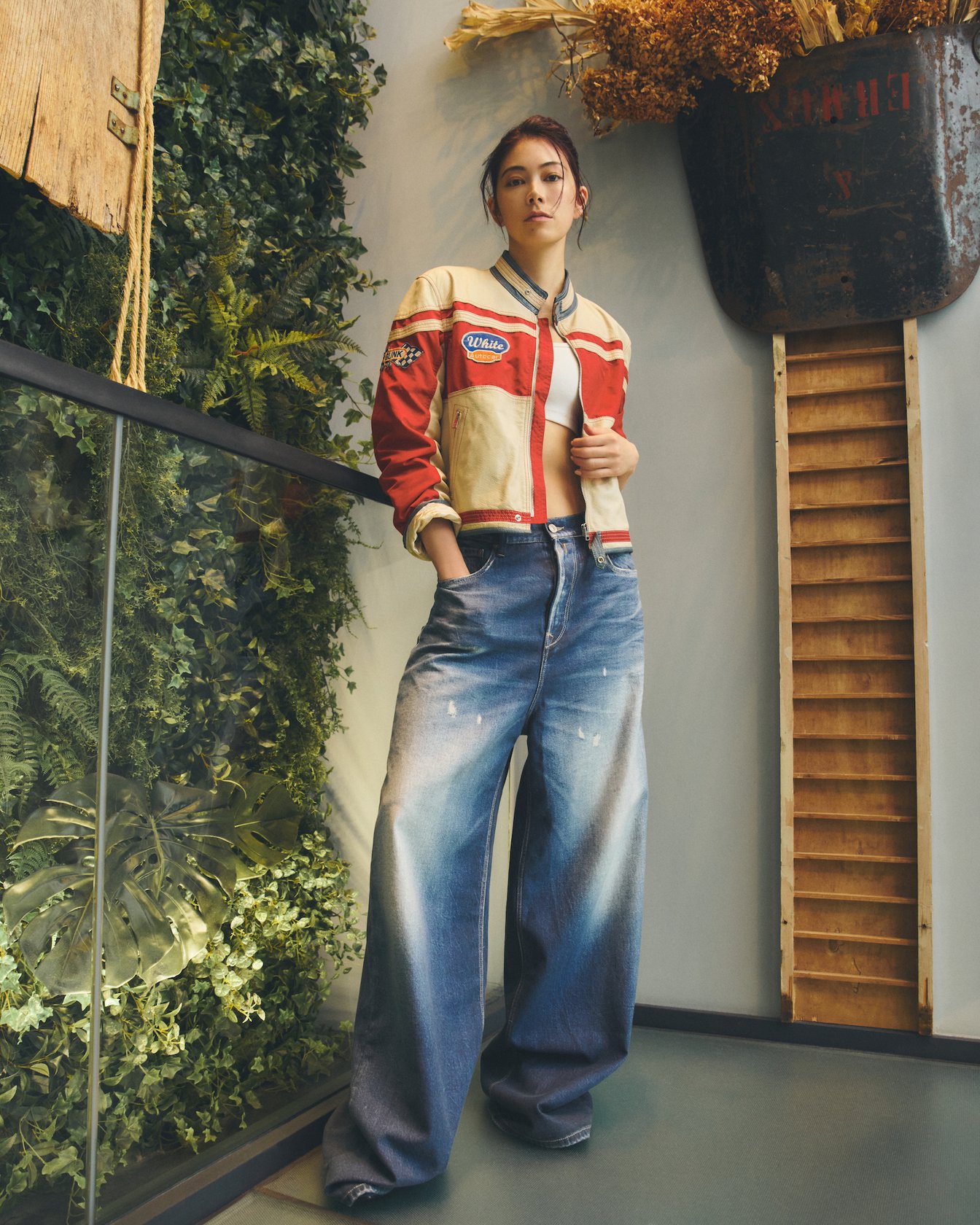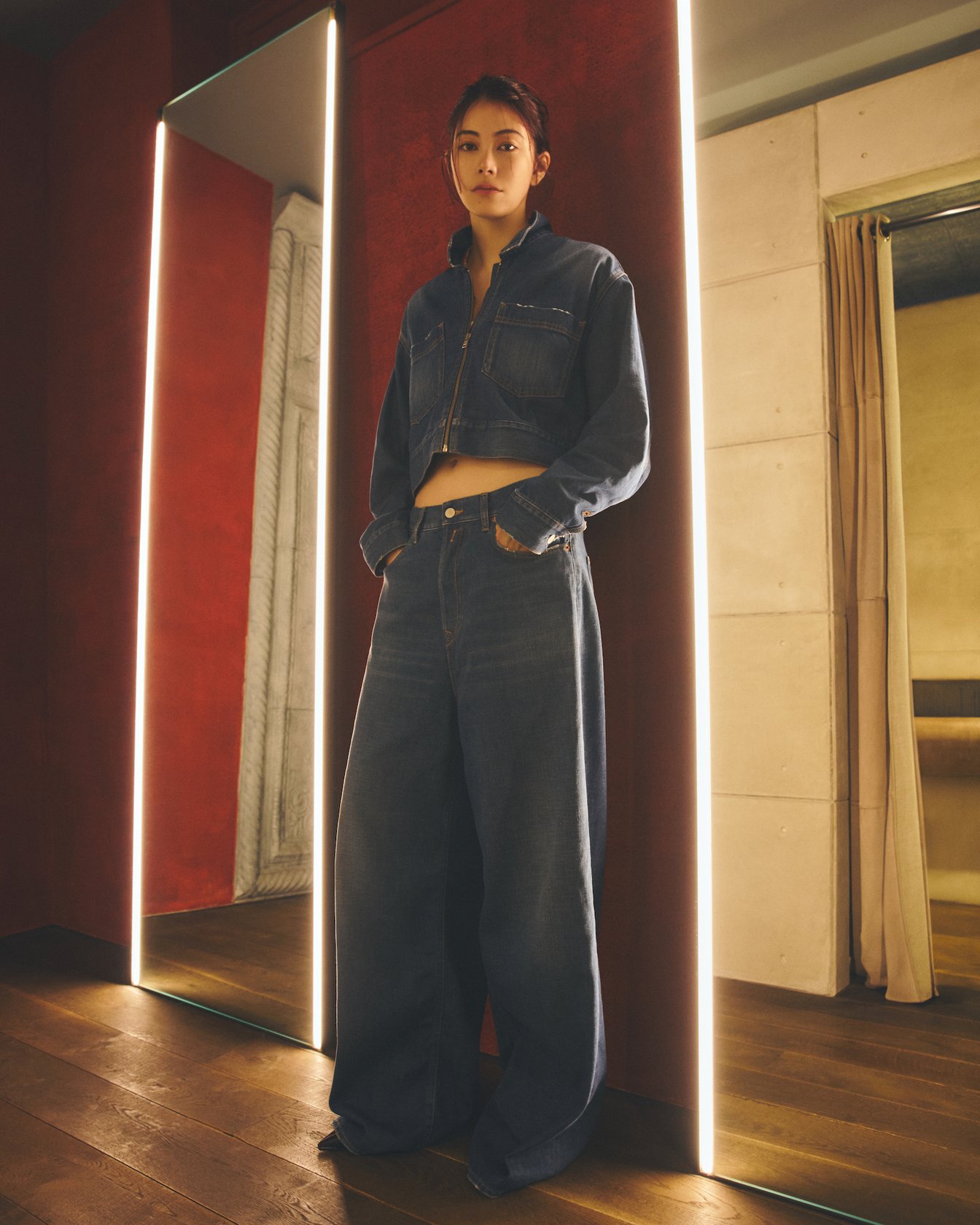 また新たにデビューする「マーゴット(MARGOTT)」は、リラックス感のあるバギーフィットのデニムシリーズ。星さんは、リサイクルデニムに酵素ストーンウォッシュと職人による手作業のダメージ加工を施したバギーフィットジーンズとクロップドジャケットのセットアップを着用。ヴィンテージライクな風合いに、洗練された現代的シルエットが調和した、現代のデニムスタイルを体現している。