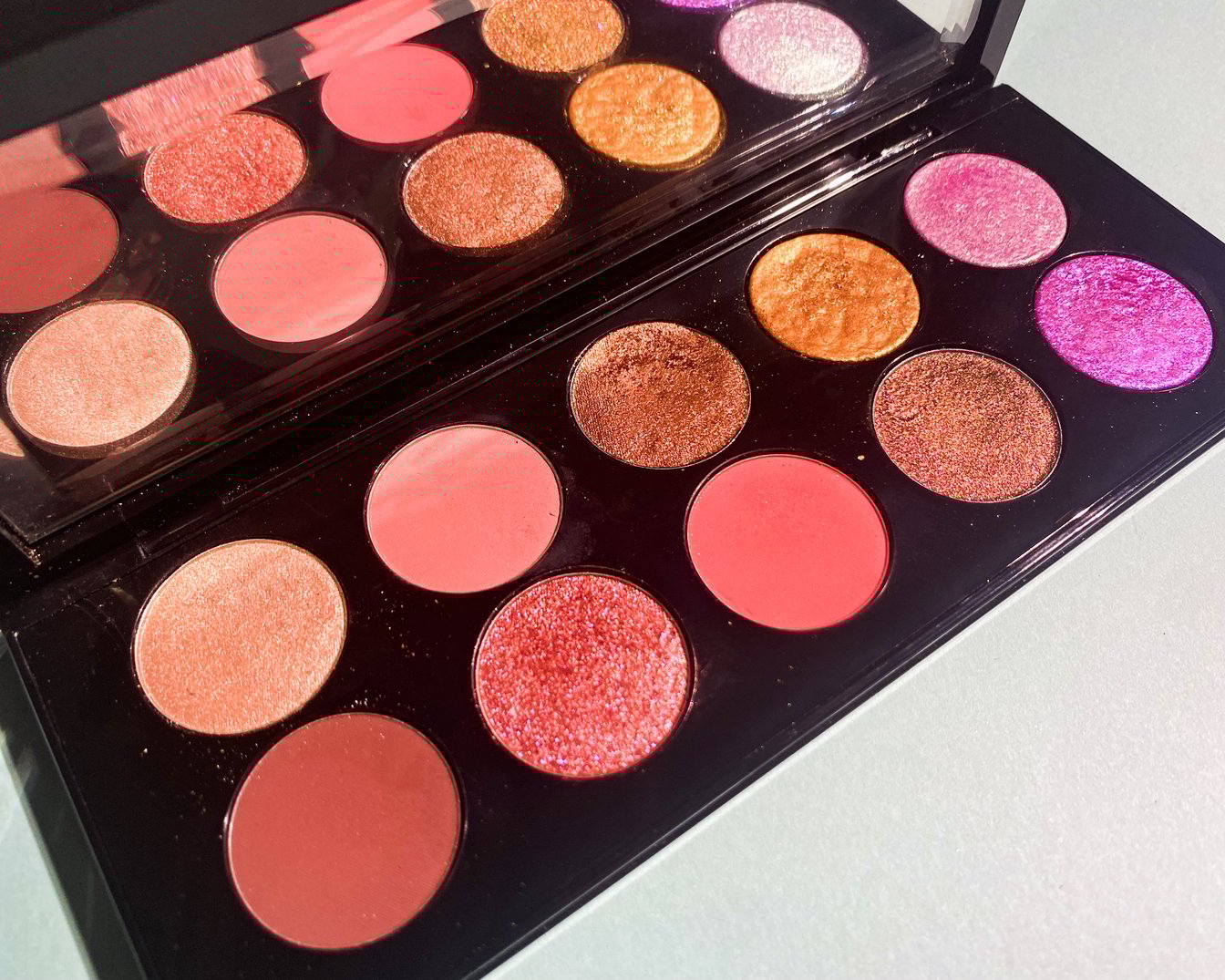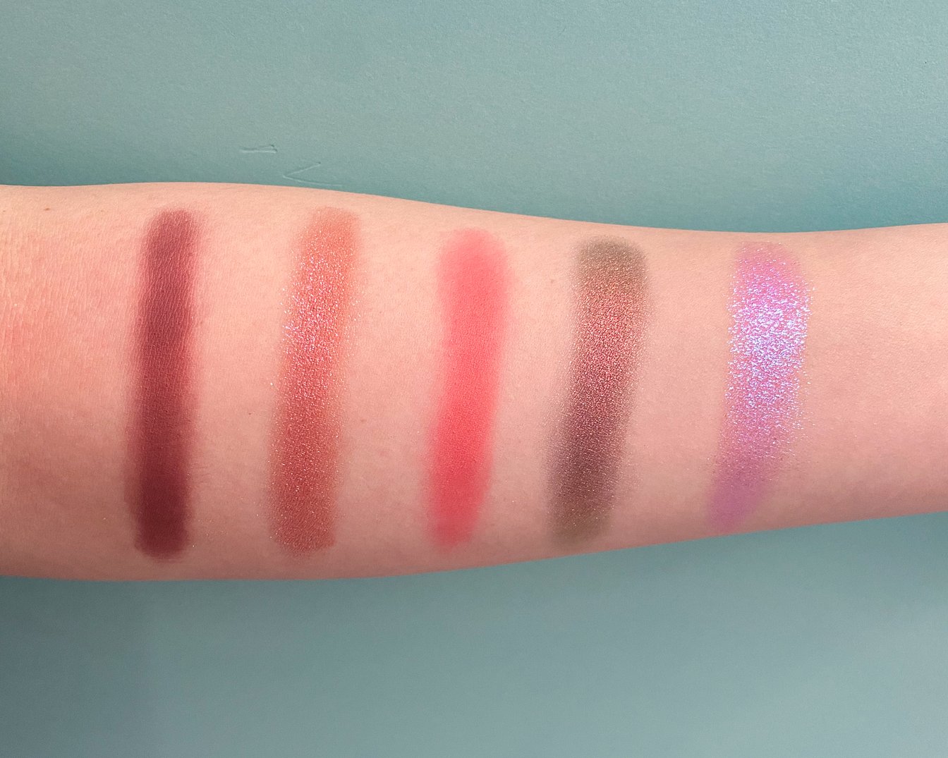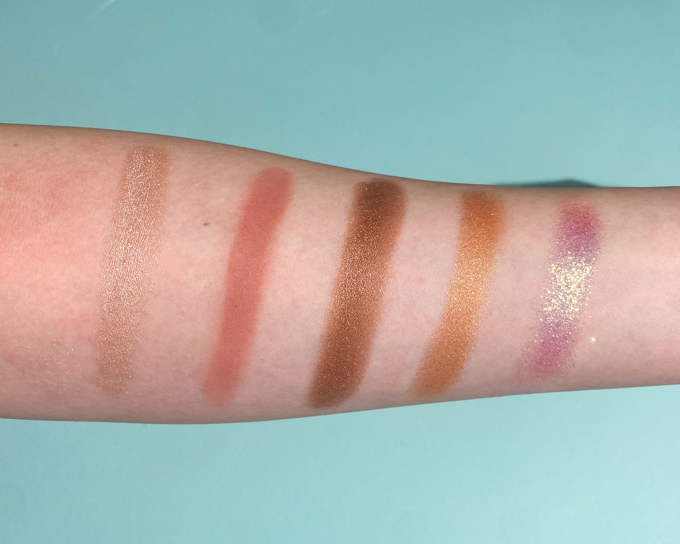なんと言っても上下の右側2色の偏光ラメが最高!あふれんばかりの輝きでゴージャスな目元に。少しざらっとするくらい大粒のラメなので、アイシャドウベースを仕込んだり、水で軽く湿らせたブラシで塗ったりと、落ちないように密着させるのに少しコツが必要でした。上下の左側2色ずつ(計4色)のピンク・ブラウン系カラーの組み合わせはデイリーメイクにも◎