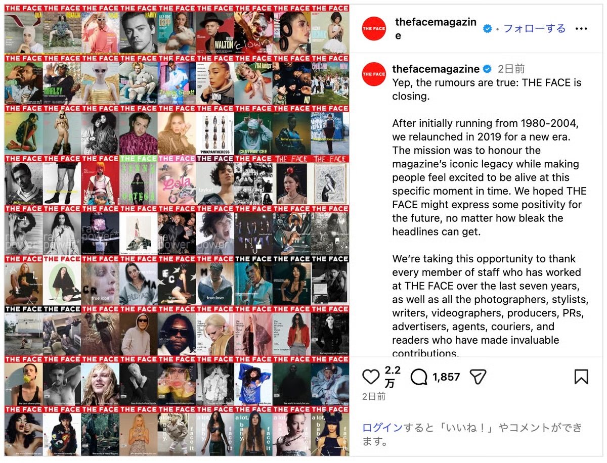 - 英雑誌「THE FACE」が休刊を発表した。今月発行した2026年春号が最終号となる。