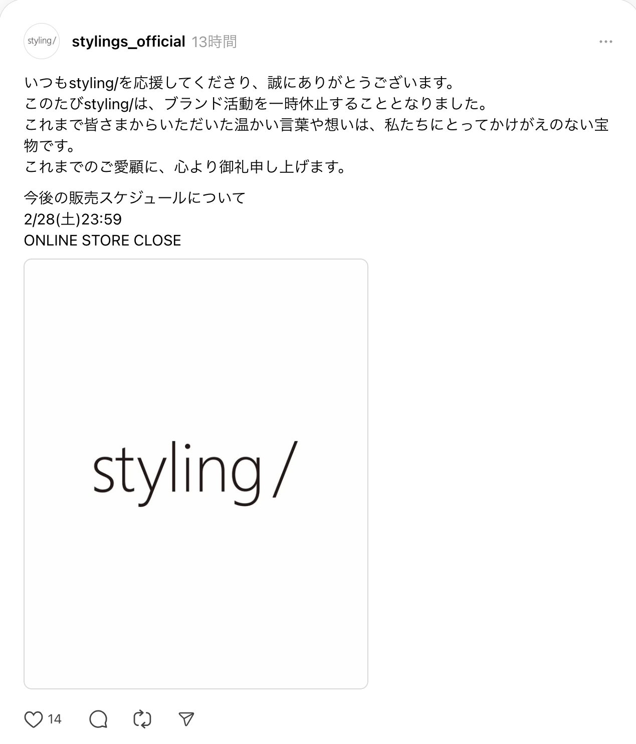 - マッシュホールディングスが展開するセレクトショップ「スタイリング」が、2月28日に公式オンラインストアをクローズし、活動を一時休止することを発表した。