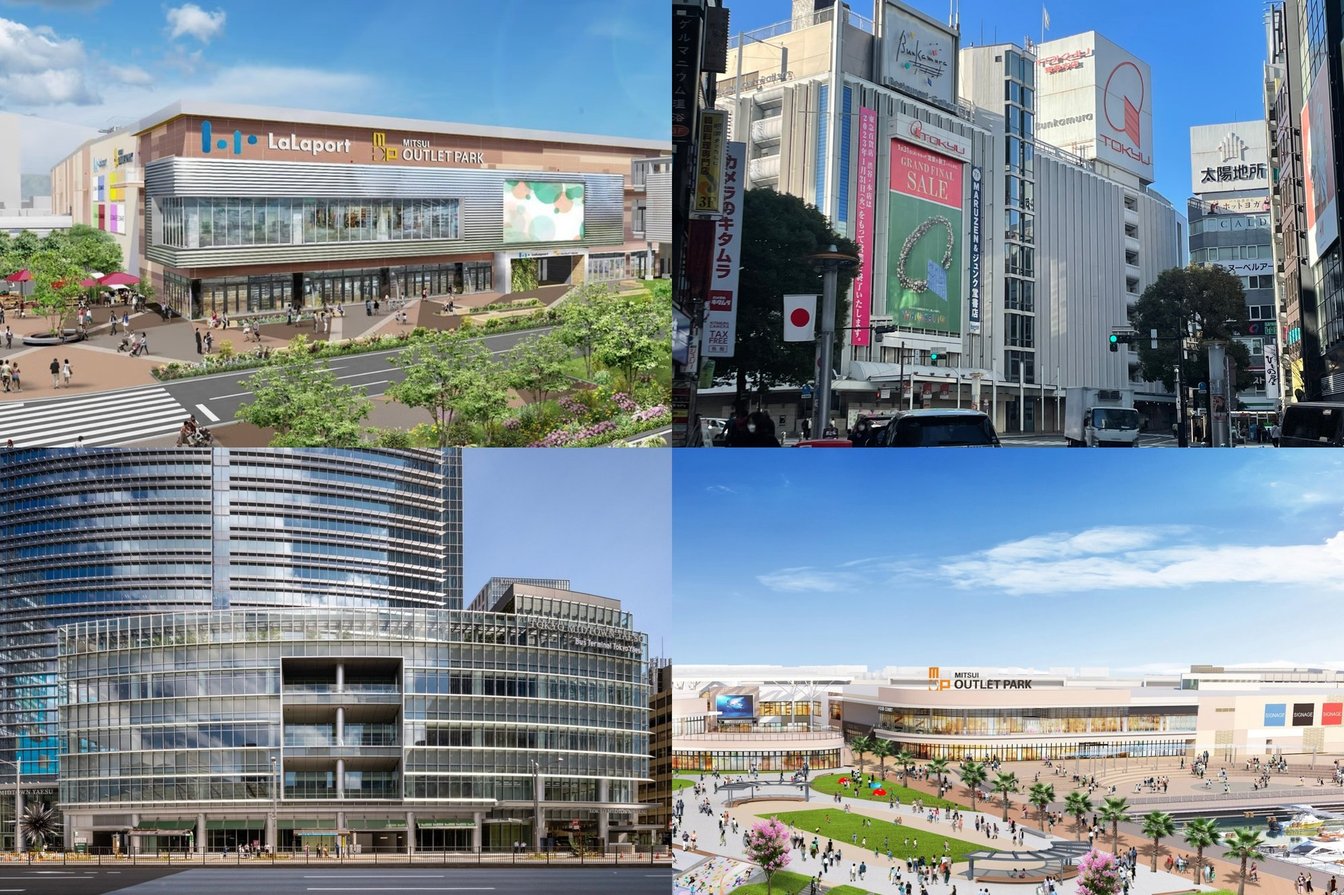 (左列)今年オープンする「三井ショッピングパーク ららぽーと門真」「三井アウトレットパーク 大阪門真」、「東京ミッドタウン八重洲」 (右列)今年営業を終了する「東急百貨店本店」、「三井アウトレットパーク マリンピア神戸」