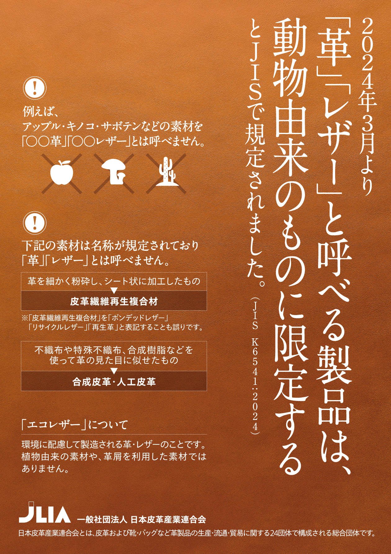 - 一般社団法人 日本皮革産業連合会が、JIS(日本産業規格)で新たに制定された動物由来でない「レザー風」素材を表現する各用語について発表した。