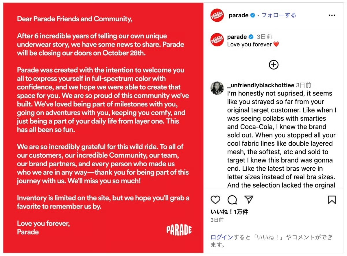- アメリカ・ニューヨーク発の下着ブランド「パレード」が、現地時間10月28日をもってサイトを閉鎖すると発表した。