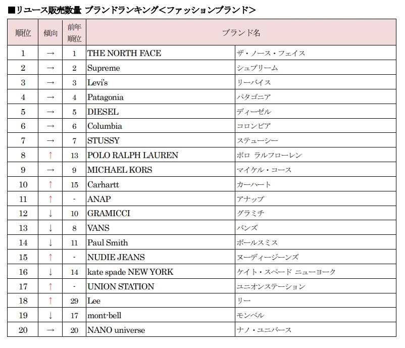 ・「ザ・ノース・フェイス」が2017年から6年連続の1位となり、次いで2位から7位の「シュプリーム」「リーバイス」「パタゴニア」「ディーゼル」「コロンビア」「ステューシー」は、いずれも昨年と同順位だった。