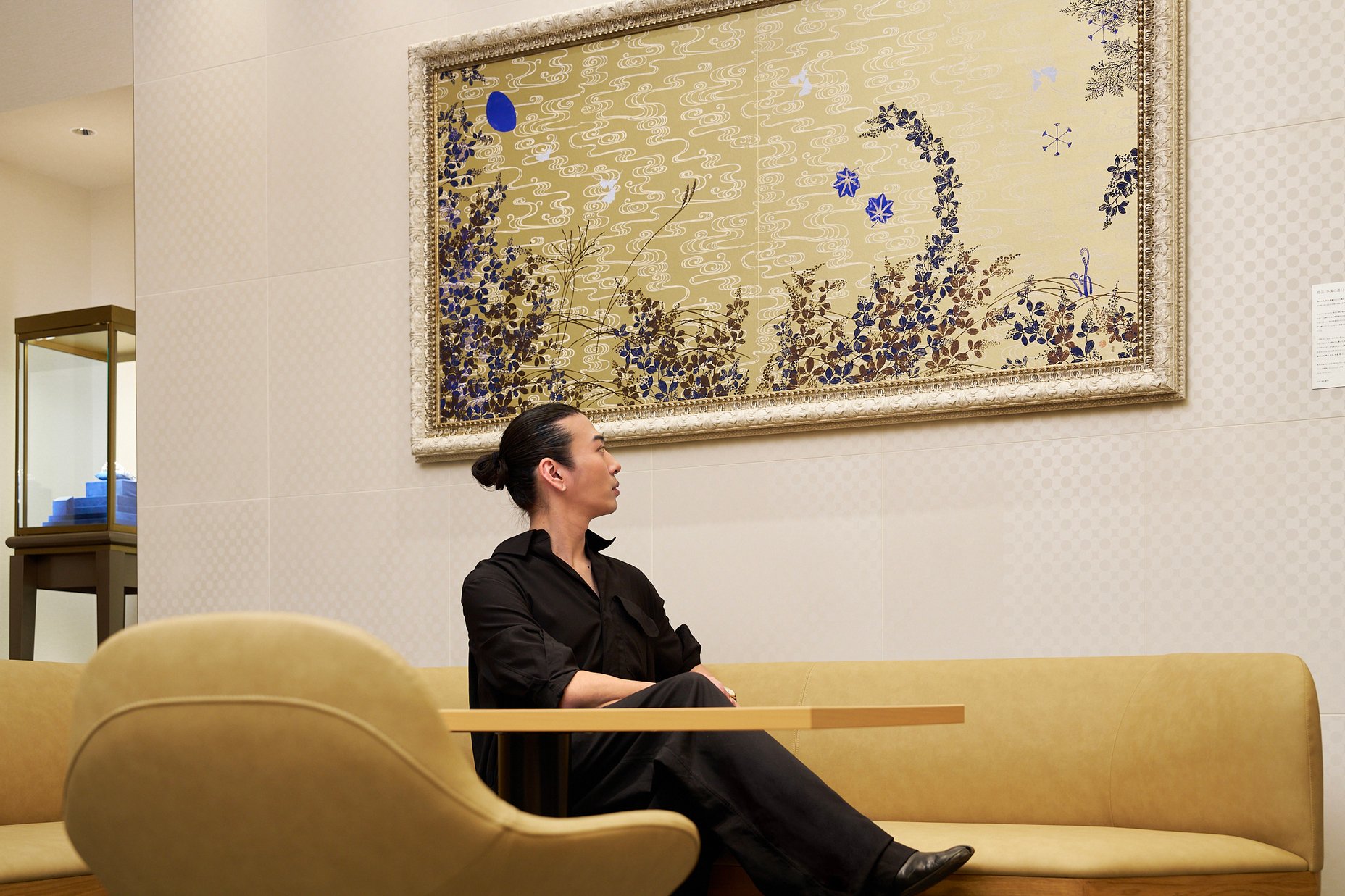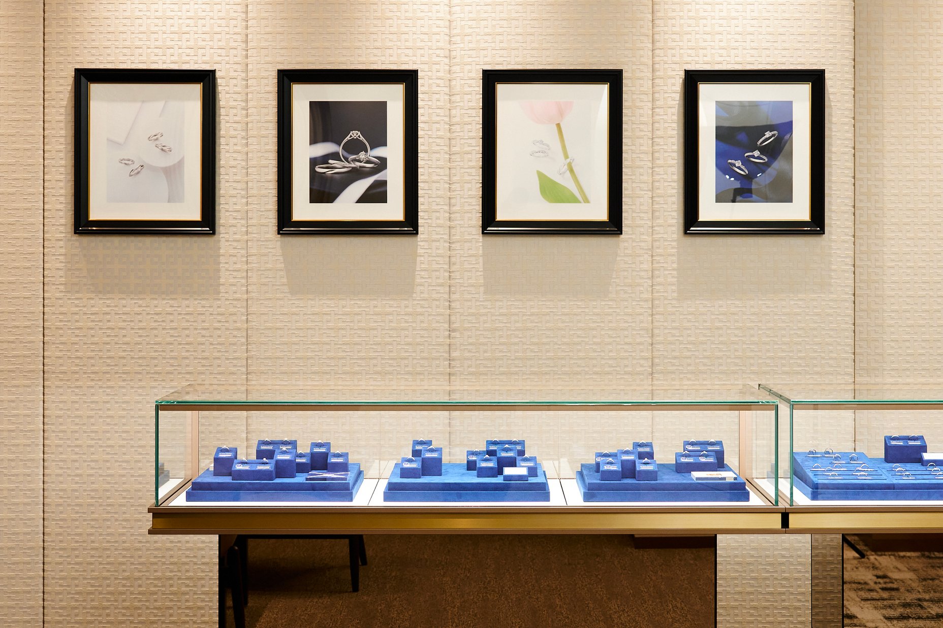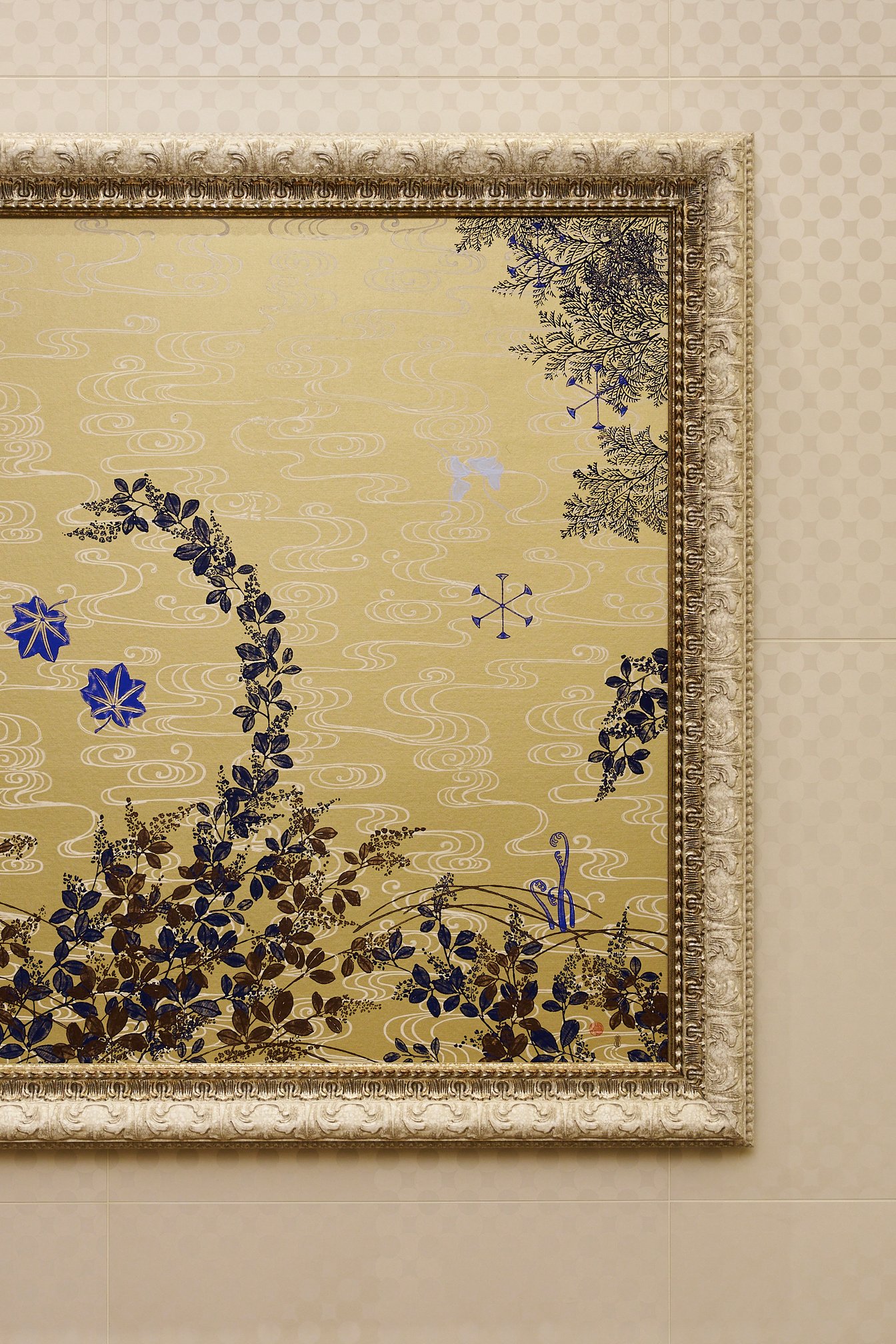 柔らかなゴールドの光に包まれる店内でまず目に飛び込んでくるのは、目の覚めるようなブルーとゴールドの対比が美しいアートワーク。こちらは、京都で寛永元年より続く唐紙の老舗「唐長」とのコラボレーションによるもので、モダンなコンポジションの中には、縁起の良いモチーフである鶴と亀や、四季折々のモチーフが描かれている。壁面に広がる「角つなぎ」の文様は、終わりなき連なりを象徴する意匠であり、家族の幸せが永遠に続くことの願いがこめられている。