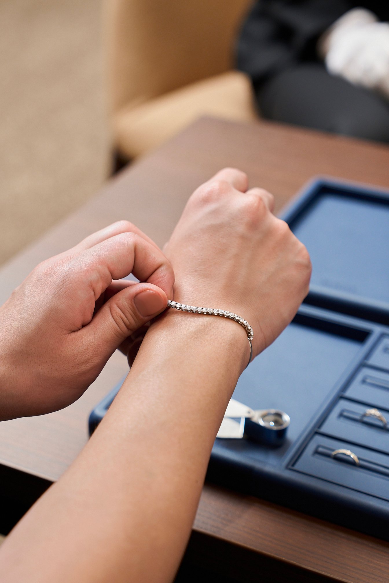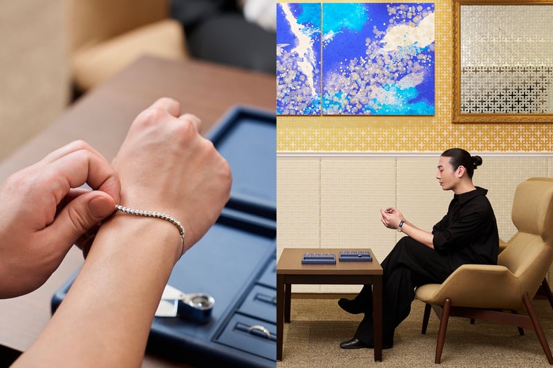 サロンならではのゆったりとした空間で吟味するのは、3月に新たに発表されたラインナップ。ブランドのシグネチャーである「ロイヤル・アッシャー カット」にインスパイアされた、ジオメトリックなシルエットが美しいリングや、個性的な石座のデザインが目を引くイヤースタッズは、ファースト・ファインジュエリーに。眩いばかりのダイヤモンドが連なるテニスブレスレットは、半分がバングルになった個性的なデザインで、手持ちの時計やリングと組み合わせて手もとのスタイリングをぐっと格上げしてくれる。