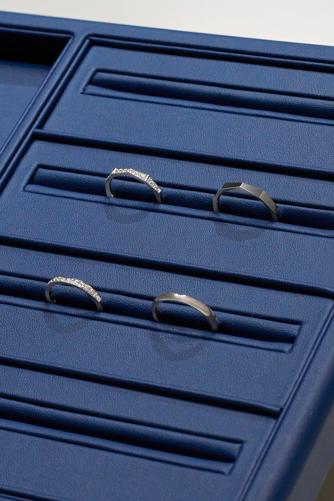 ロイヤル・アッシャーのフルラインナップを展開する「銀座並木通りサロン」だが、中でも圧巻なのはずらりと並ぶソリテールリング。ブランドのアイコンであるクラウン(王冠)を模した石座のデザインや、アームの仕上げまで、ダイヤモンドの個性を最大限に引き立てるデザインのバリエーションに驚かされる。