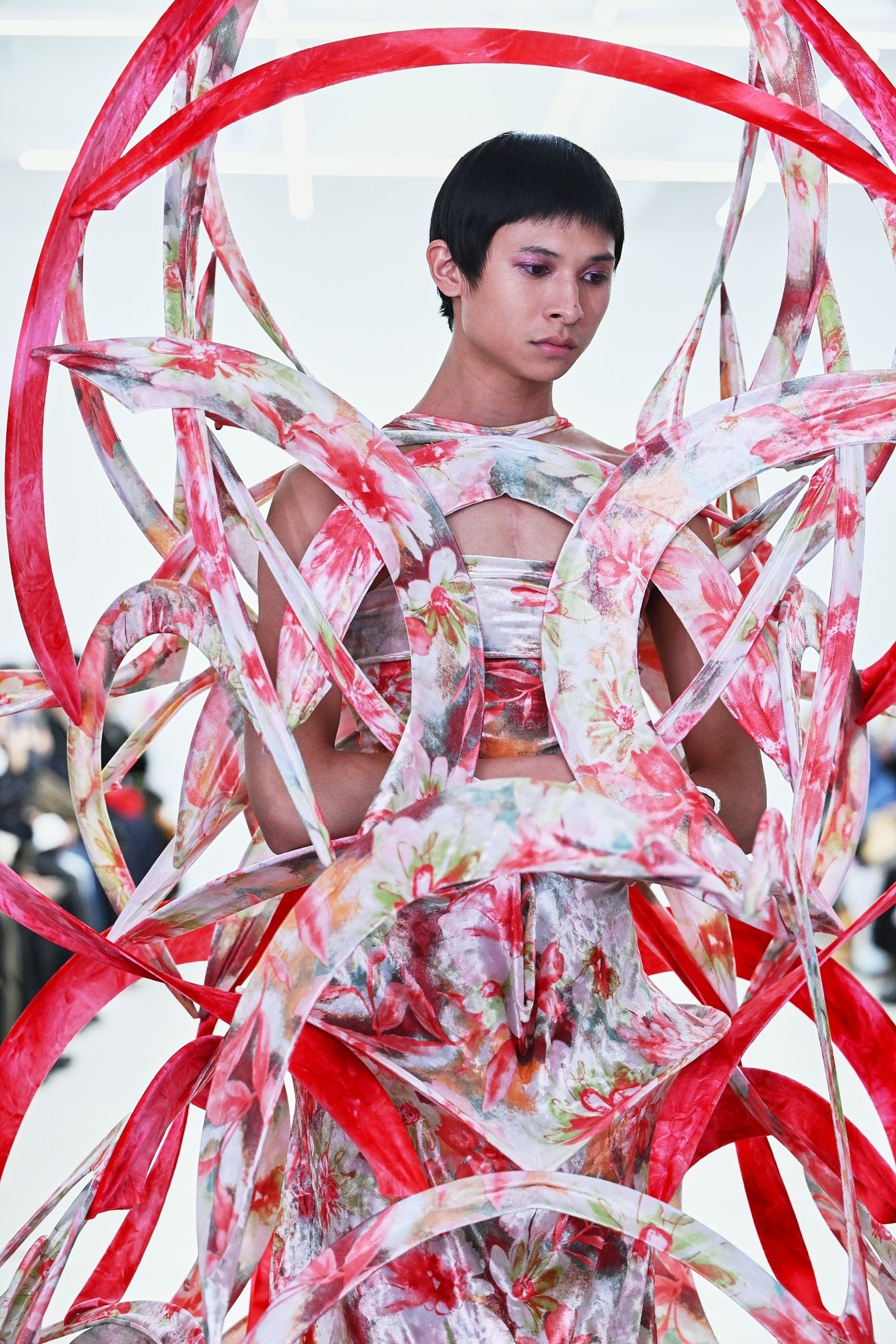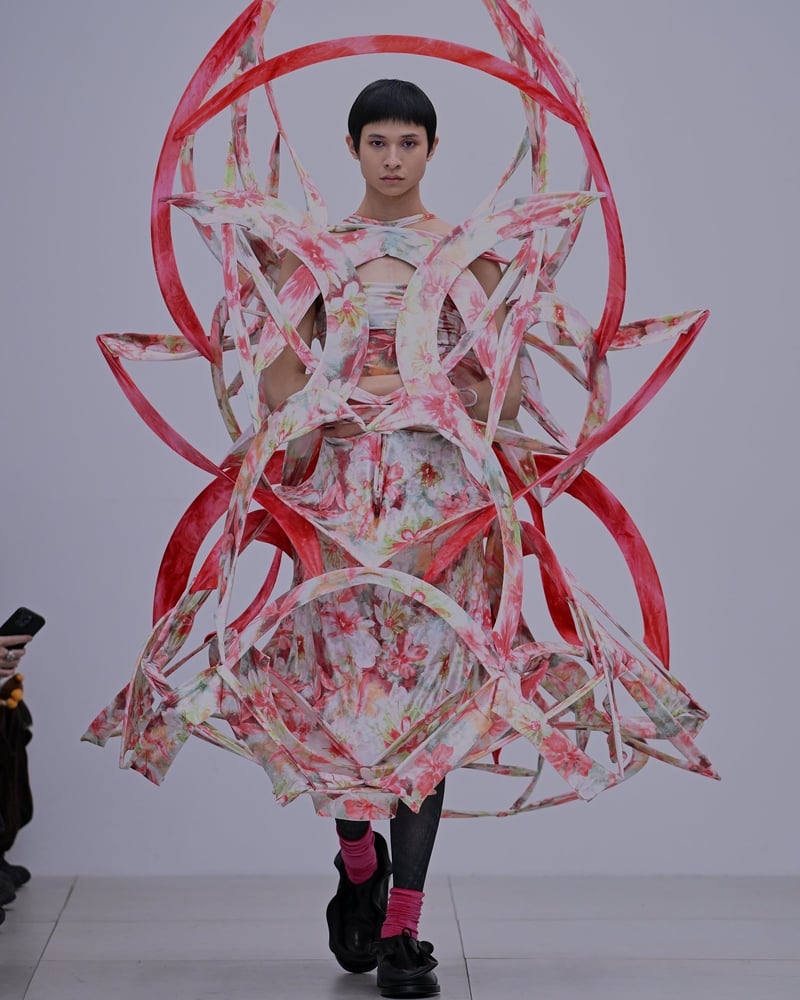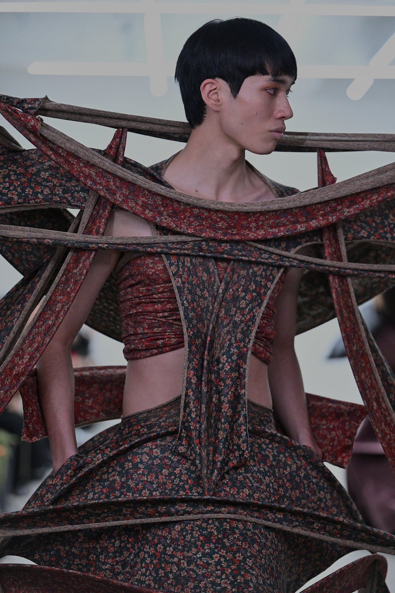 プリントという人工的な要素が加わったコレクションは、神聖さや畏怖、呪術性といったリュウノスケオカザキのコレクションを取り巻く空気感に、「人間臭さ」をにじませた。グラフィックとして改造された花のモチーフは、どこかグロテスクなムードすらあるが、スカルプチュアルなドレスが持つ構造的な美しさと、絶妙なバランスで調和。岡﨑自身も、最初は「誰がこんな生地を使うんだ」とネガティブに感じた柄を敢えて採用したそうで、手が素材に慣れ、造形が生まれるうちに愛着が湧いていったのだというから面白い。