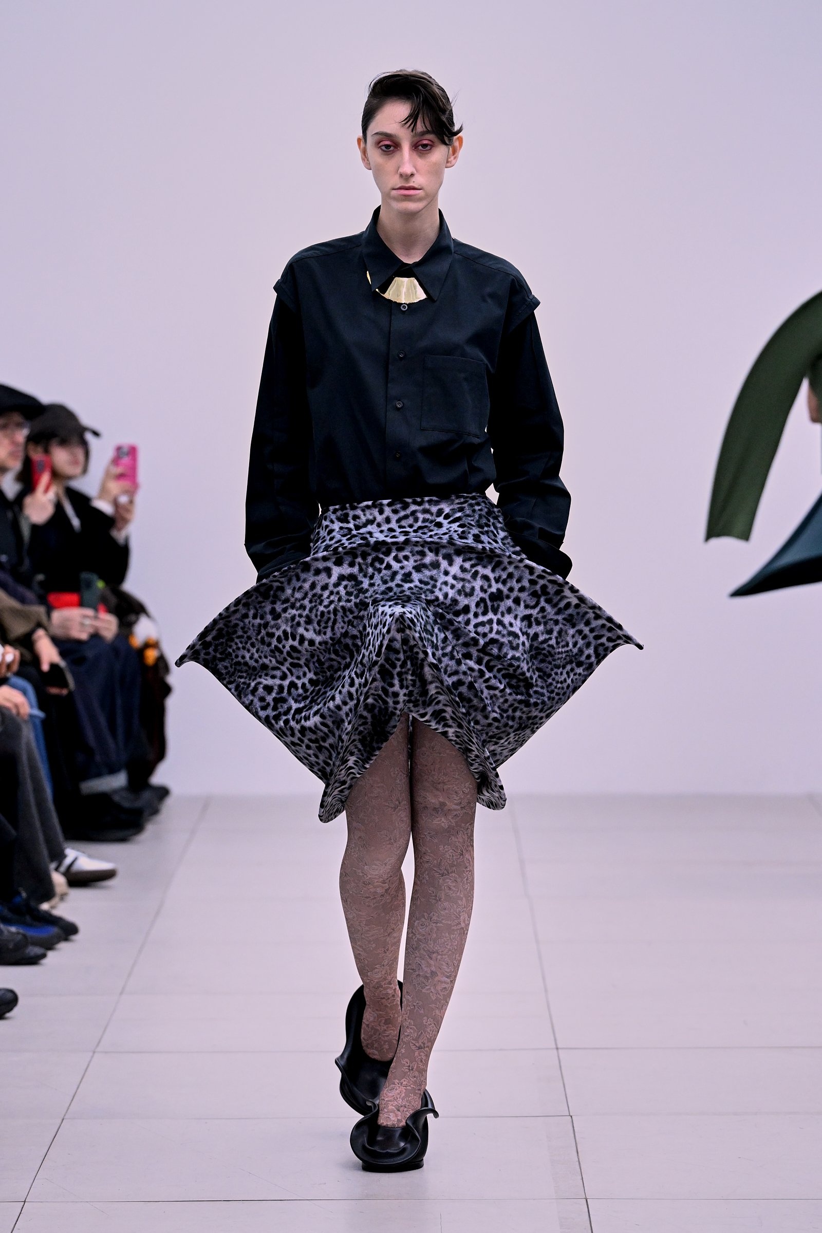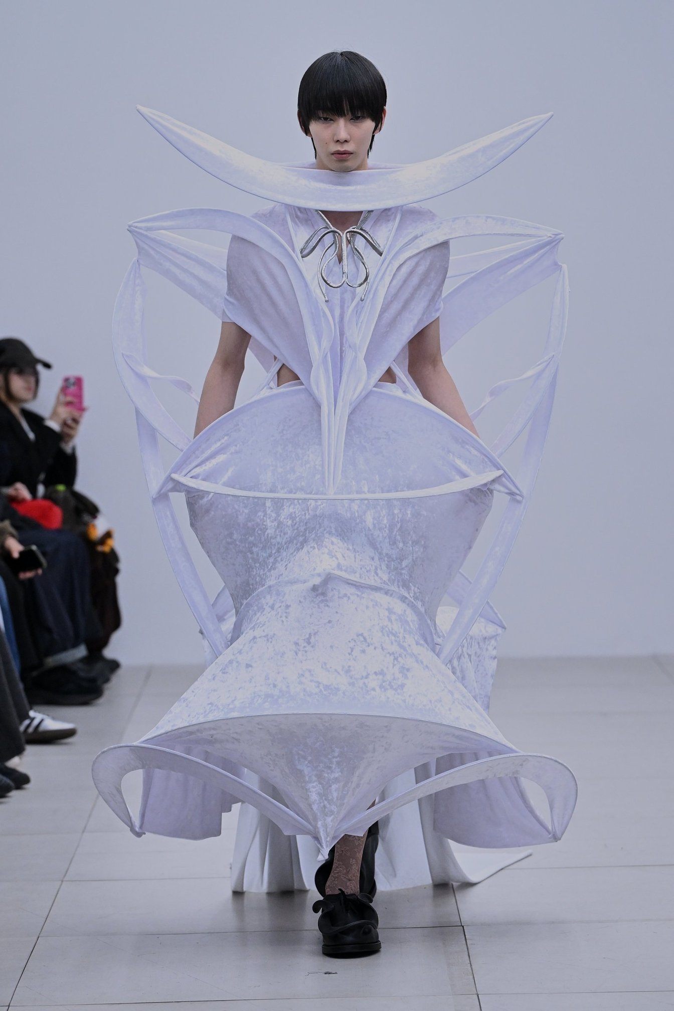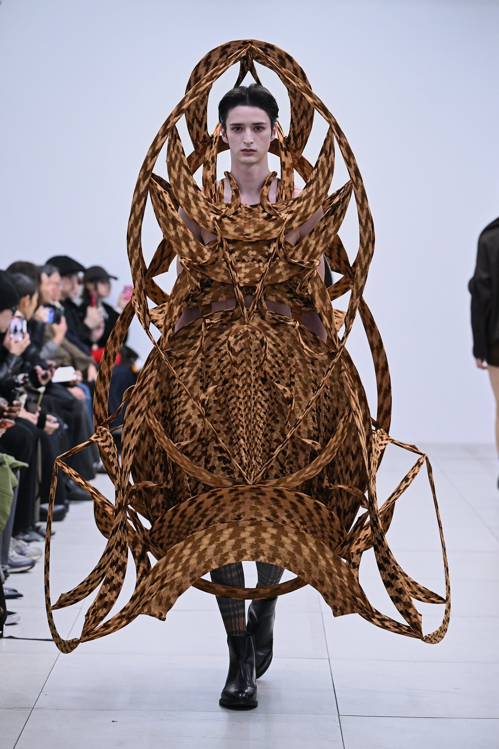 プリントという人工的な要素が加わったコレクションは、神聖さや畏怖、呪術性といったリュウノスケオカザキのコレクションを取り巻く空気感に、「人間臭さ」をにじませた。グラフィックとして改造された花のモチーフは、どこかグロテスクなムードすらあるが、スカルプチュアルなドレスが持つ構造的な美しさと、絶妙なバランスで調和。岡﨑自身も、最初は「誰がこんな生地を使うんだ」とネガティブに感じた柄を敢えて採用したそうで、手が素材に慣れ、造形が生まれるうちに愛着が湧いていったのだというから面白い。