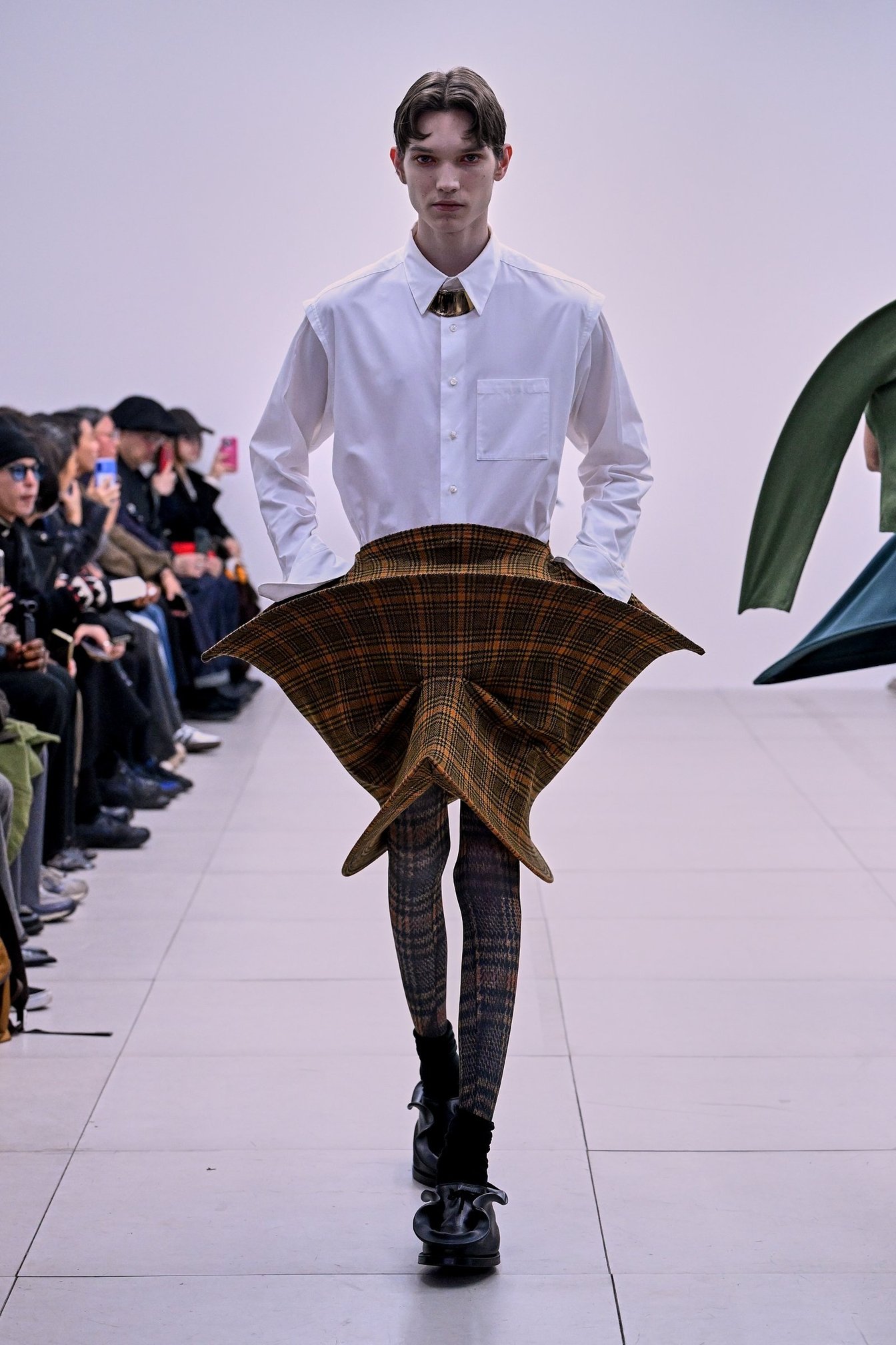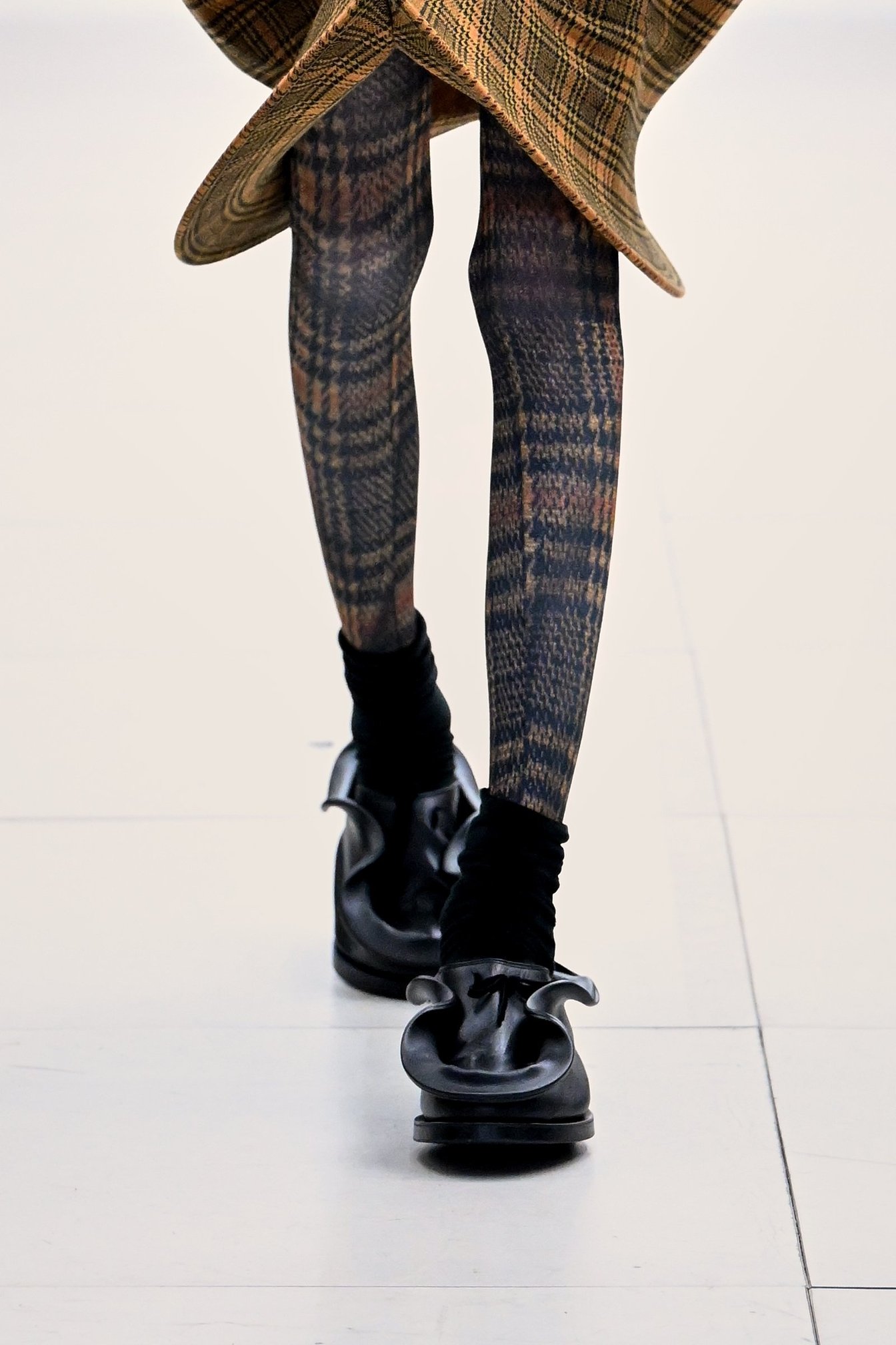 模倣と創造の探求はレッグウェアにも踏襲。チェックやパイソンなどの服を着た時の折れ目や歪みを残したまま拡大し、タイツに複写。「模倣を模倣する」という実験的なアプローチは、足元に躍動感を与えていた。