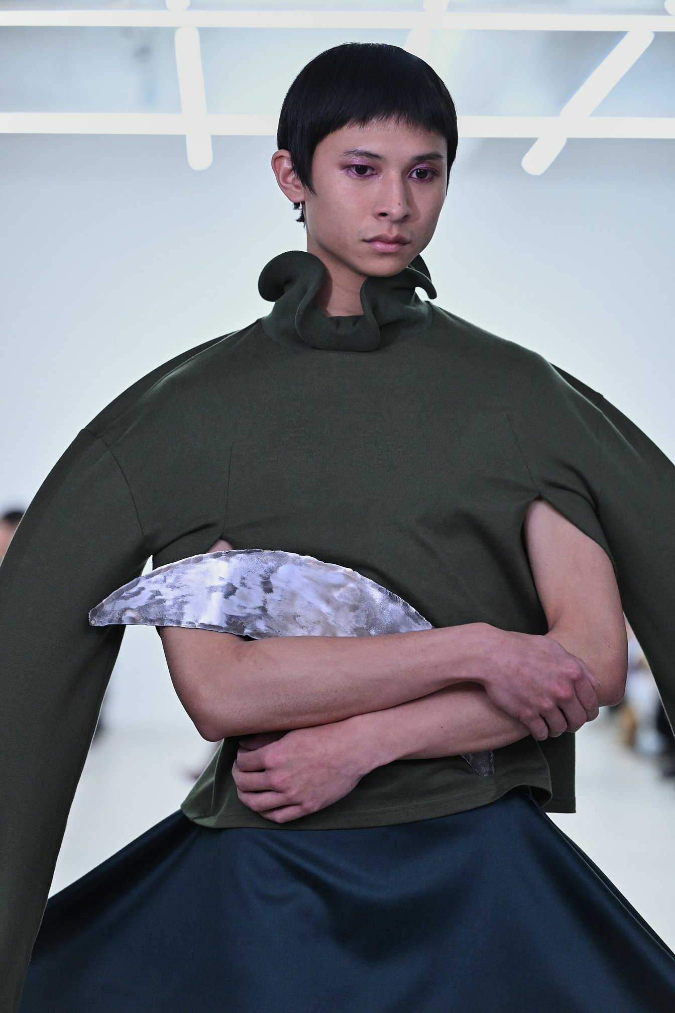 鉄器や祭祀に用いられる神具を彷彿とさせるオブジェやヘッドピース、ネックレスといったアクセサリーは、岡﨑と同窓である東京藝術大学生のアーティスト辻一徹とのコラボレーションによるもの。