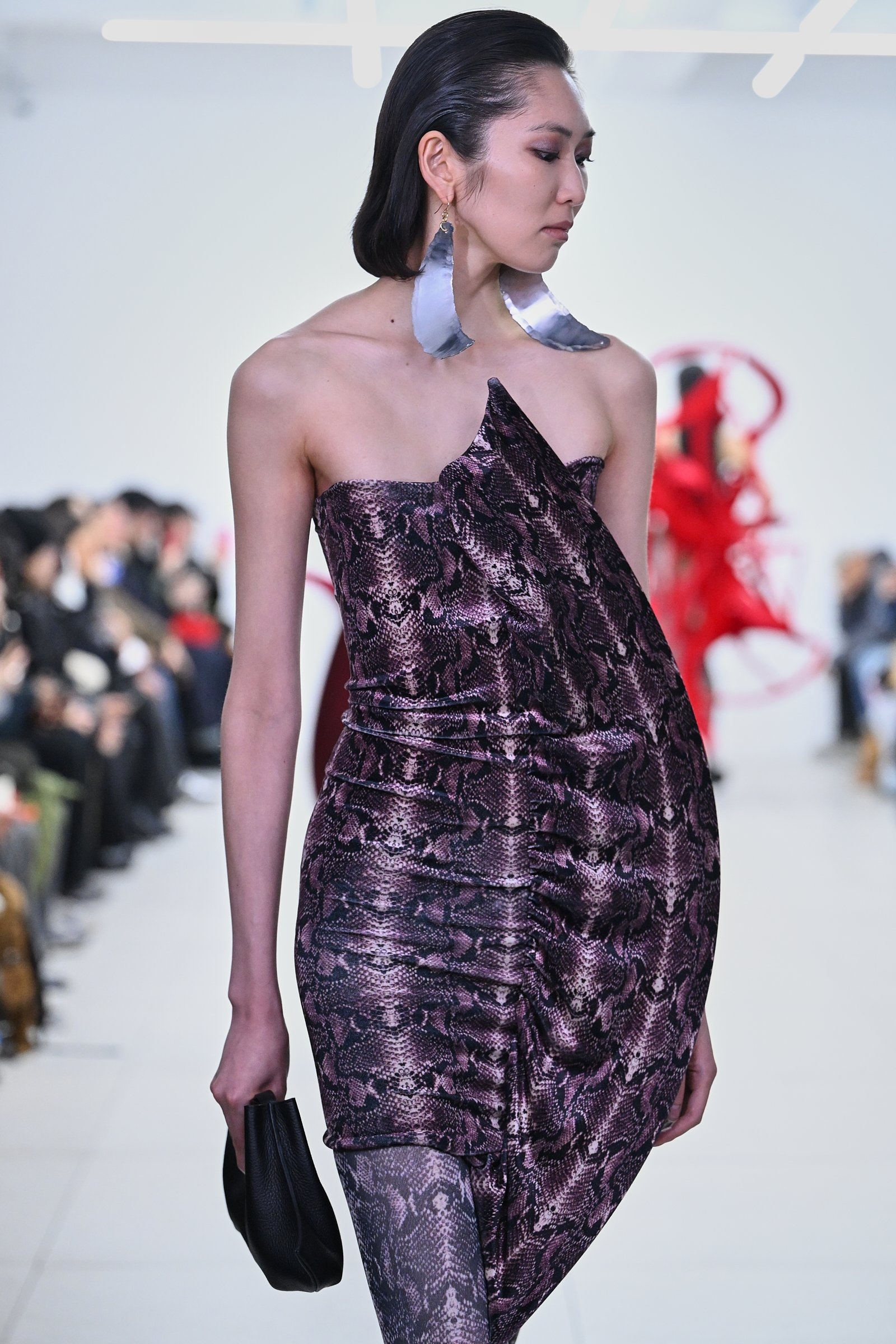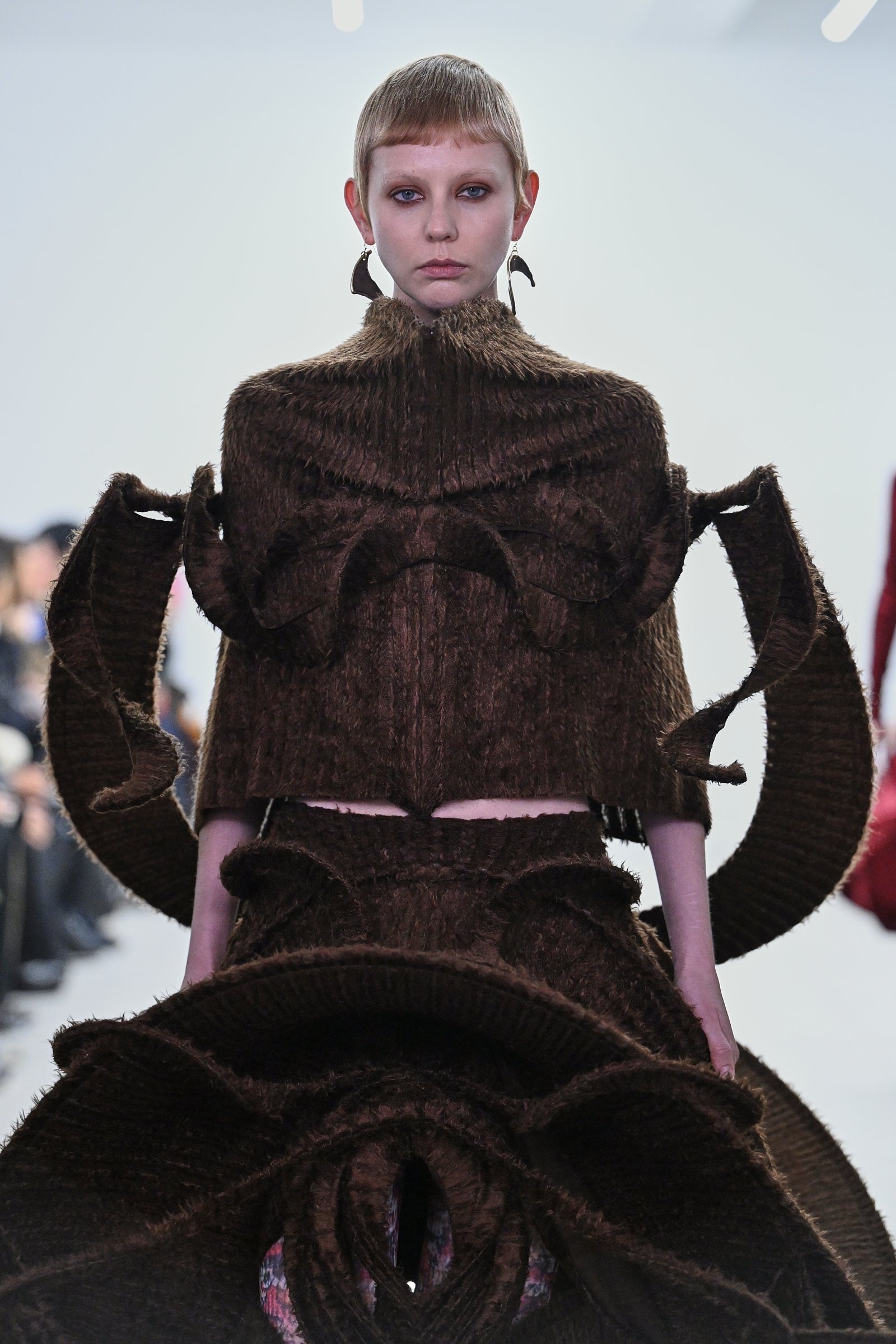 テキスタイルは、レオパードやパイソンといったプリント柄も登場したほか、毛皮を思わせる起毛素材も取り入れた。岡﨑のドレスは造形の印象よりも随分と軽く、モデルが歩くたびに弾むのが特徴。これらのテキスタイルが揺れる様は、今まで以上に生物的な力を宿していた。