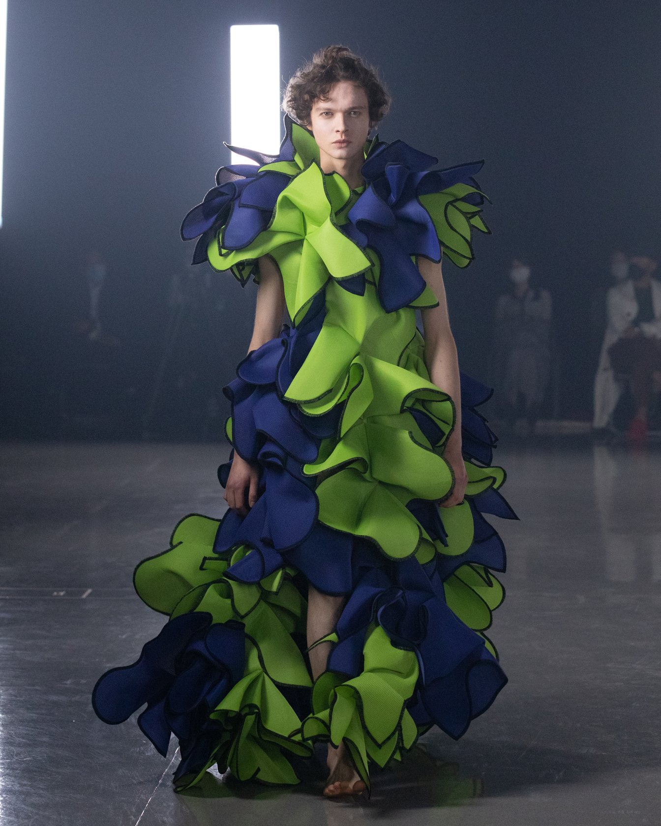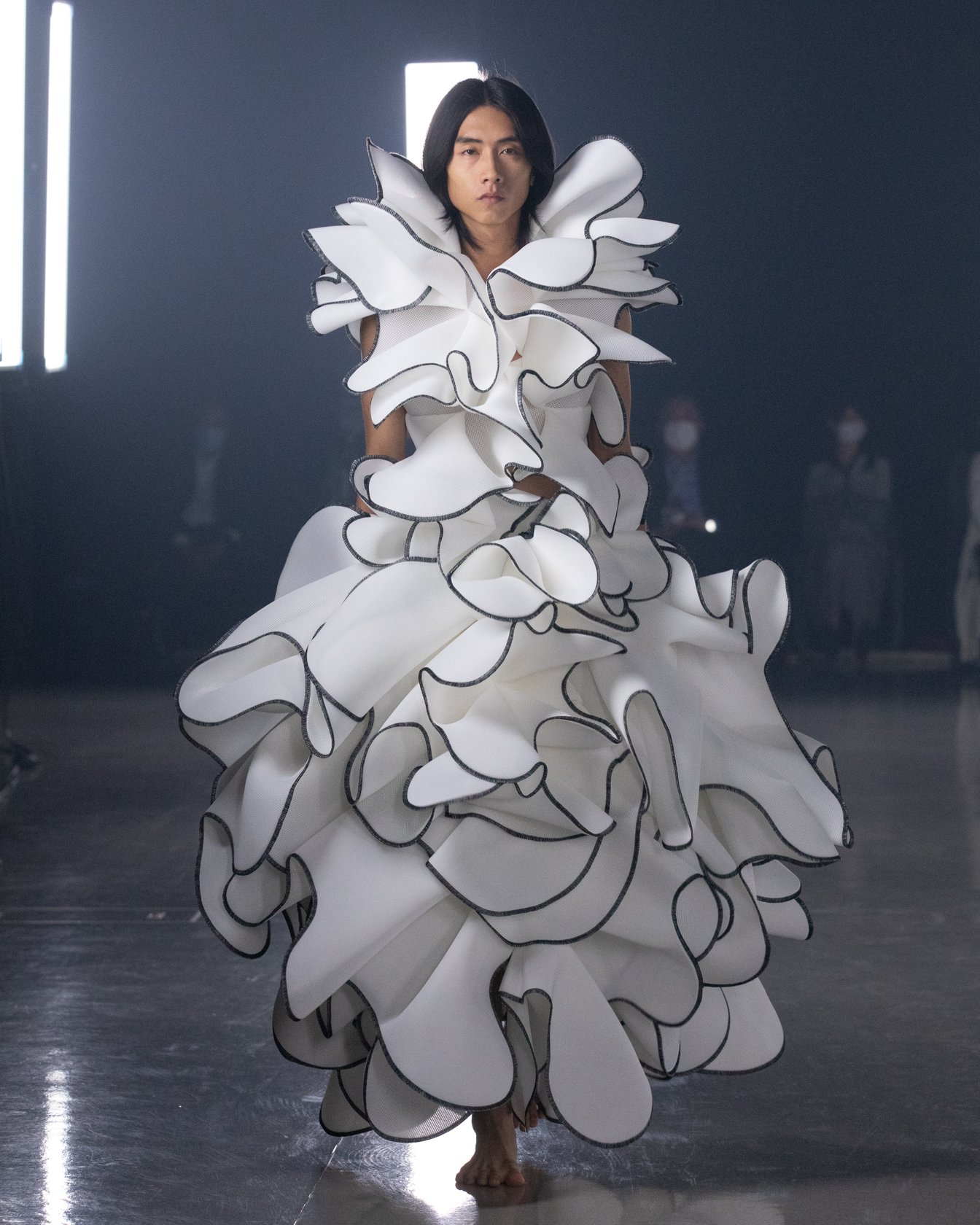 岡崎は2021年6月に「JOMONJOMON」を含む作品の個展を開催している。その際に発表されたドレスは、身体に纏われることはなく、高い台の上で静置されていた。人々が見上げるような形で展示されていたJOMONJOMONはさながら祭壇のような様相。今回、モデルによって着用され揺れ動いたJOMONJOMONは、祭壇で祀られていた神のようにも見える。