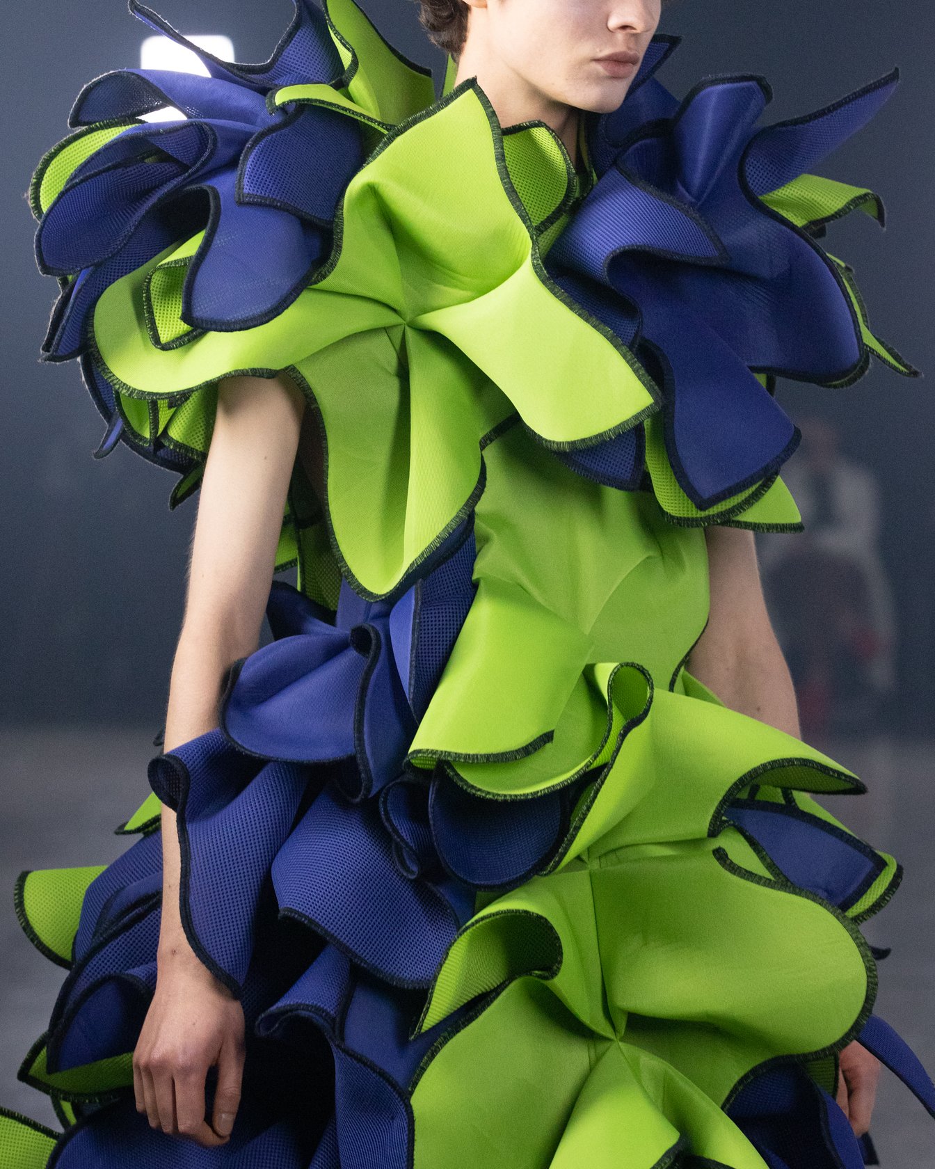 現実世界には、絵画における実線のような輪郭は存在しないが、人間は対象を認識する時に輪郭を必要とする。自然崇拝の観点から製作されたという「Nature's Contours」の花弁のような造形は、ハリのある厚手のメッシュ素材を黒く縁取り、本来自然界には存在しない「輪郭」を思わせる。曲線的で有機的なアウトラインは、ロックミシンによって強調されている。