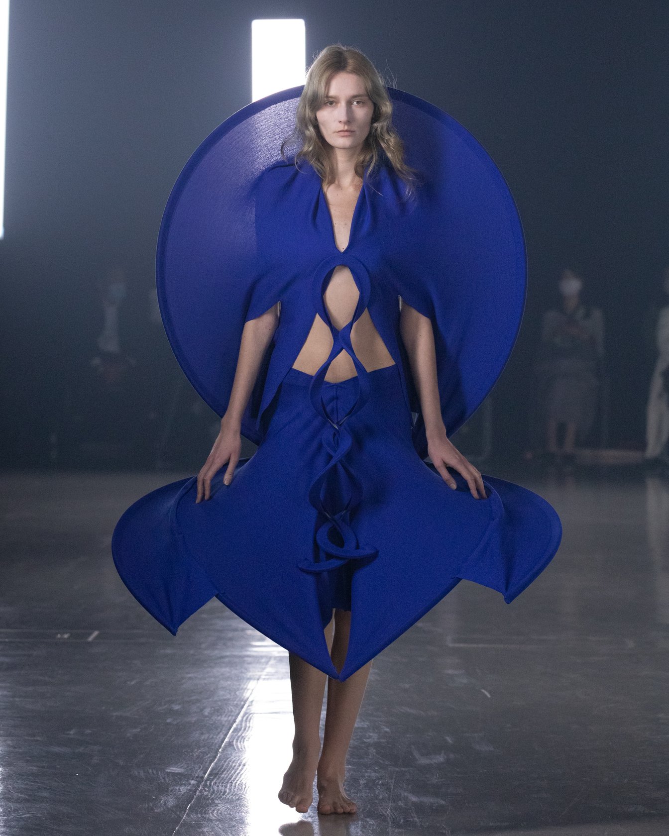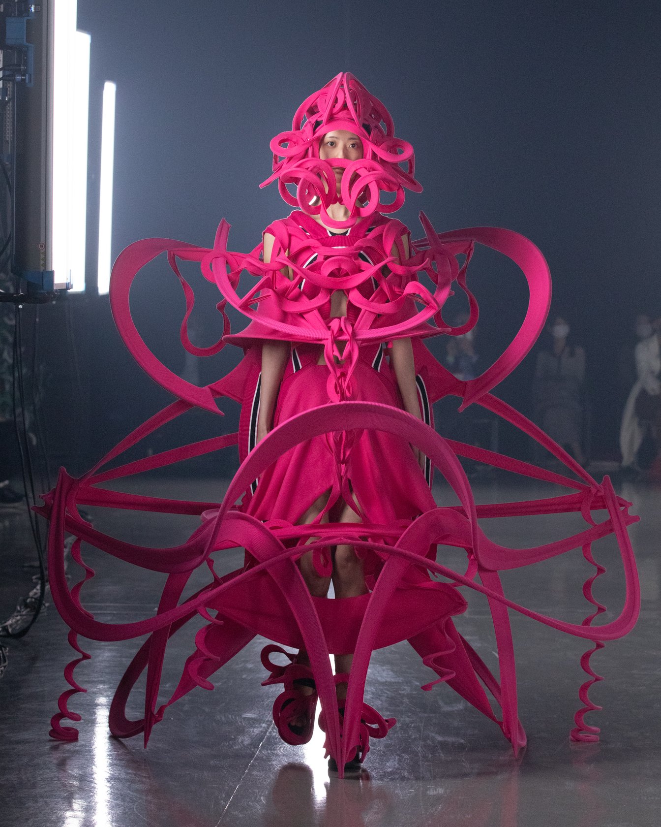 そうして作られた「JOMONJOMON」はデザインのバリエーションが豊かである。縄文土器の波状や、突起を彷彿とさせる立体的な造形を基本に、臀部や頭部が土偶のように大きく膨らんだドレスや、身頃が身体に密着しながらも肩口が反り返り鋭利になっているトップスなど様々なデザインが披露された。同アイテムにおいて特に興味深いのは、ドレスに用いられている素材だ。リブ素材や軽量ニットなどの、伸縮する特性を持つファブリックに、ボーンテープや芯糸が織り込まれたドレスは、モデルが歩く度に上下にバウンドする。