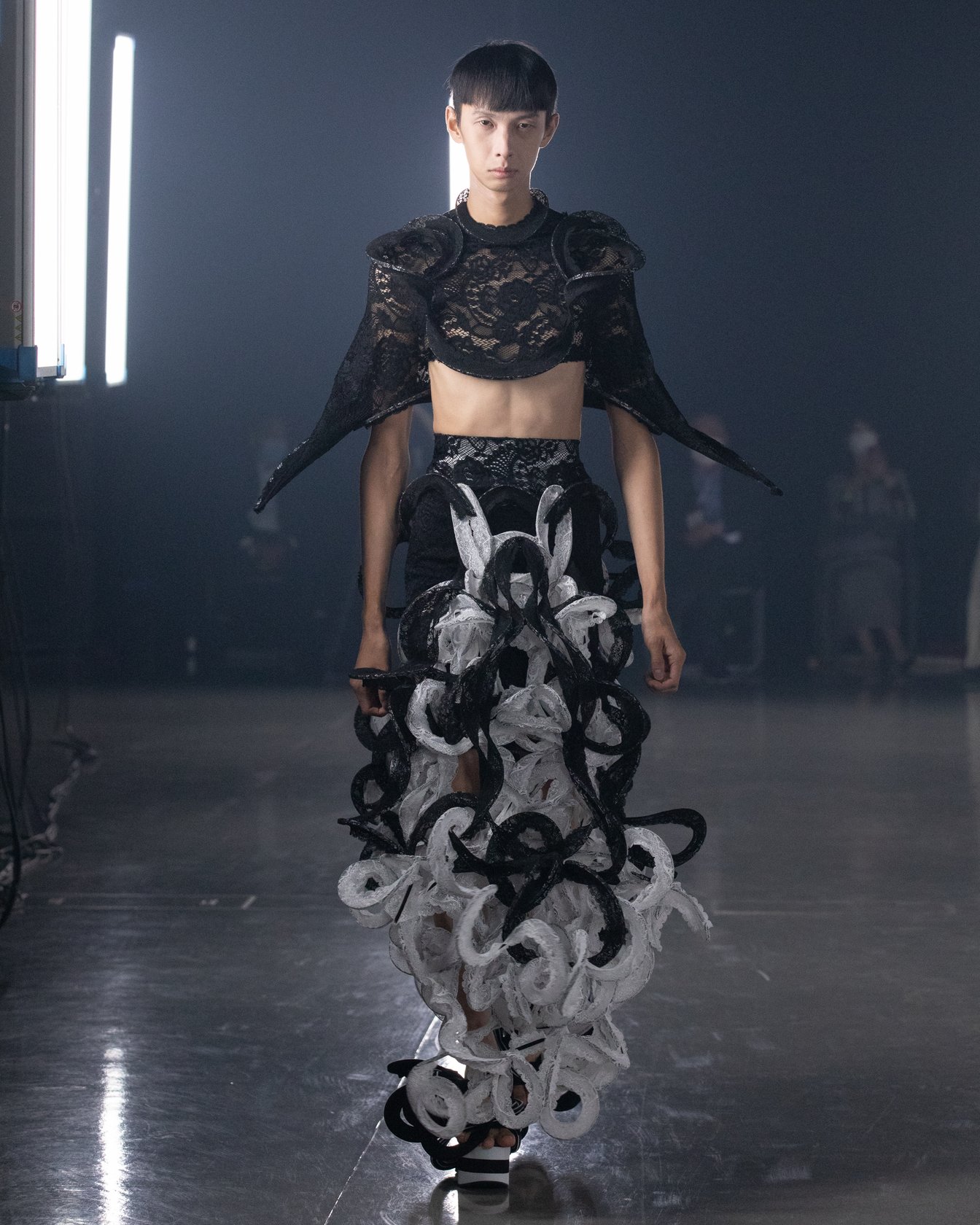 東京藝術大学大学院美術学部デザイン科を首席で卒業したデザイナー岡﨑龍之祐による、「リュウノスケオカザキ(RYUNOSUKEOKAZAKI)」初のファッションショー「000」は、広義の意味での「デザイン」における造形美を再び考えさせられるショーとなった。着るための必要美を超えた領域にある「絶対的な美しさ」がそこにはあった。