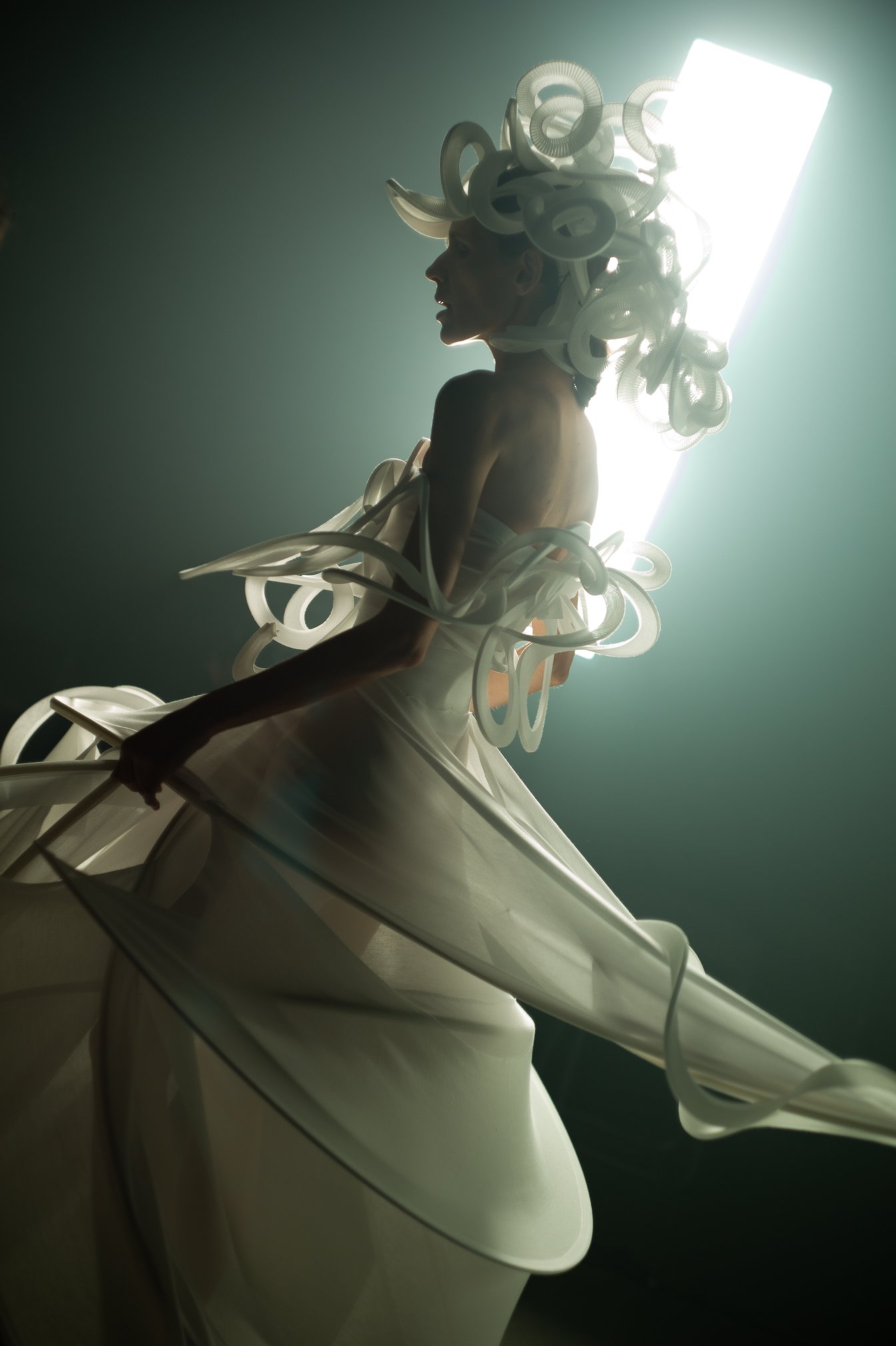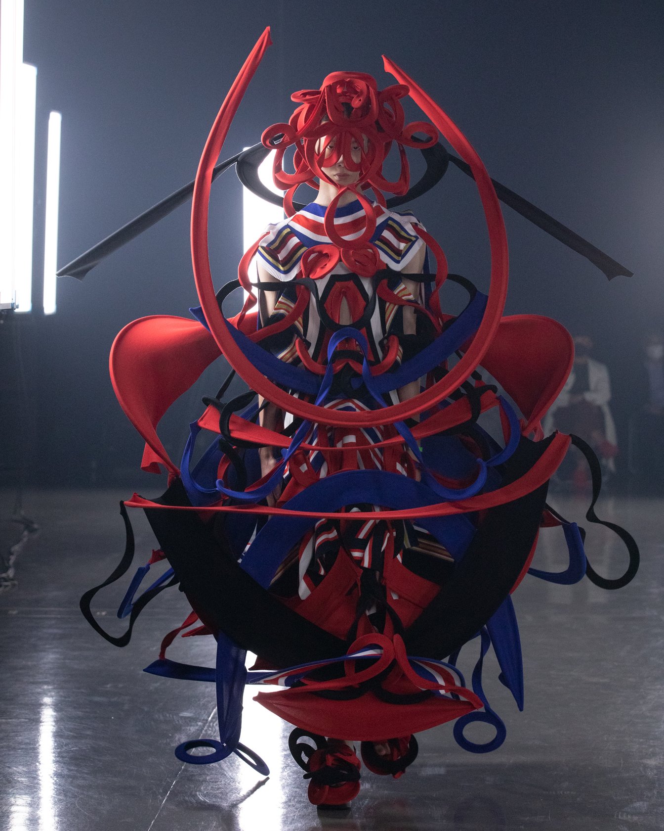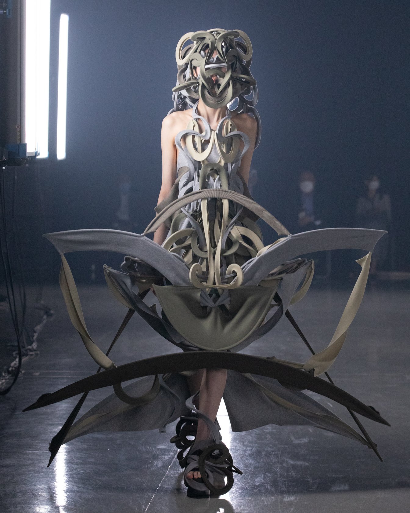 岡崎は、花弁や昆虫のような造形を人がまとうことで「自然を内包し、自然に擬態し、自然に還っていく循環を表現したかった」と話した。