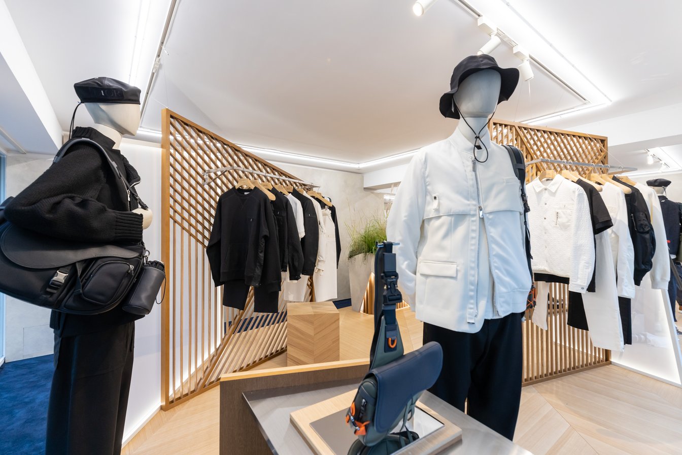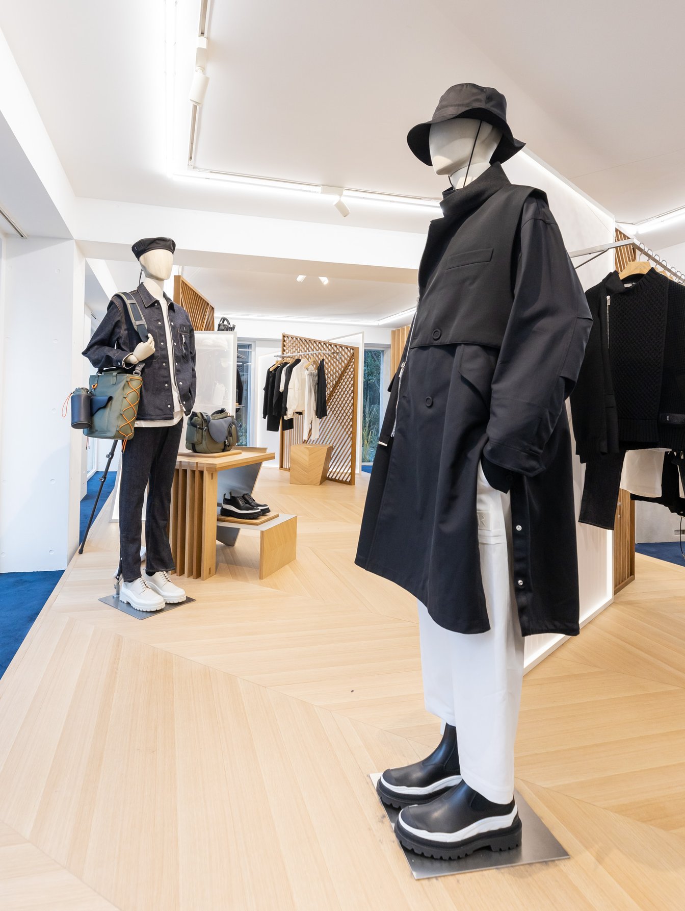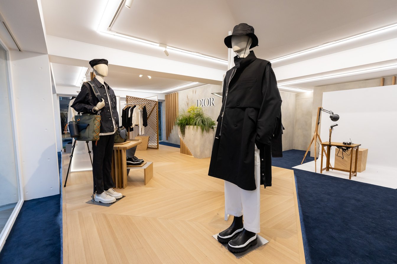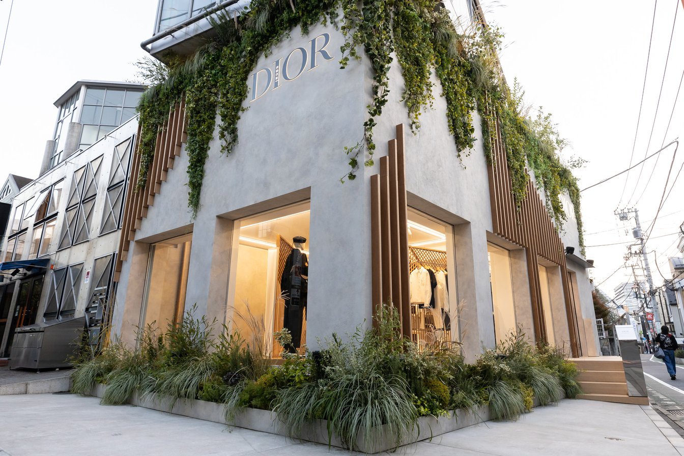 「ディオール & サカイ」ポップアップは神宮前5丁目、ディオール表参道の裏手に位置し、11月4日から11月14日までの11日間のために特別な空間を用意。コンクリートに木材や草花を組み合わせるなど、カプセルコレクションのコンセプト「二元性」をインテリアデザインにも取り入れている。