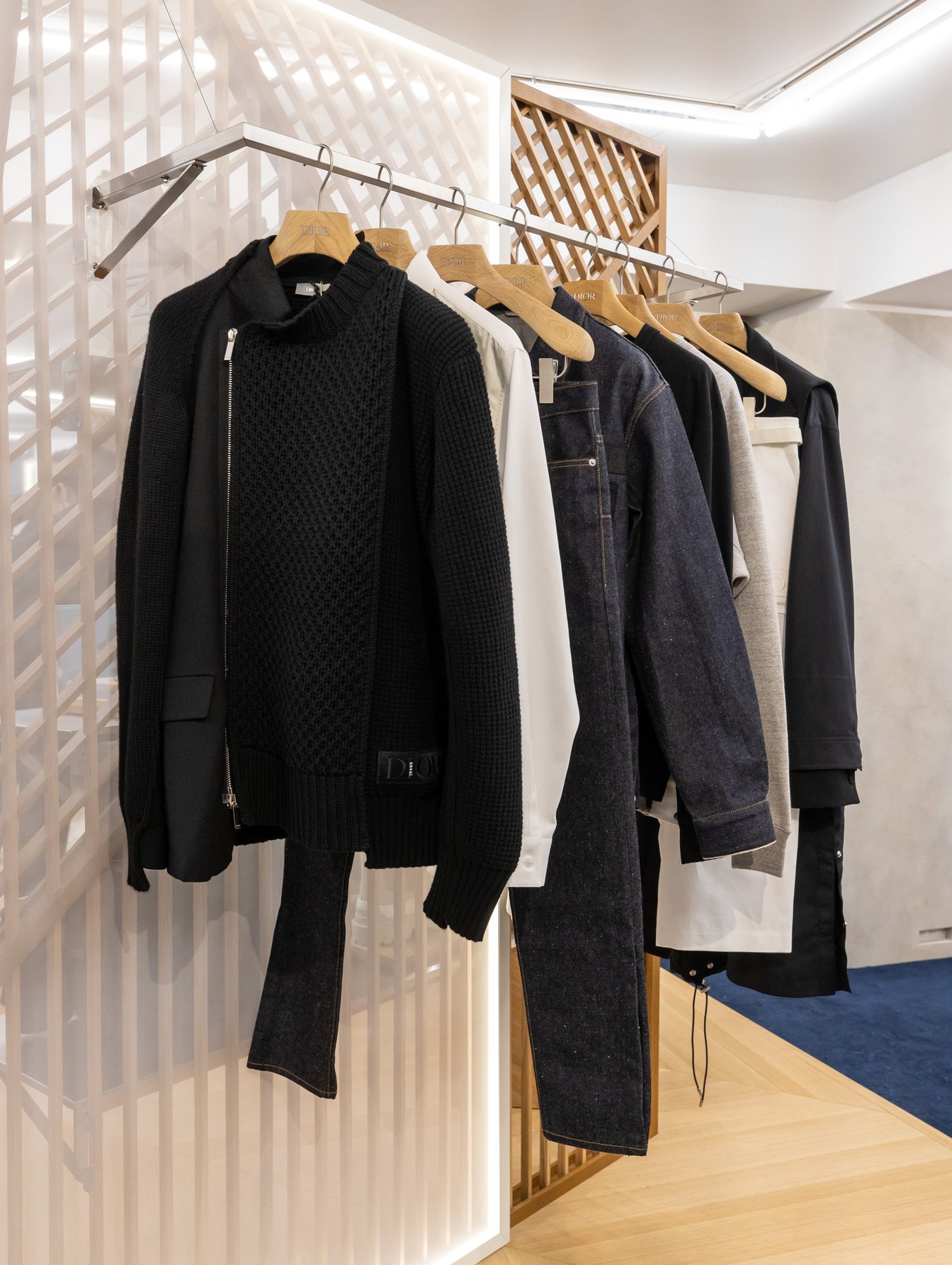 「今年は仕事で挑戦することが多かったので、ファッションでも普段着ない色を着てみたり、色々なことに挑戦したい」と話す横浜は、異なる2着をドッキングしたようなデザインのロングコートや、美しい刺繍が施されたニットなどを次々と手に取って試着。ディオールならではのテーラードやクチュールの技術と、サカイならではのスポーツやミリタリーといった専門性のハイブリッドを、着心地とともに確かめた。