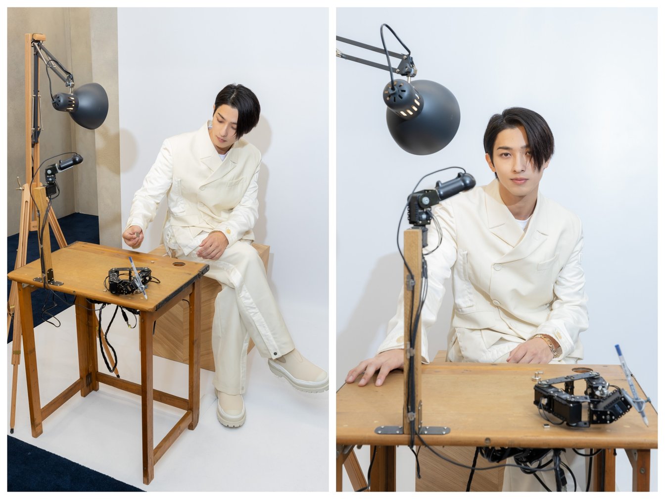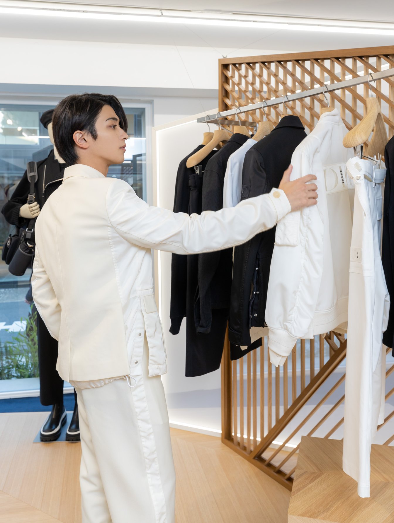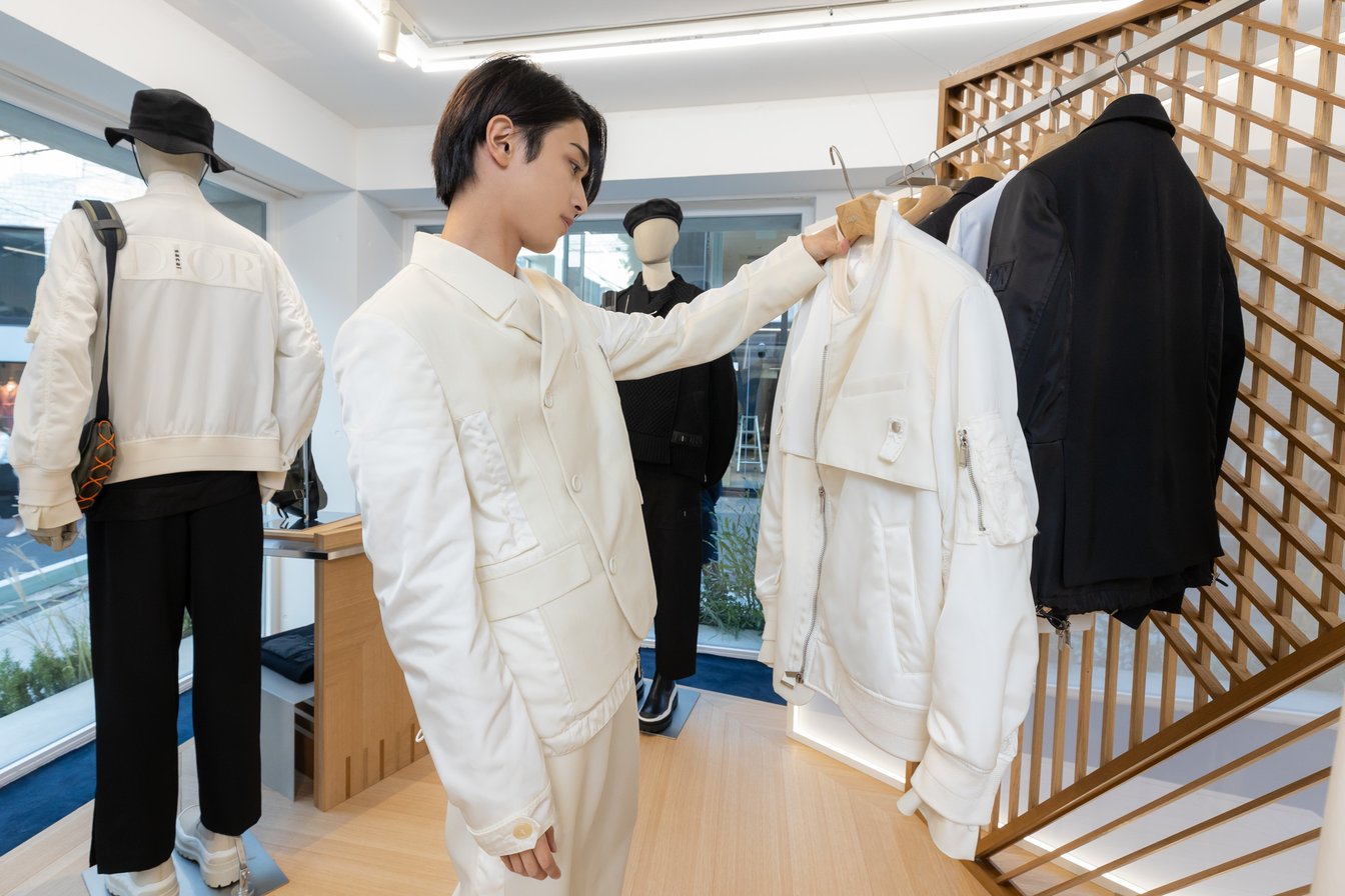 ドラマ「着飾る恋には理由があって」では自由気ままな料理人、来年公開の映画「嘘喰い」では裏社会に生きるギャンブラーと、役柄によってガラリと異なる姿を見せる俳優 横浜流星。「ディオール(DIOR)」のジャパン アンバサダーとしての顔も持つハイブリッドな横浜が11月2日、注目コラボ「ディオール & サカイ」のポップアップに、オープンに先駆けて訪れた。身につけているのは、自身で選んだというピュアなホワイトのセットアップ。店内に足を踏み入れるとともに、2つのブランドの色が混じり合うカプセルコレクションの世界観に染まっていった。